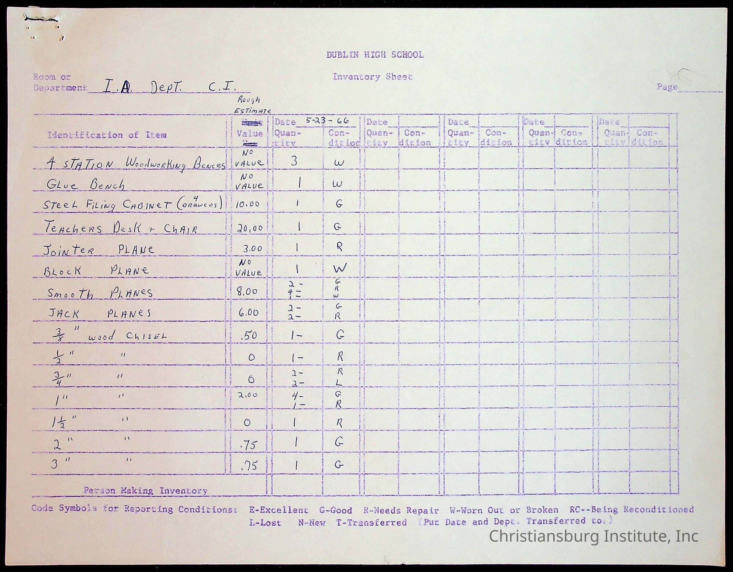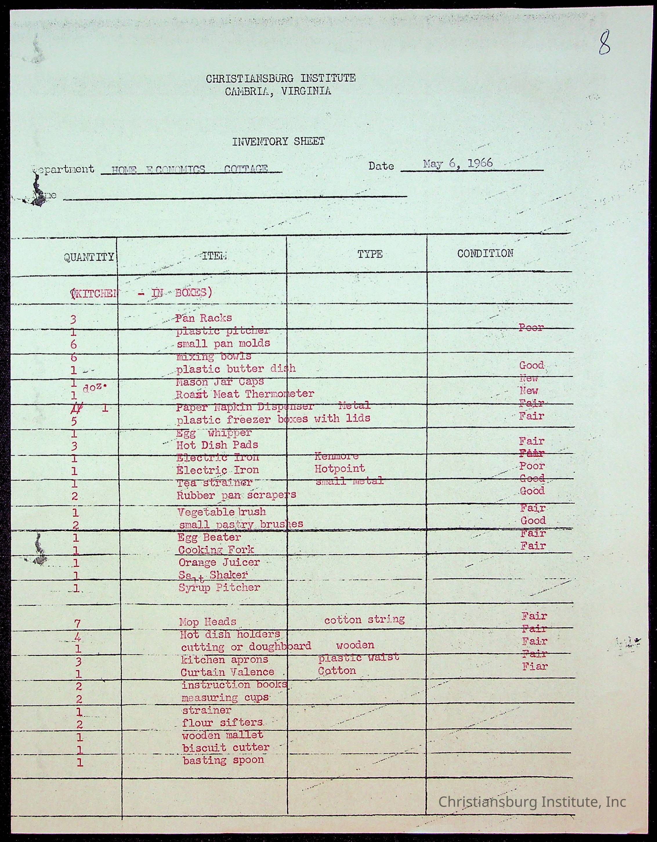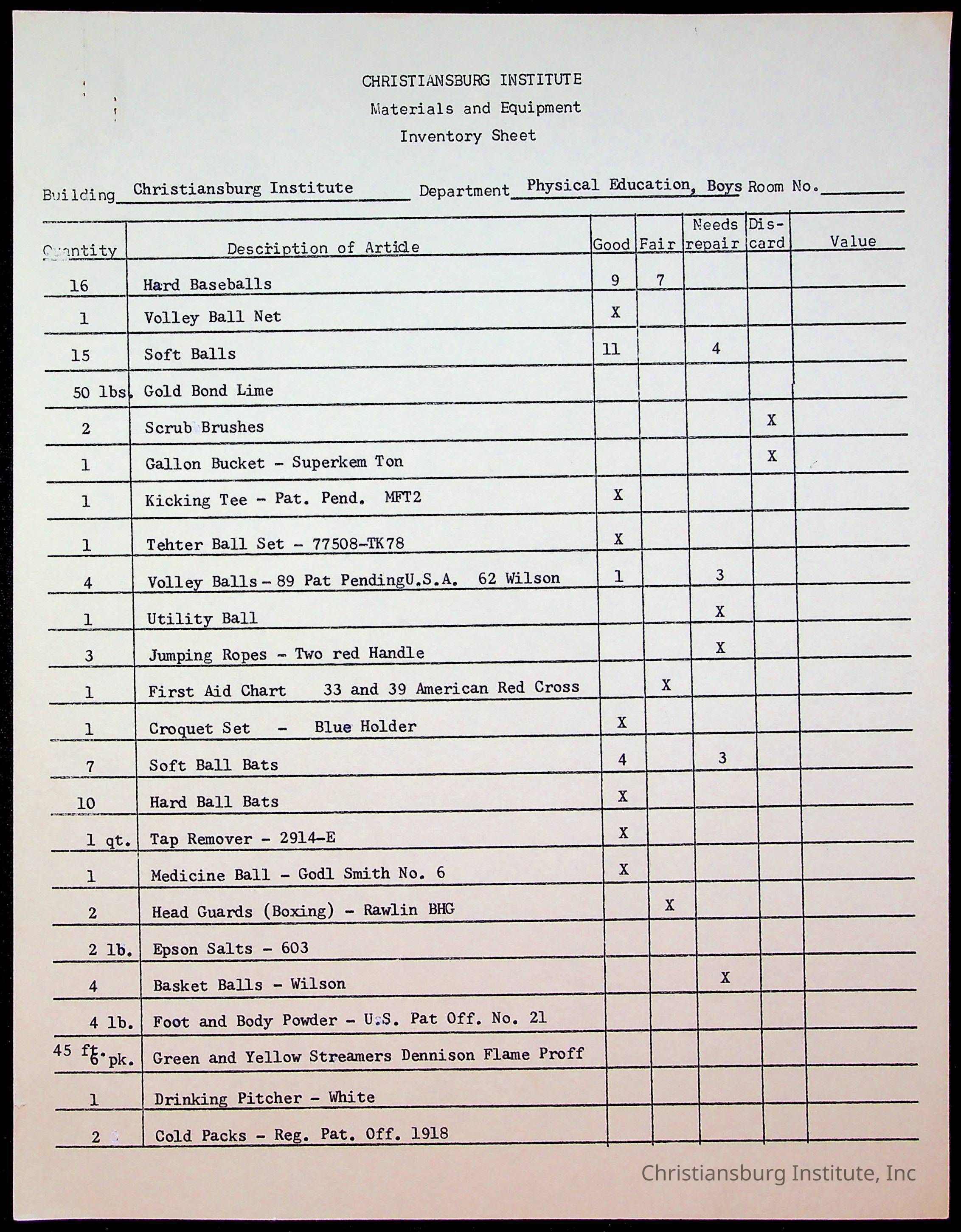 An archive of inventory sheets documenting Christiansburg Institute's inventory in the year 1966.