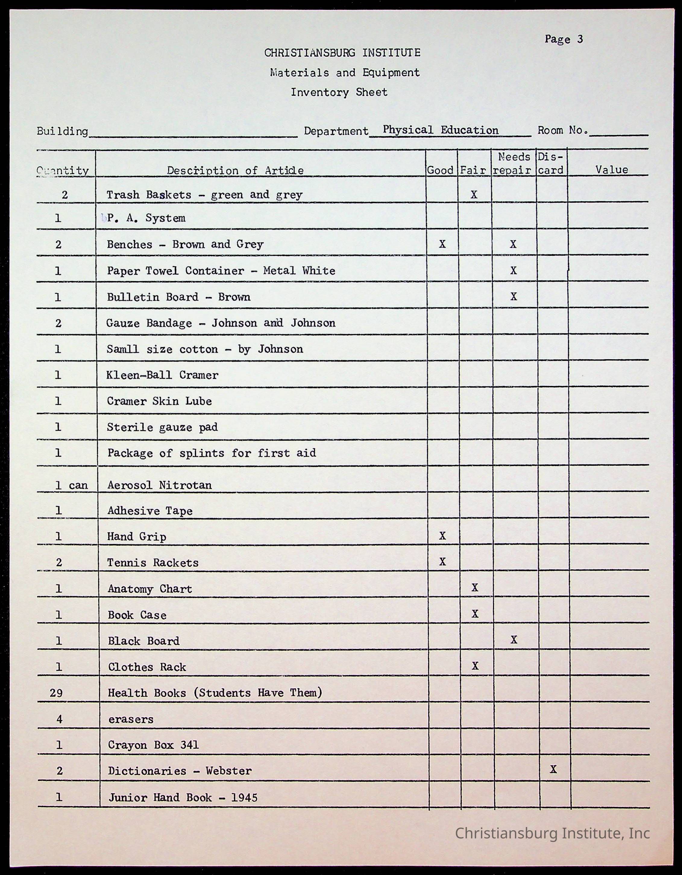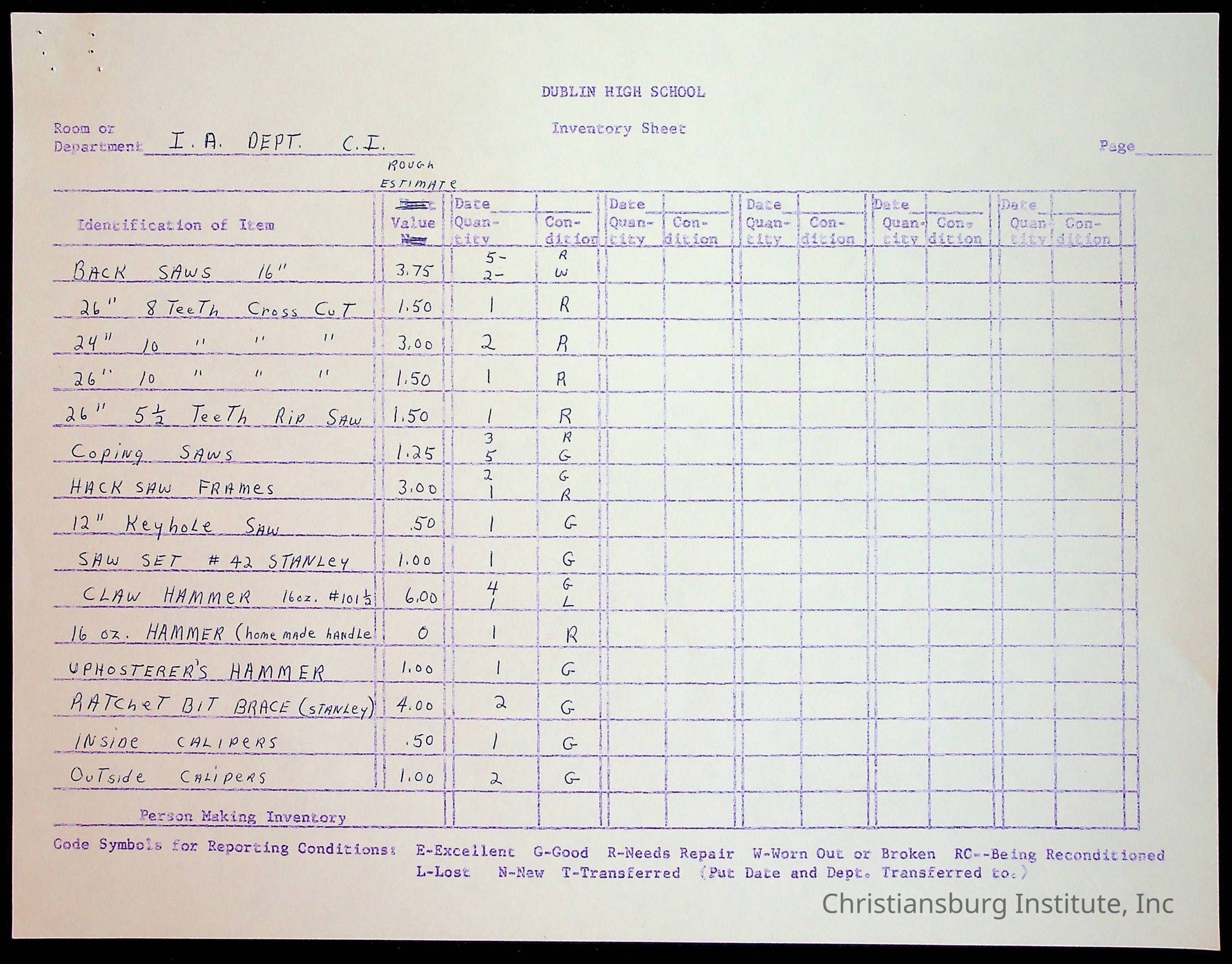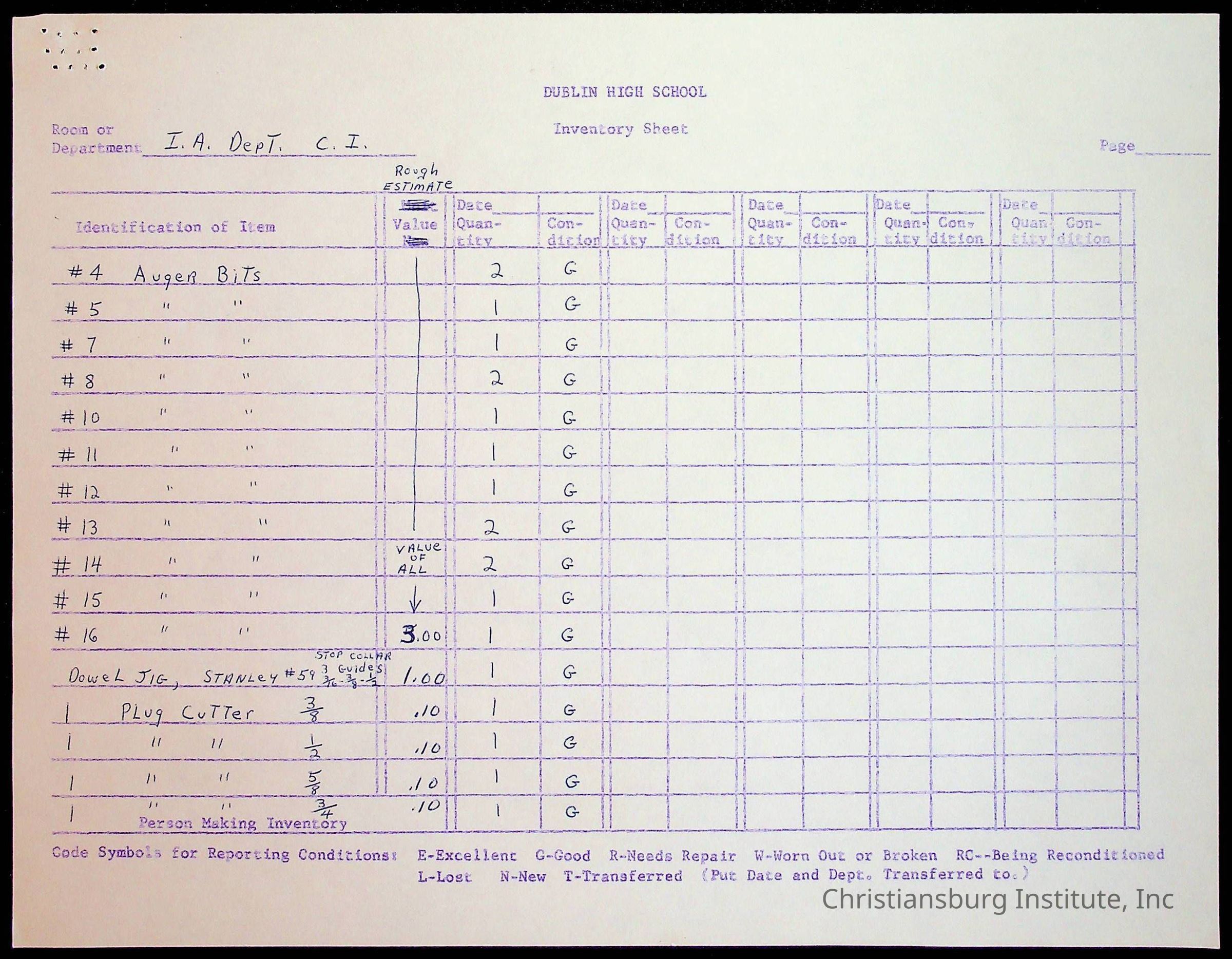 An archive of inventory sheets documenting Christiansburg Institute's inventory in the year 1966.
