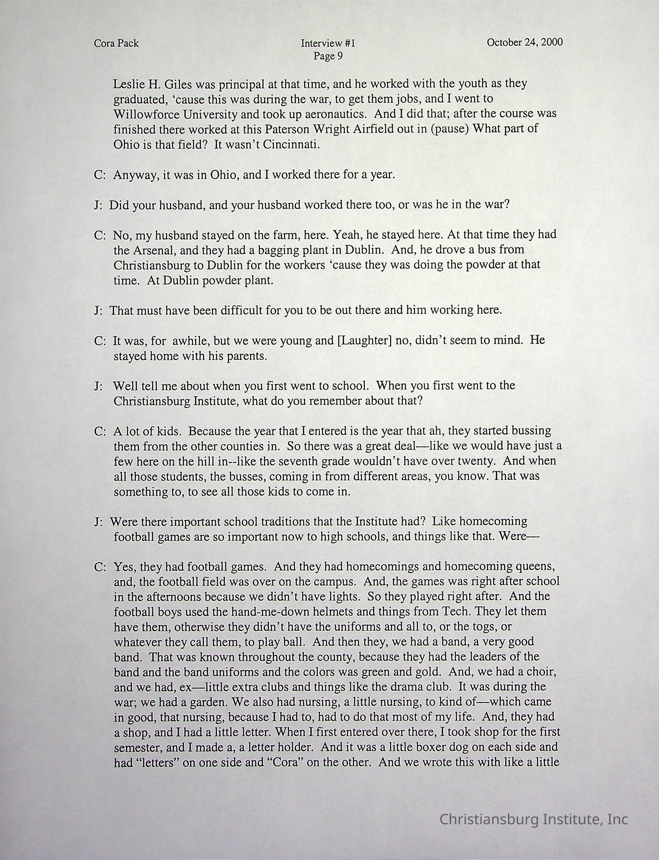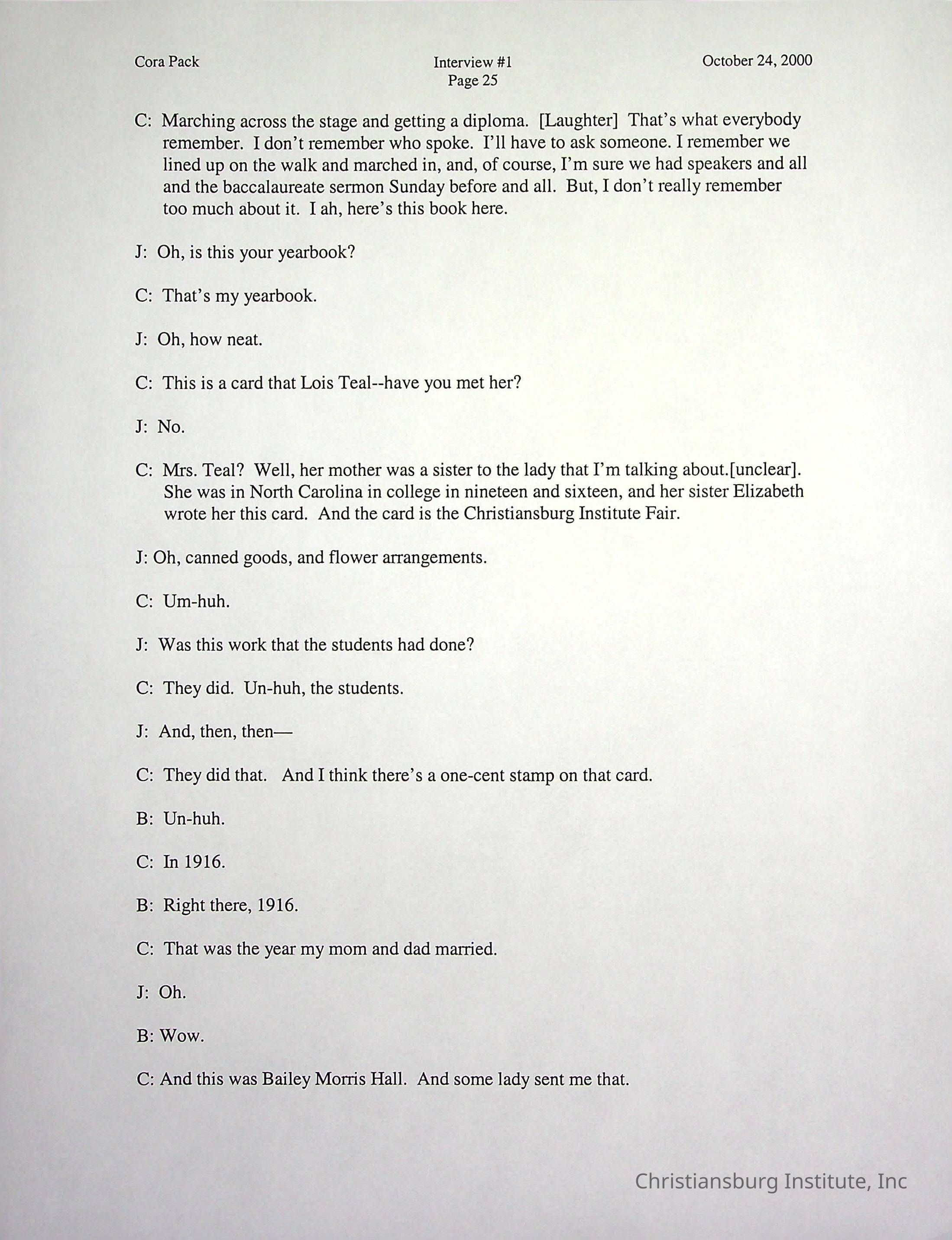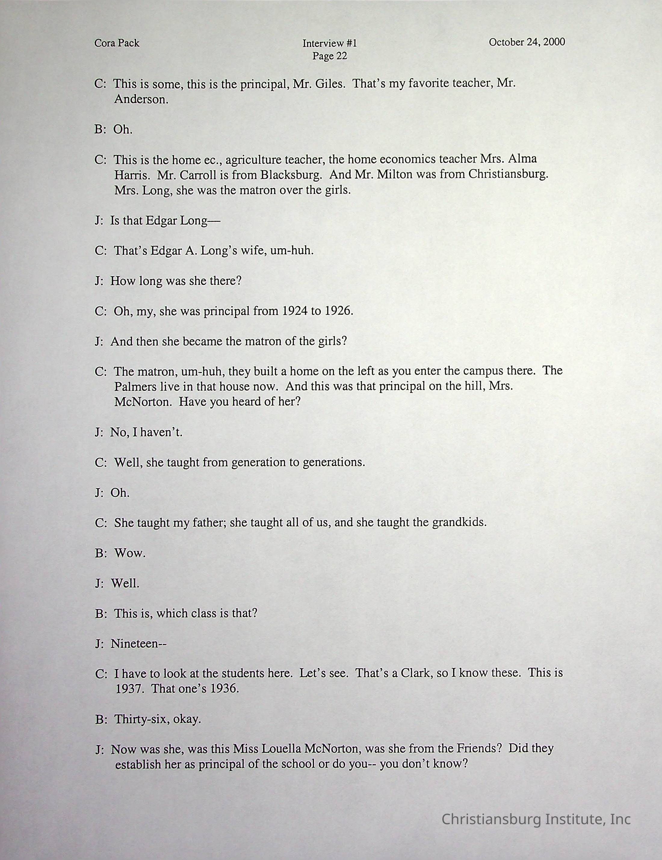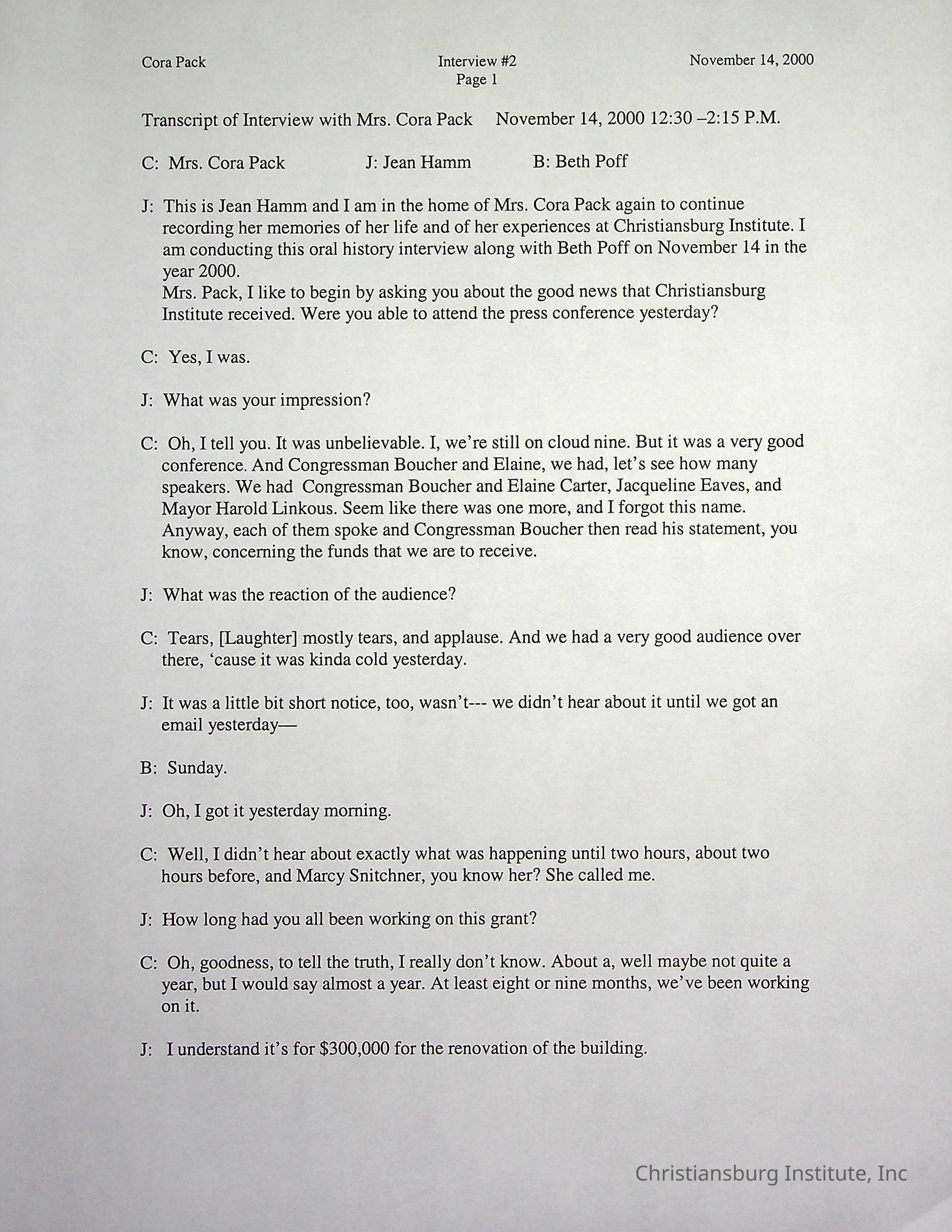 Two oral histories with Christiansburg Institute alumni, Cora Pack conducted by Jean Hamm on October 24th, 2000 and November 14th, 2000.Creator