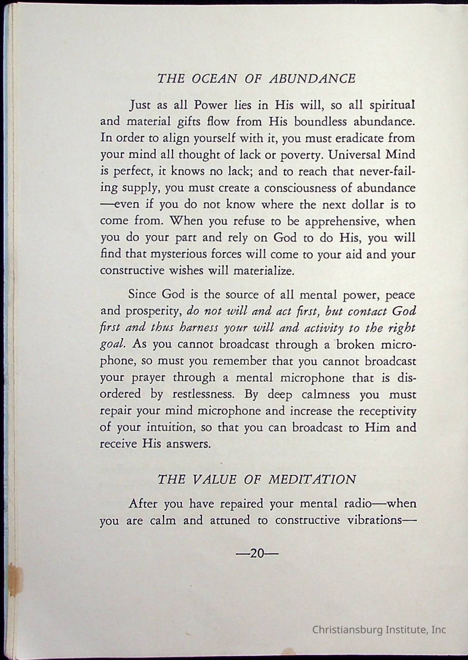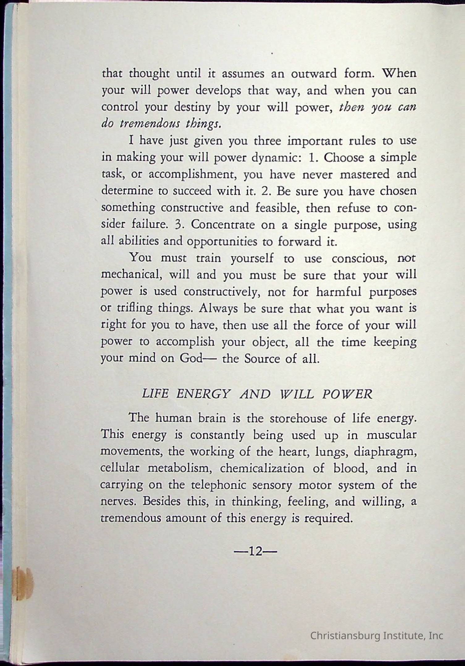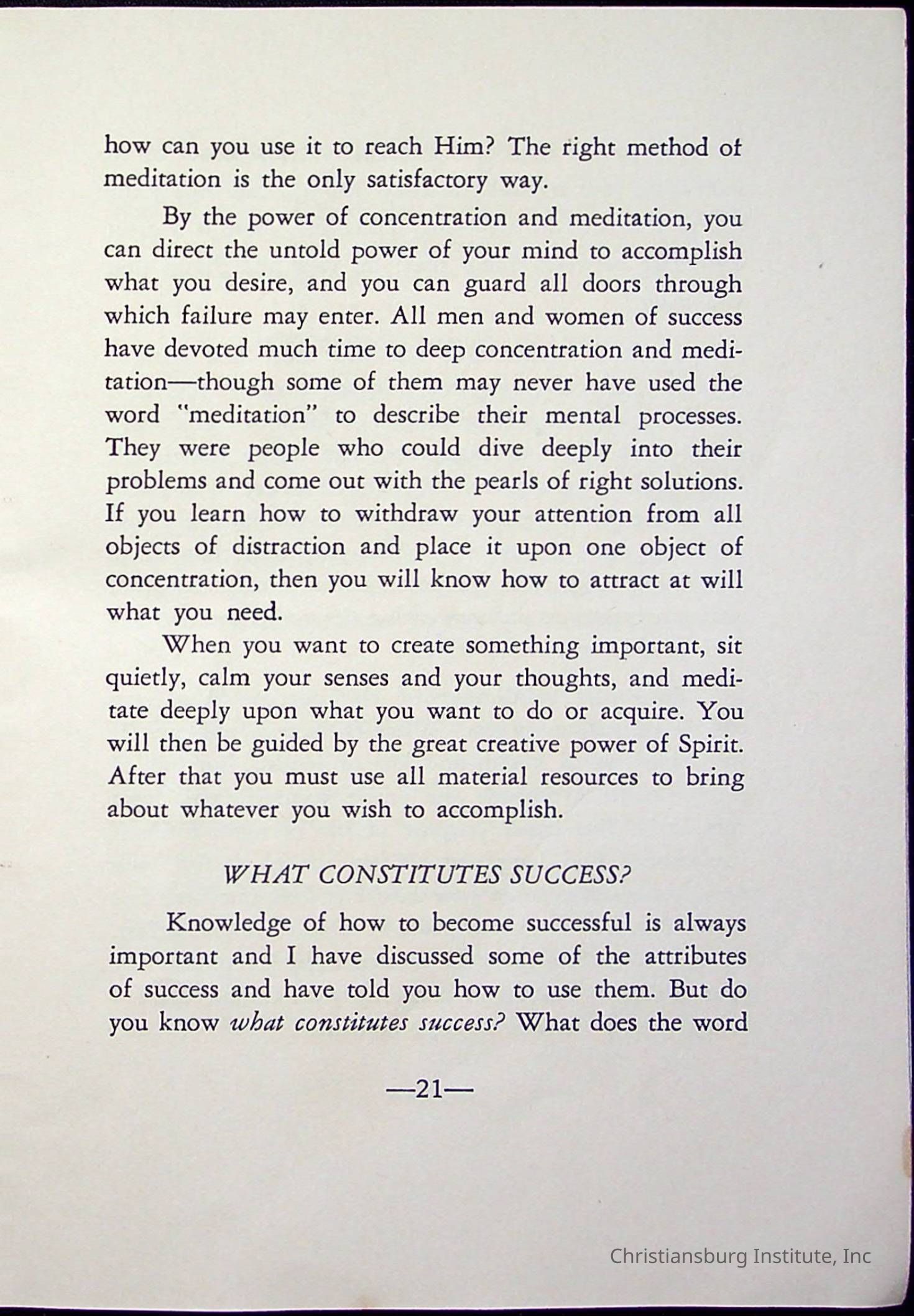 "The Attributes of Success" written by Paramhansa Yogananda published by the Self-Realization Publishing House in 1944. This book was owned by Christiansburg Institute teacher, Viola Charlton.Collection