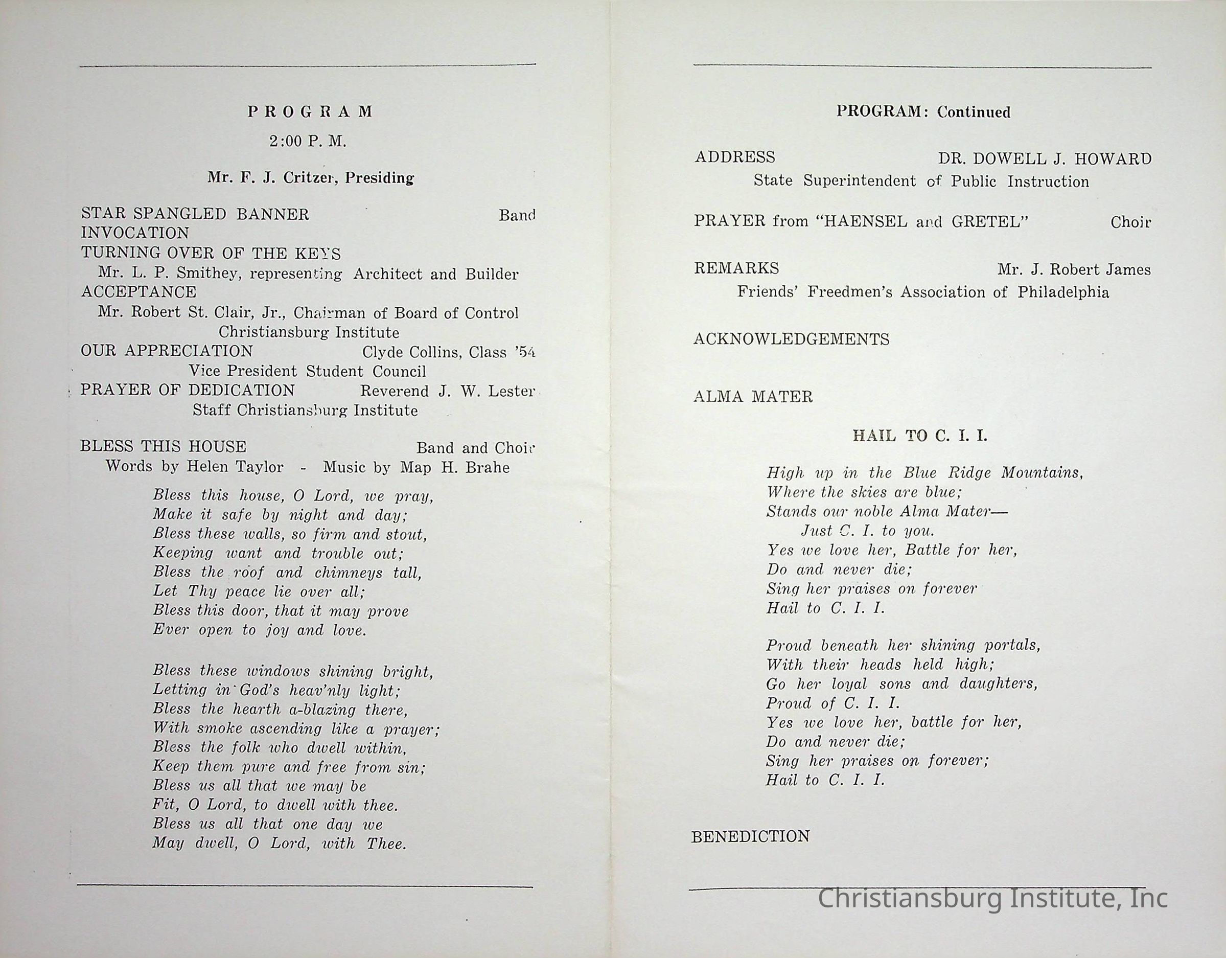 An event program for the Christiansburg Institute Dedication of the J. Henry Scattergood Building on May 18th, 1953. The program lists the order of events for the ceremony, including speeches from Board of Control members Mr. F. J. Critzer and Robert St. Clair, Jr., Friends' Freedmen's Association member J. Robert James, State Superintendent of Public Instruction, Dr. Dowell J. Howard, and C.I. Student Council Vice President, Clyde Collins, Class '54.Collection