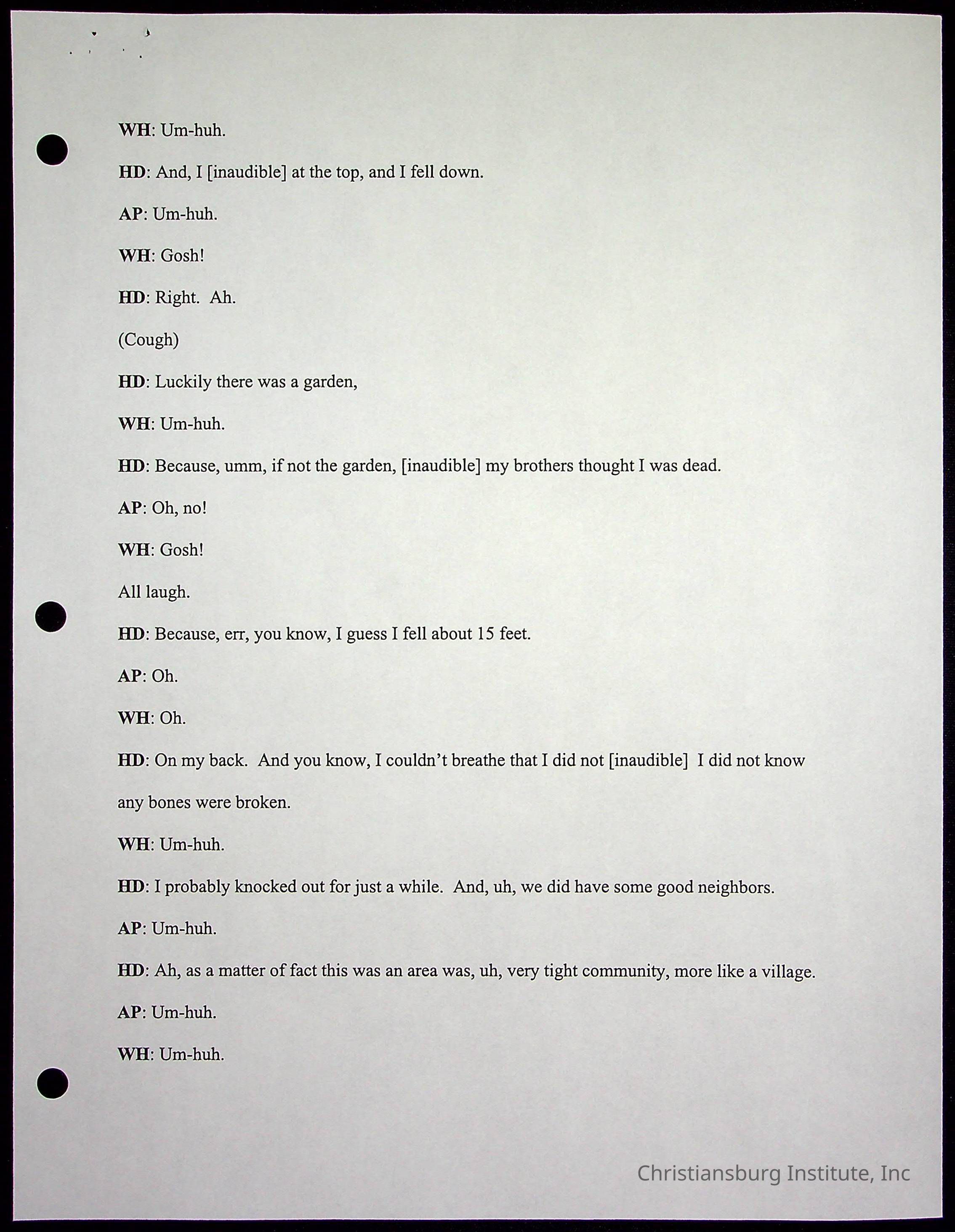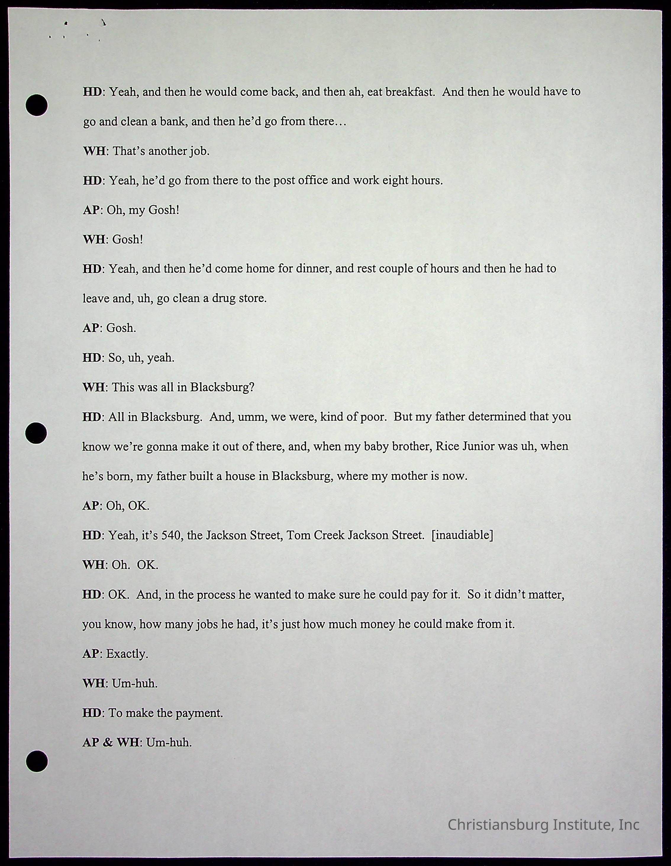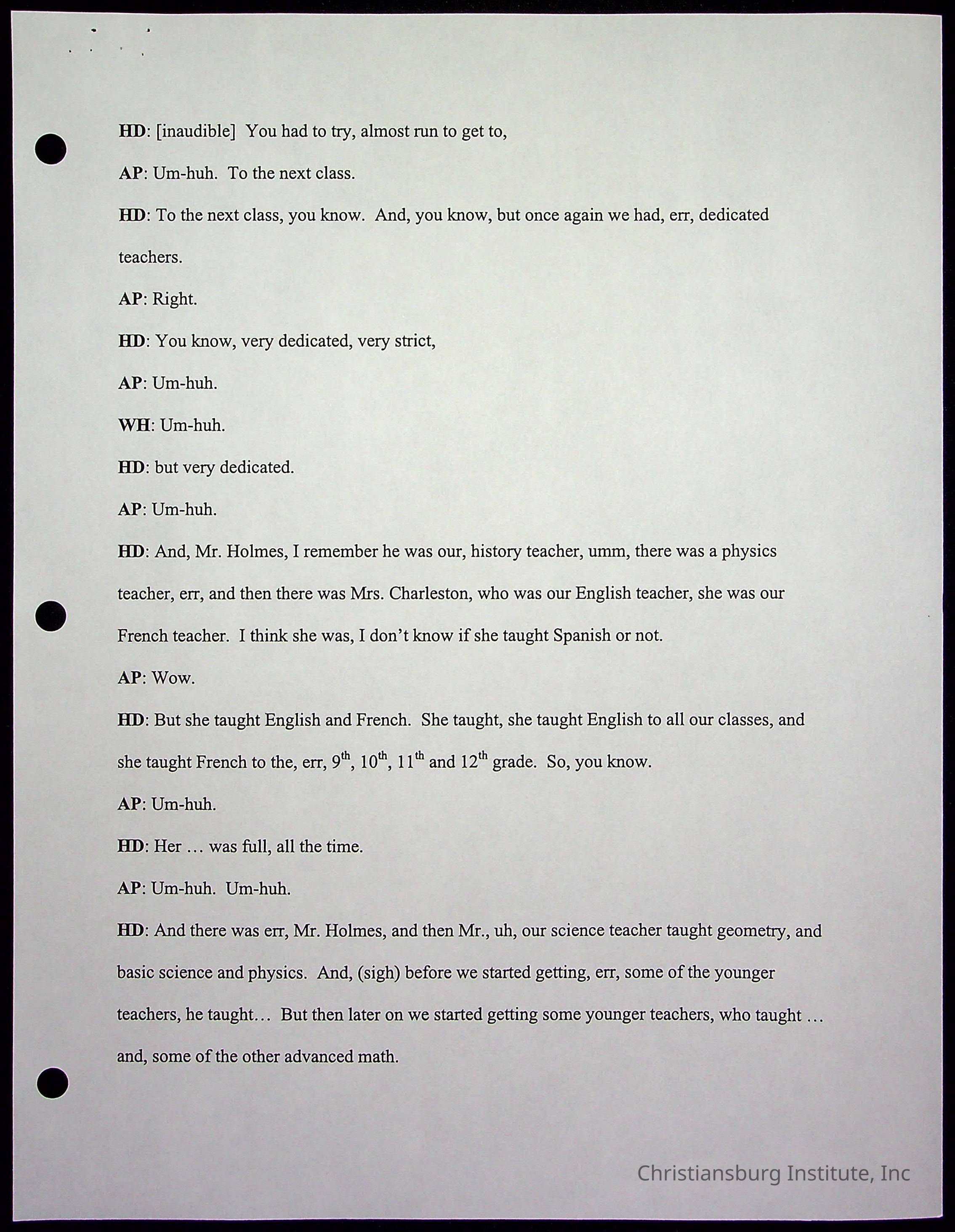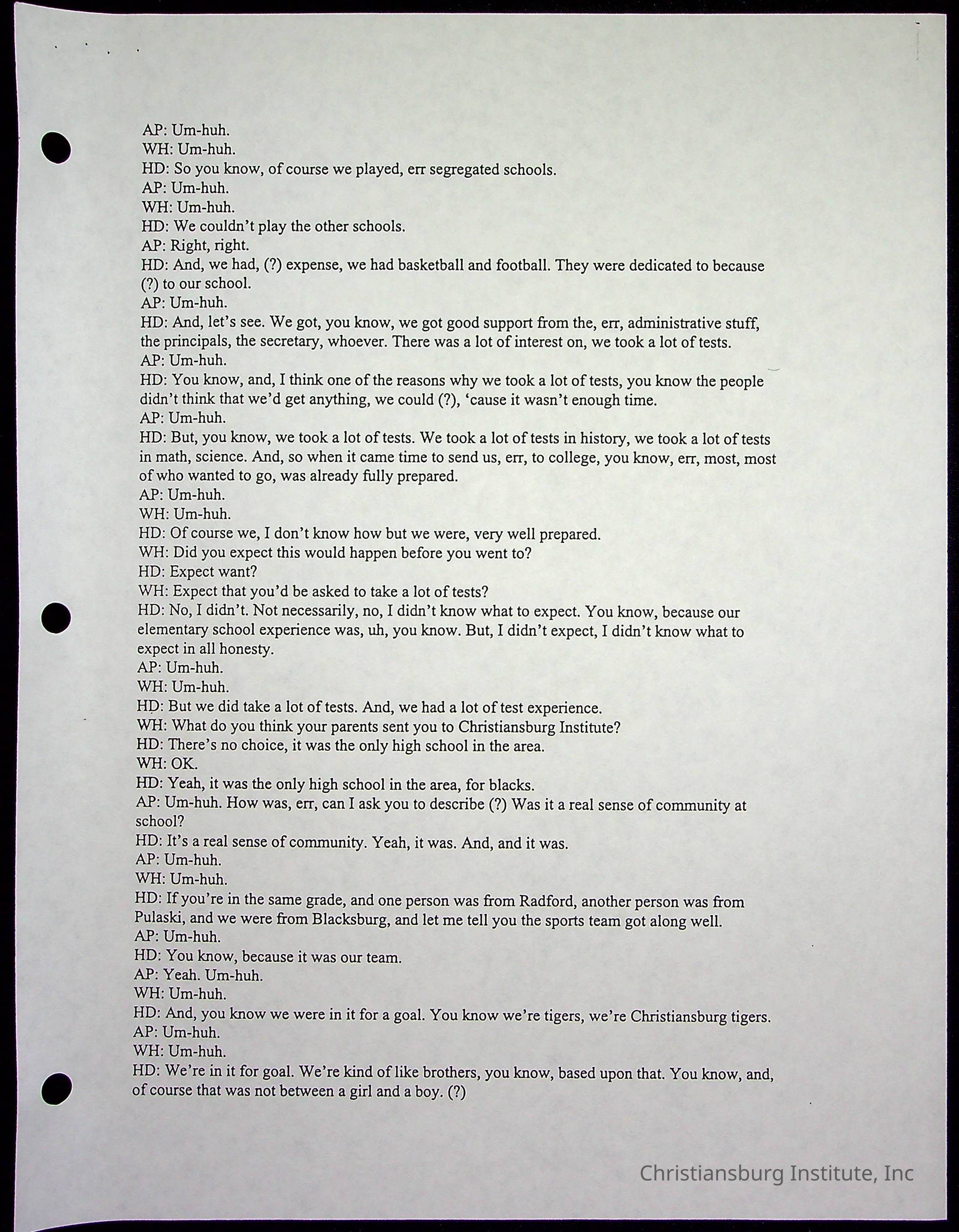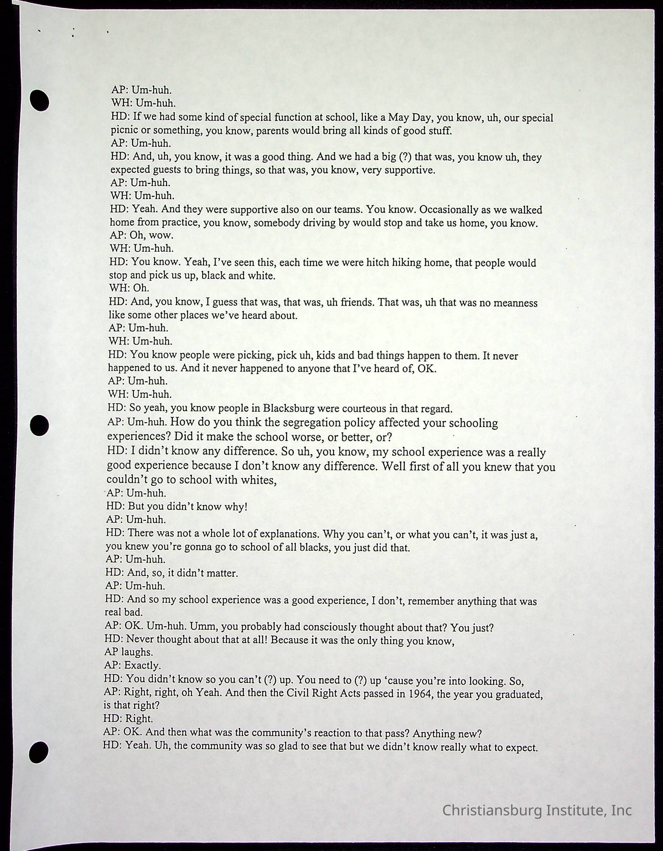An oral history with Christiansburg Institute alumni, Herald Dobbins conducted by Amy Polishuk and Wei Huang on April 7th, 2001.
