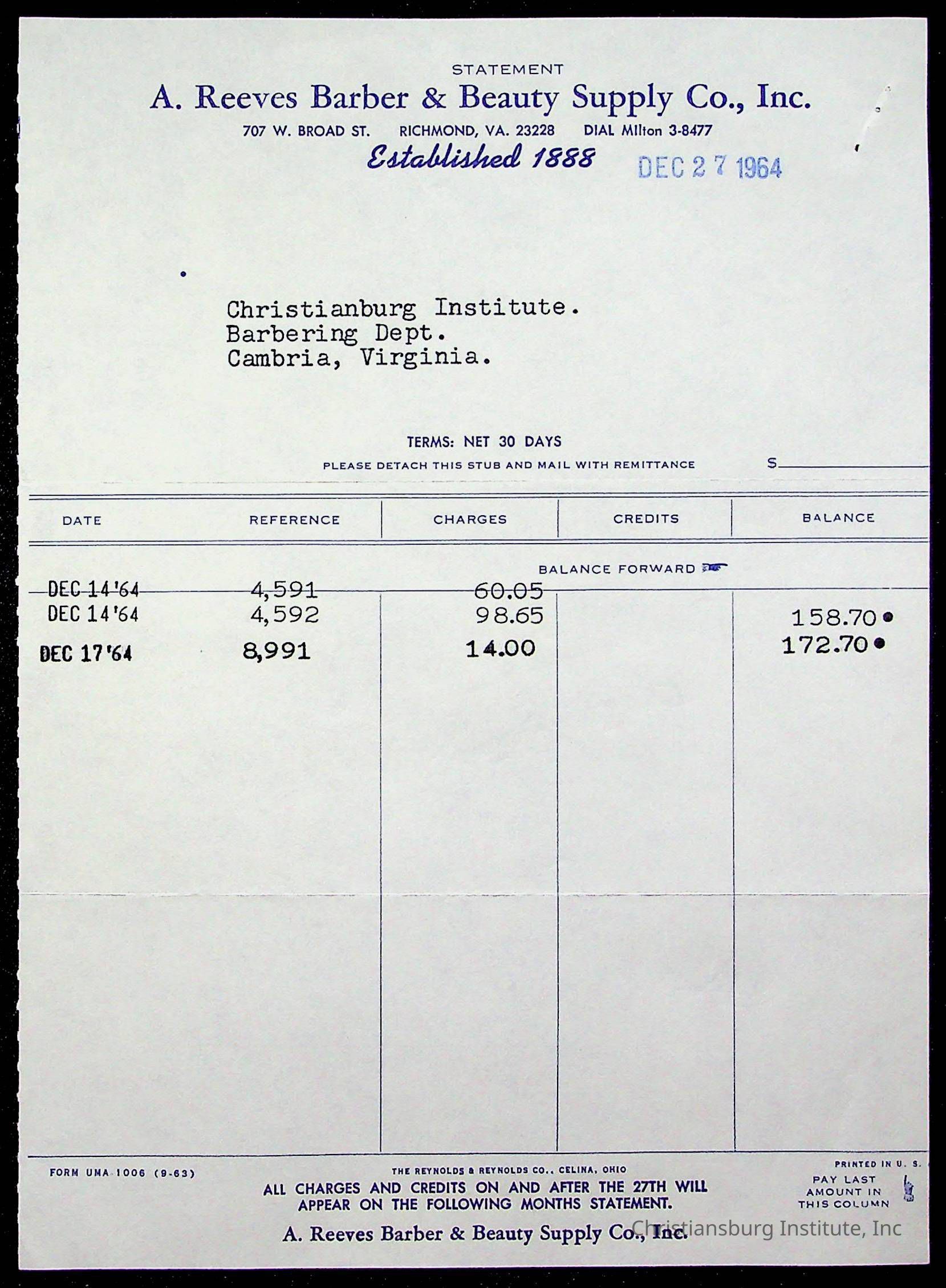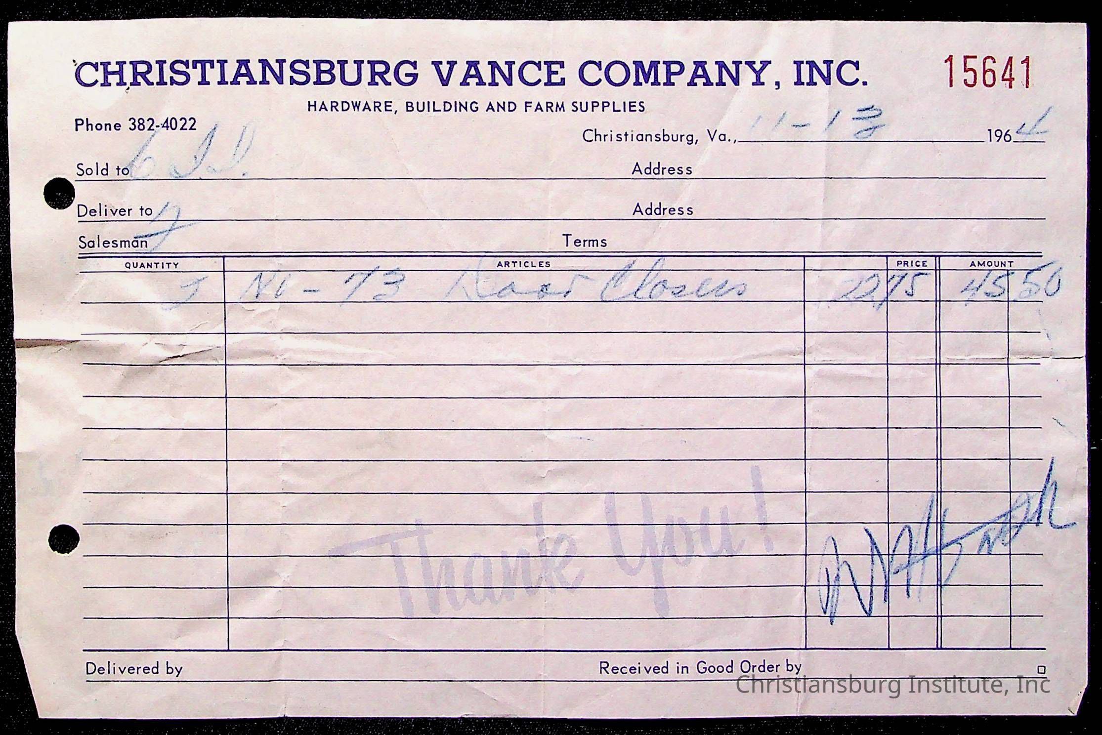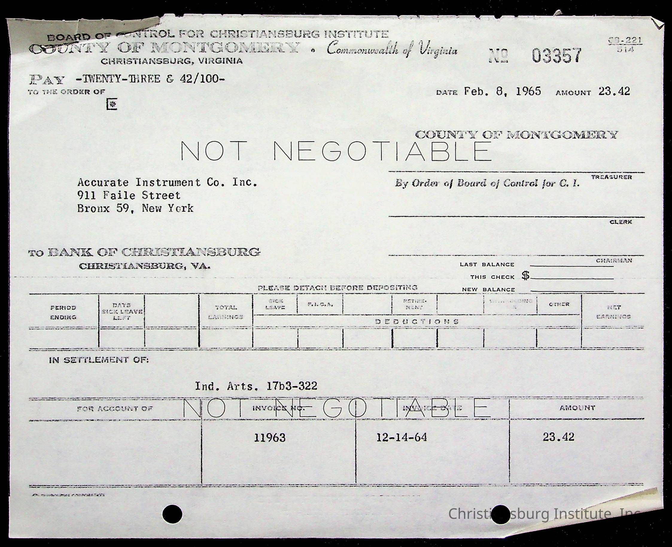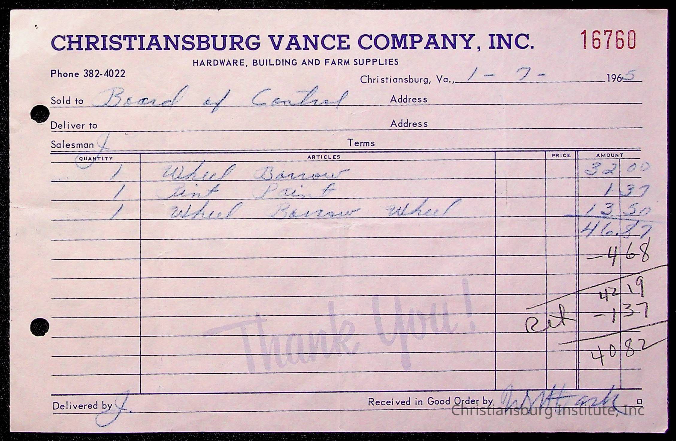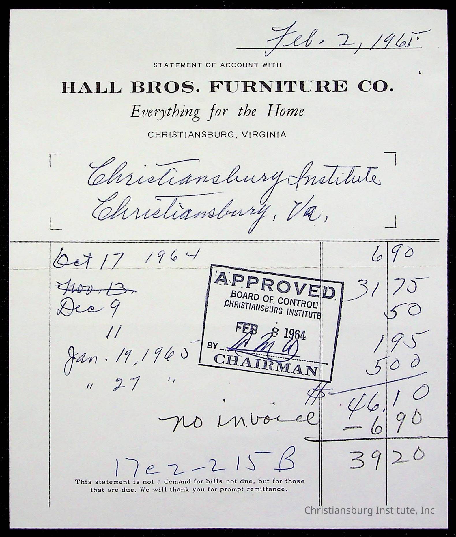 An archive of bills and receipts for Christiansburg Institute from February of 1965.