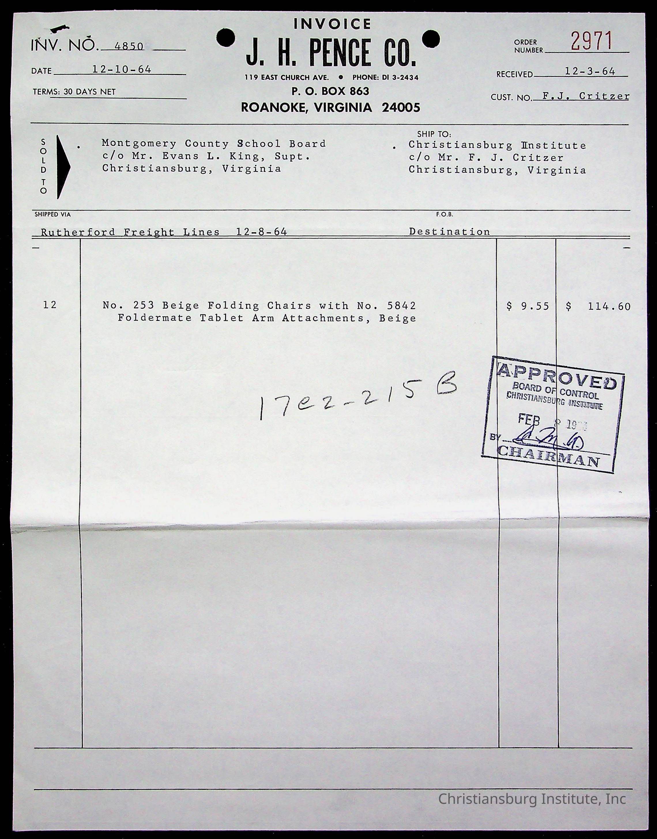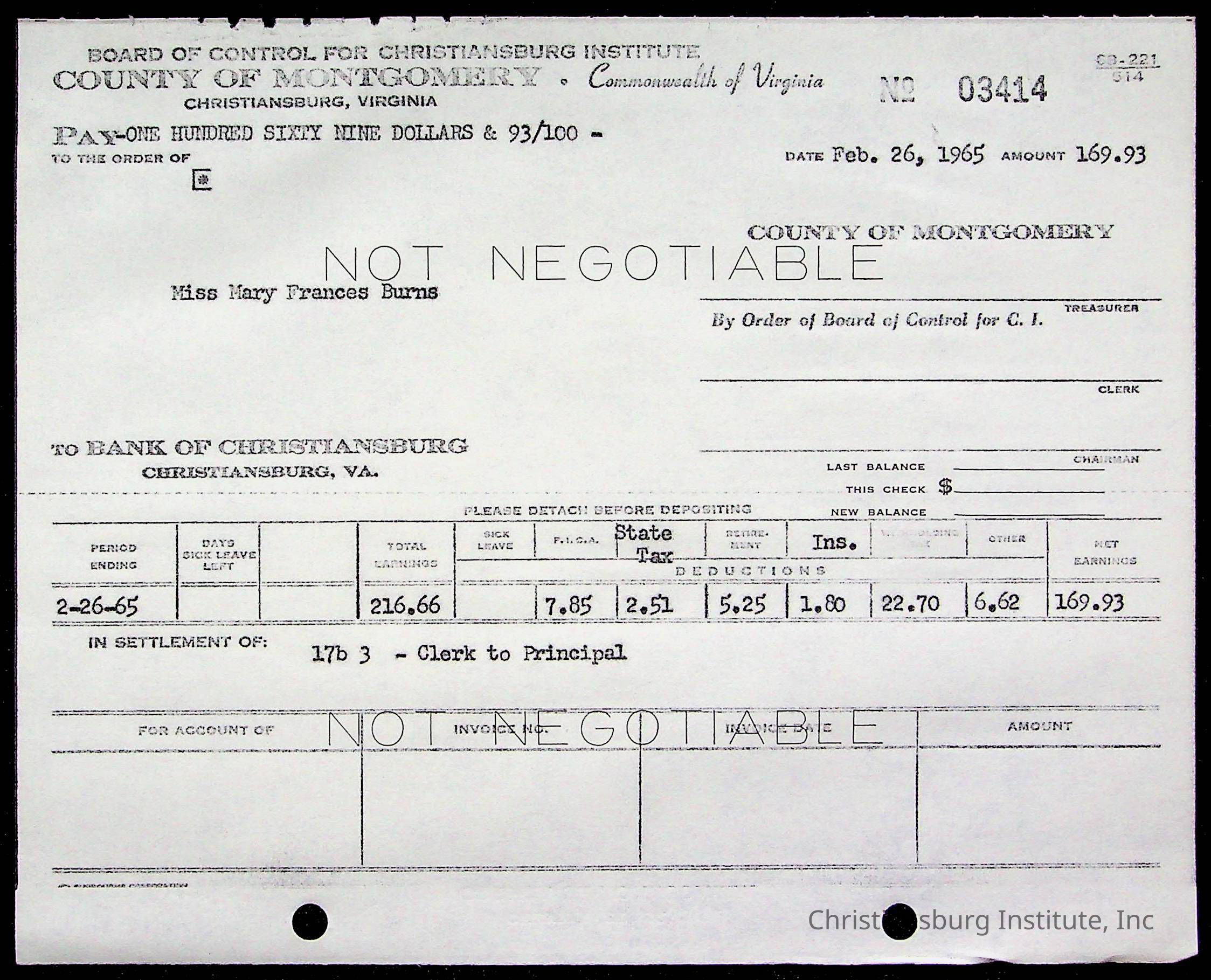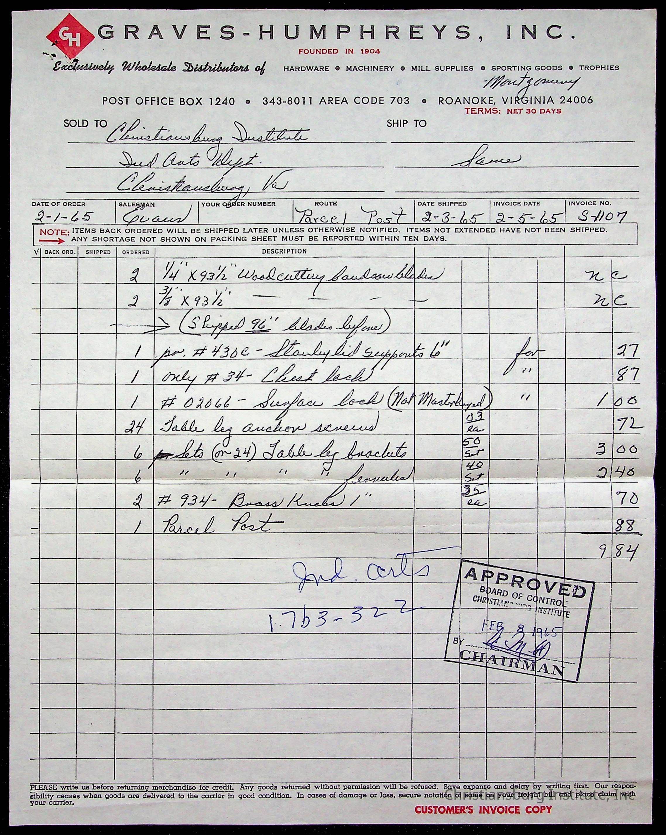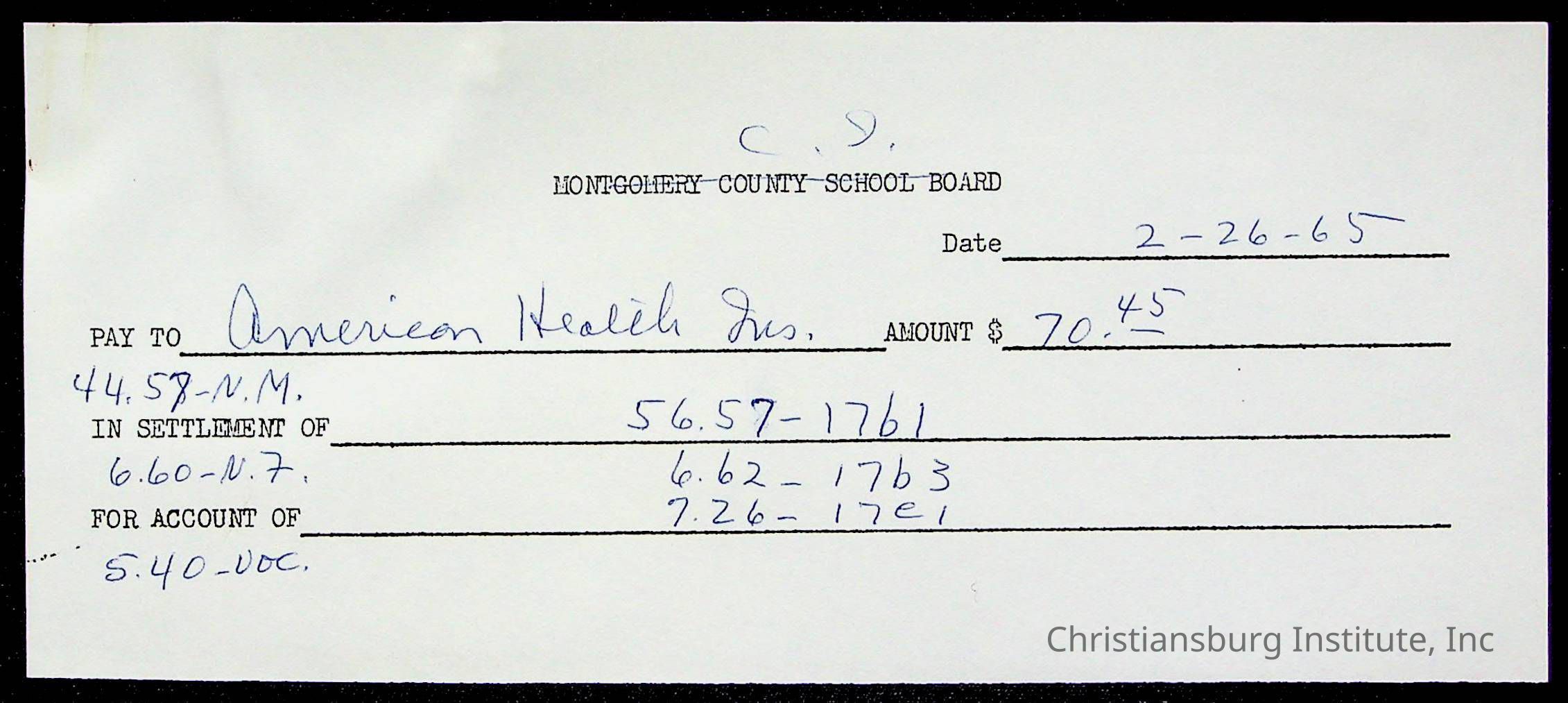 An archive of bills and receipts for Christiansburg Institute from February of 1965.