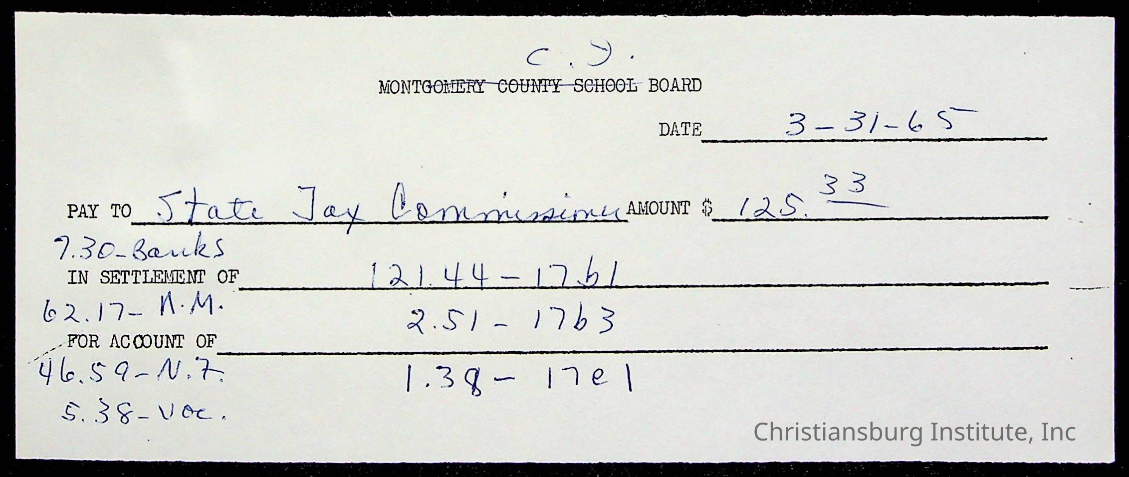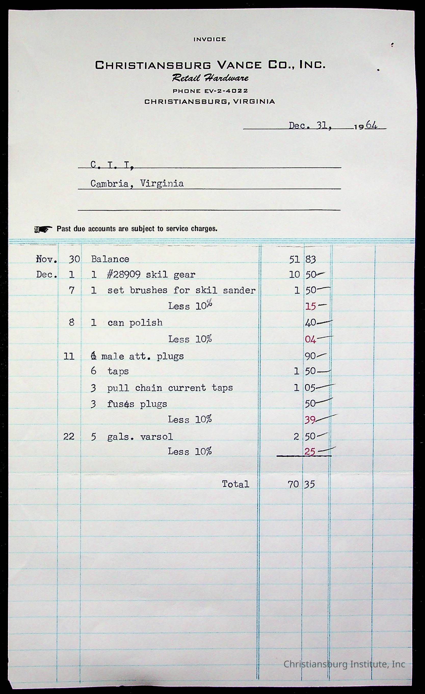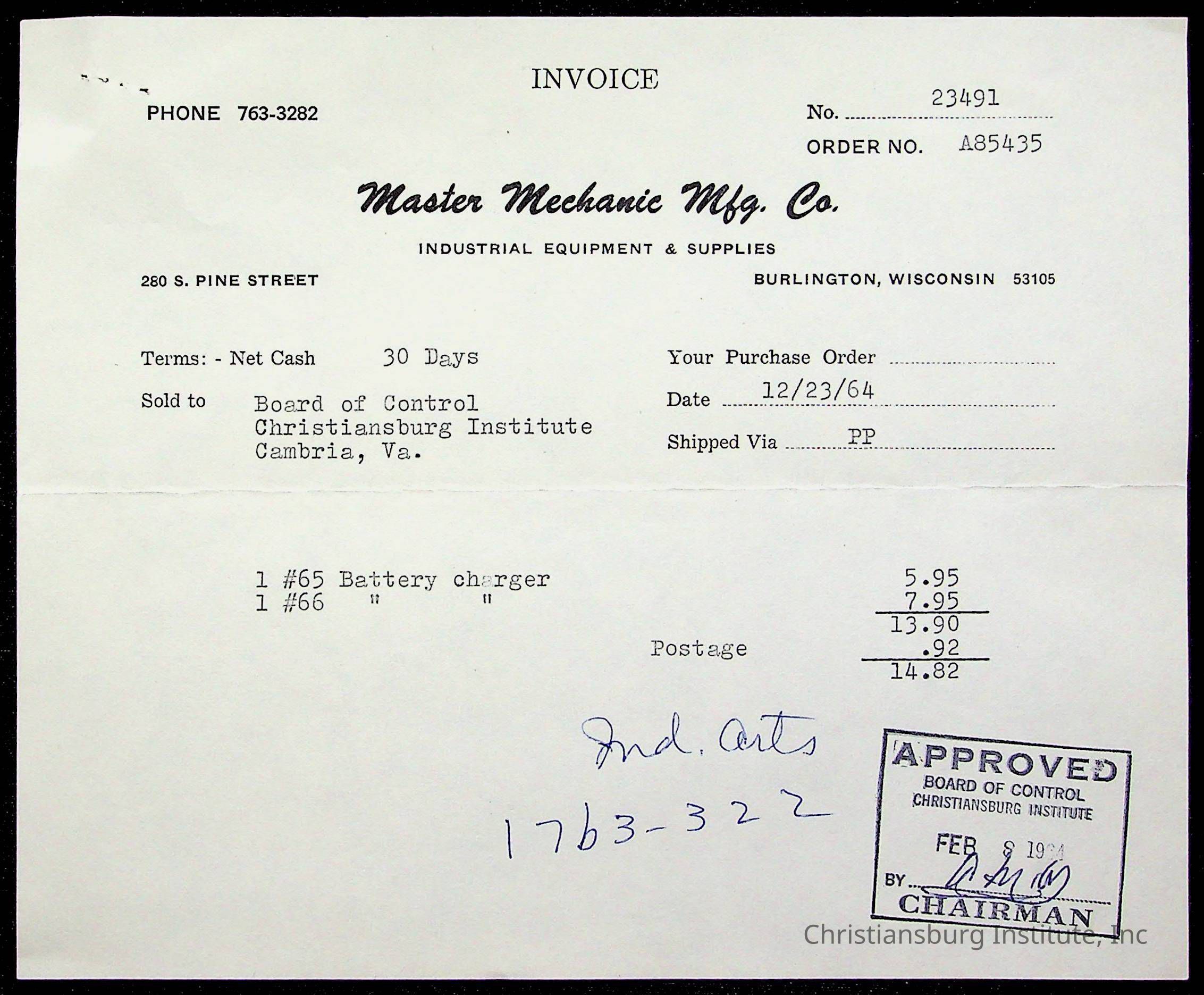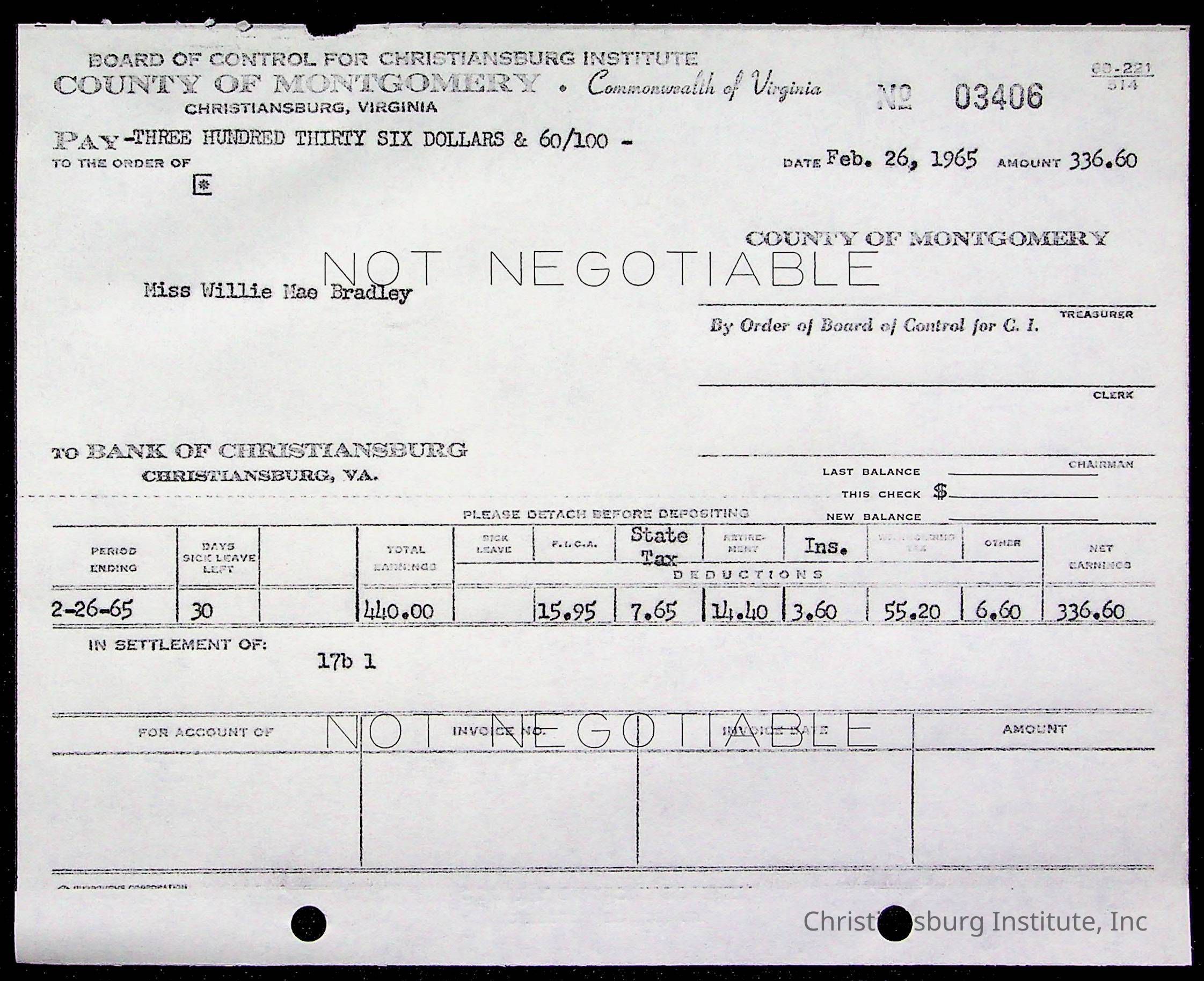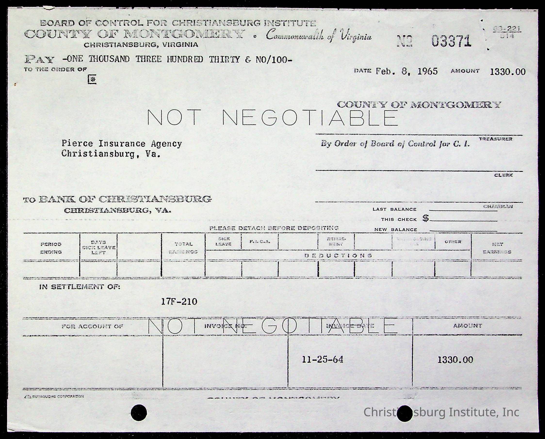 An archive of bills and receipts for Christiansburg Institute from February of 1965.