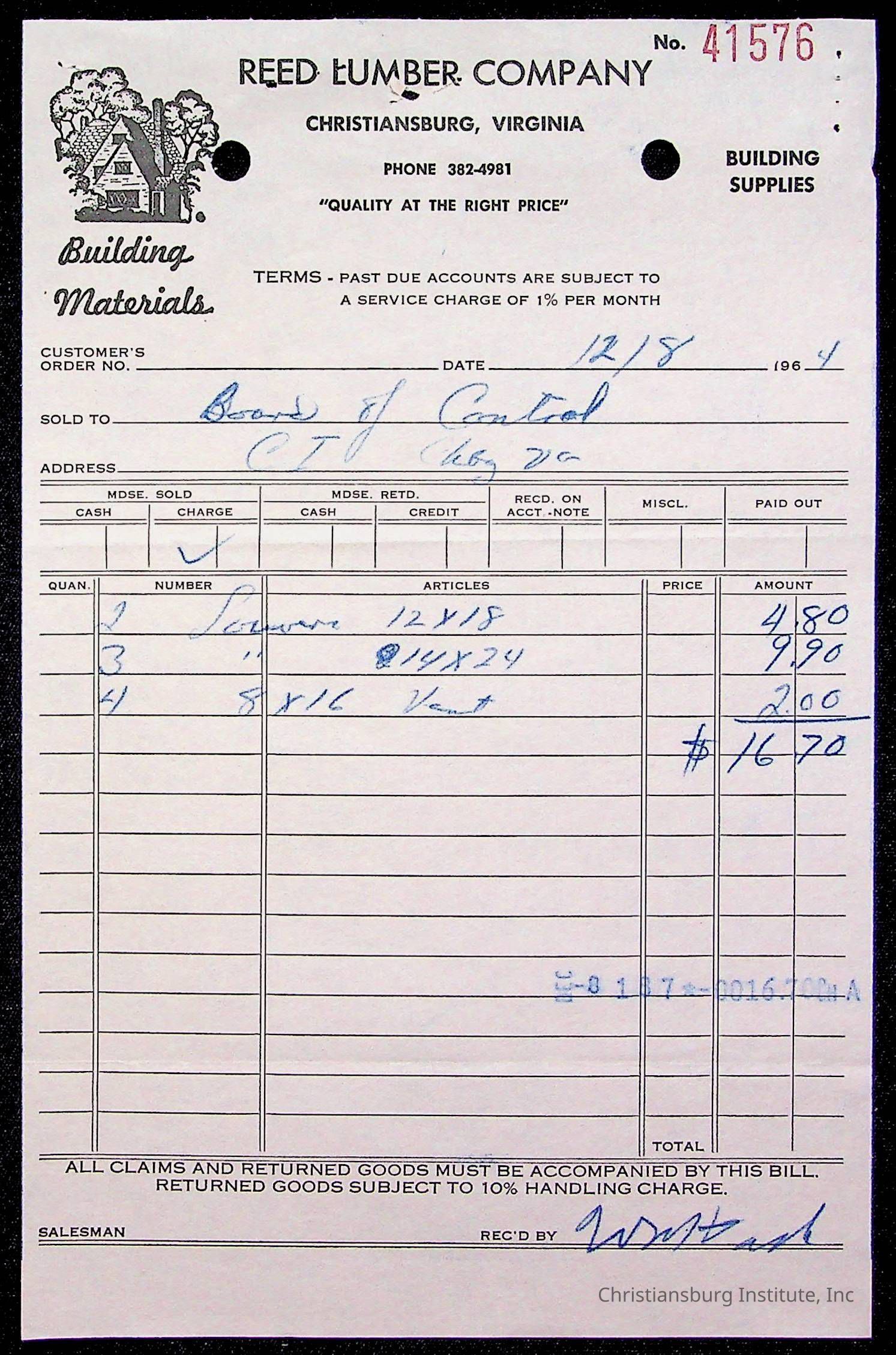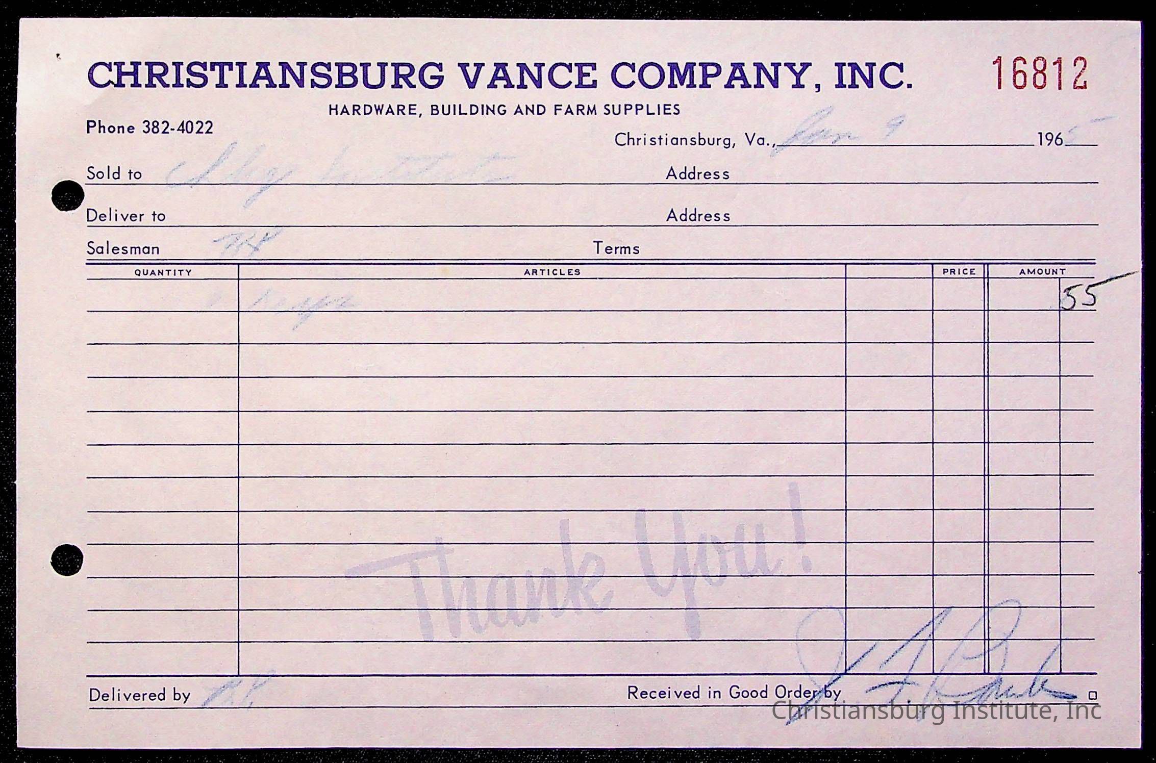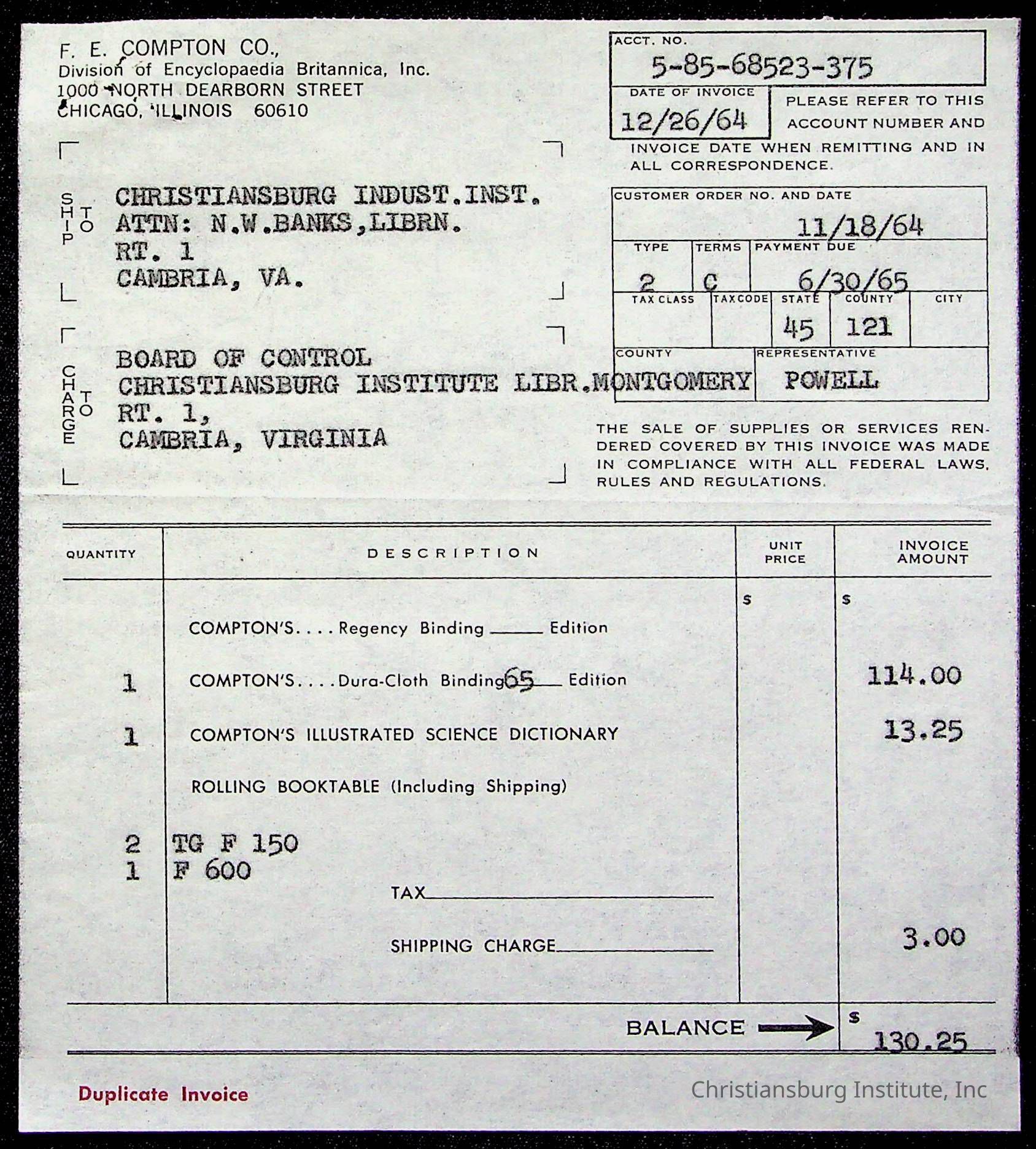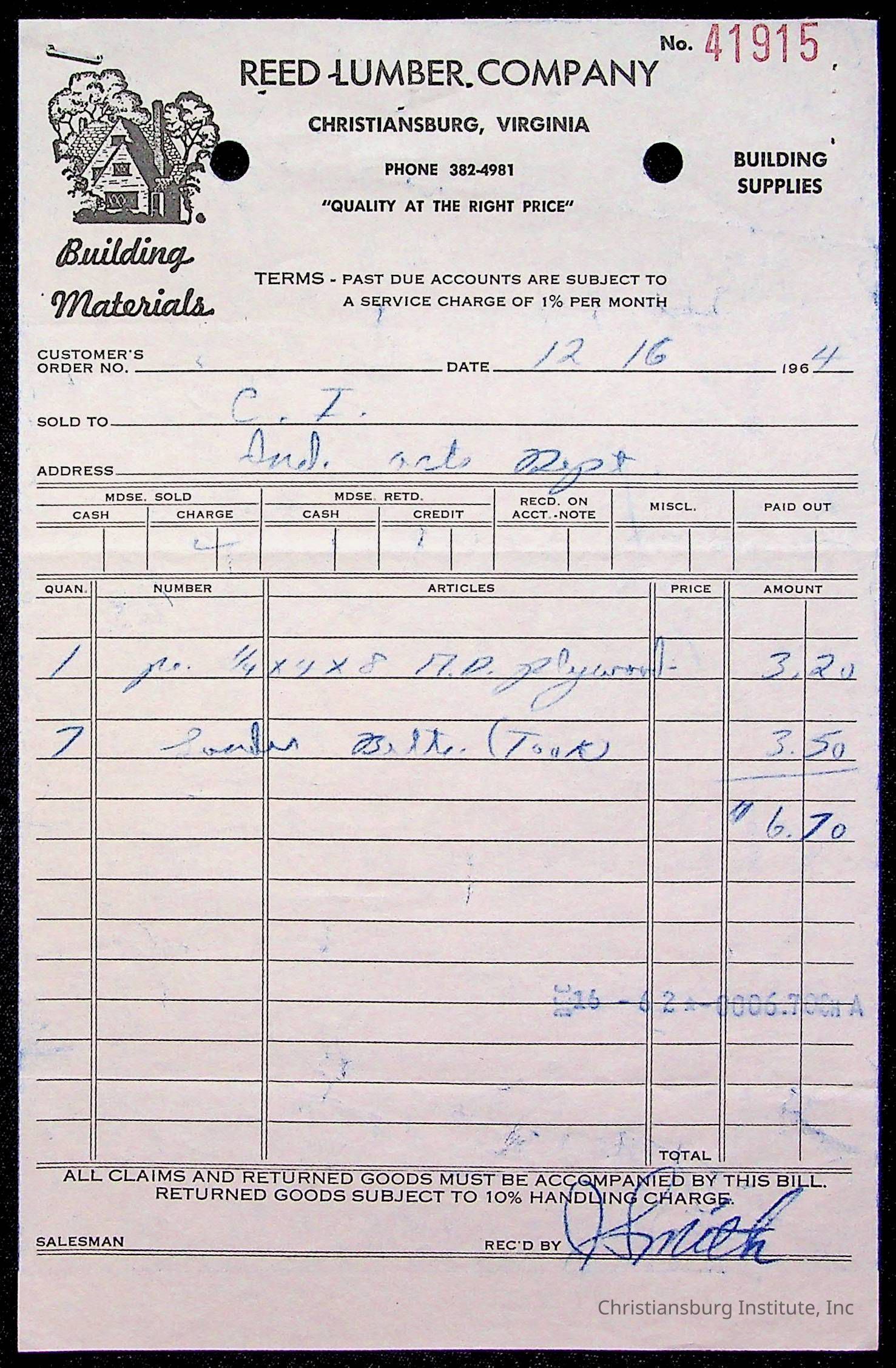 An archive of bills and receipts for Christiansburg Institute from February of 1965.