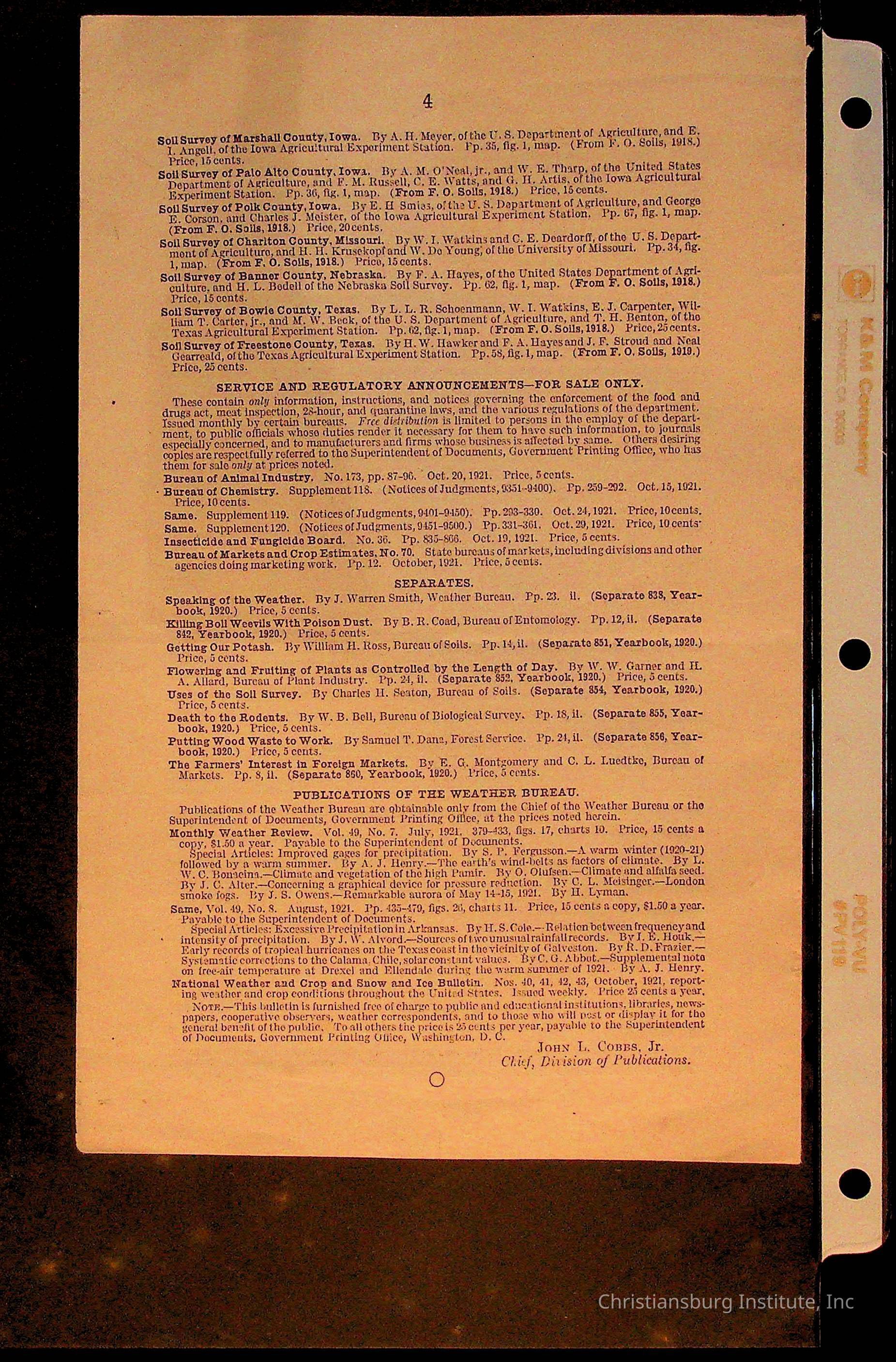 A copy of the US Department of Agriculture monthly list of publications from October 1921. This document would have been used as an informational guide for Christiansburg Industrial Institute.
