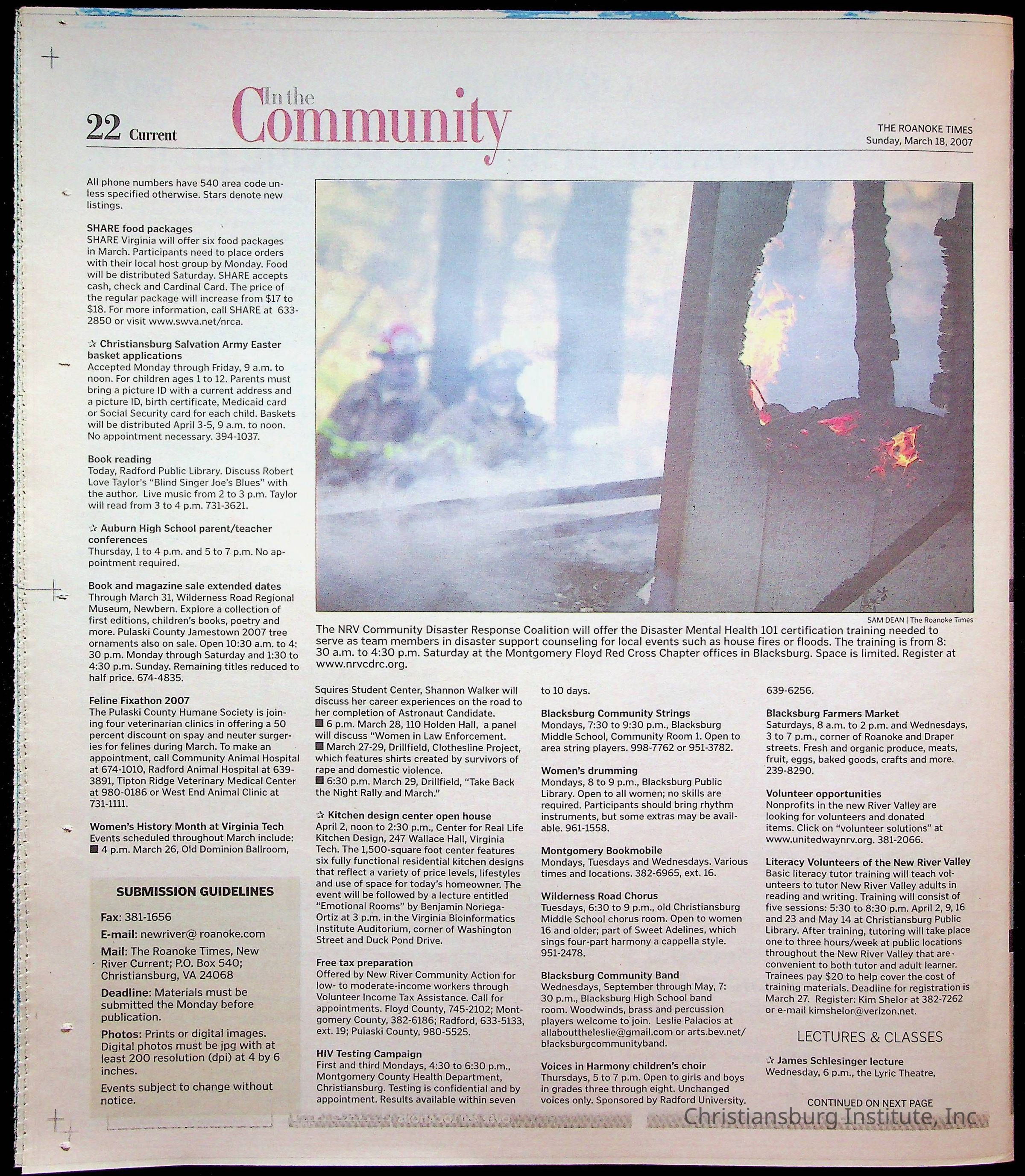 A copy of the New River Valley Current Sunday published by The Roanoke Times that covers Christiansburg Institute, dated March 18th, 2007.Collection