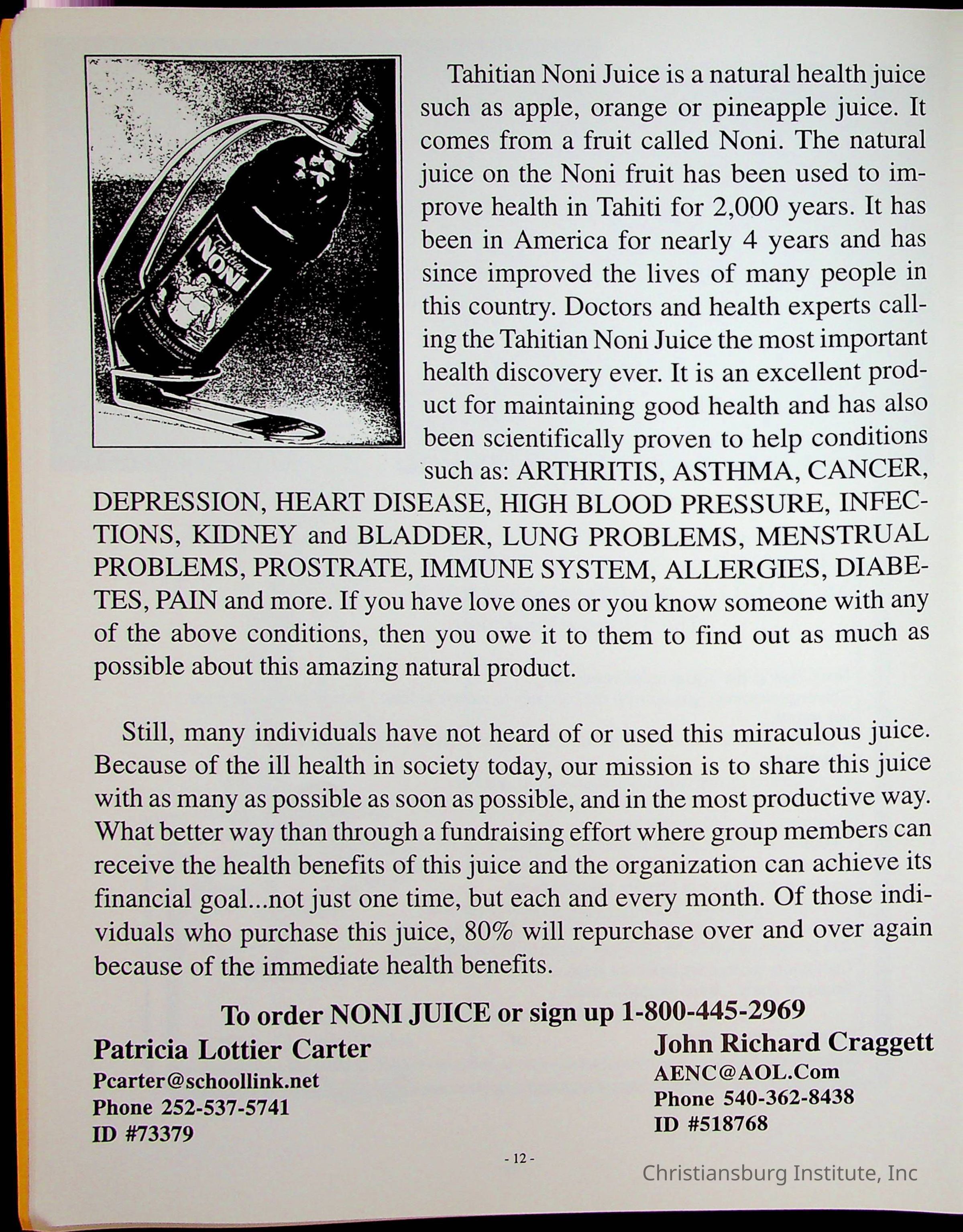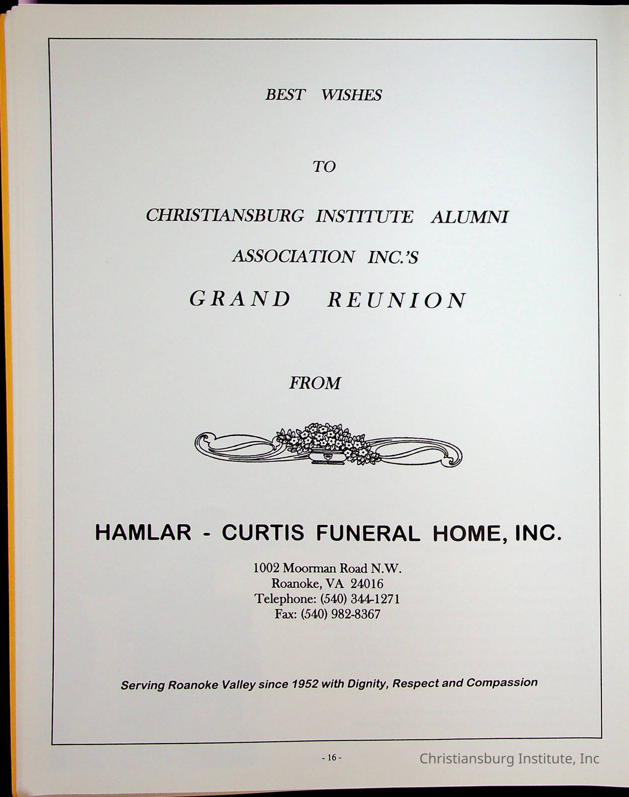 The official program and souvenir book for the Christiansburg Institute Alumni Association reunion that took place on June 29th - July 2nd 2001 at the Best Western Red Lion Inn in Blacksburg, Virginia.