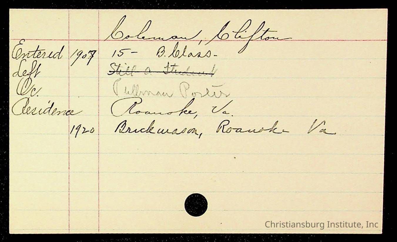 Copyright has been assigned to Christiansburg Institute Museum & Archives by Montgomery County Public Schools. For permission to publish materials created by the donor, contact CIMA@christiansburginstitute.com. Materials not created by Christiansburg Industrial Institute may still be under copyright.