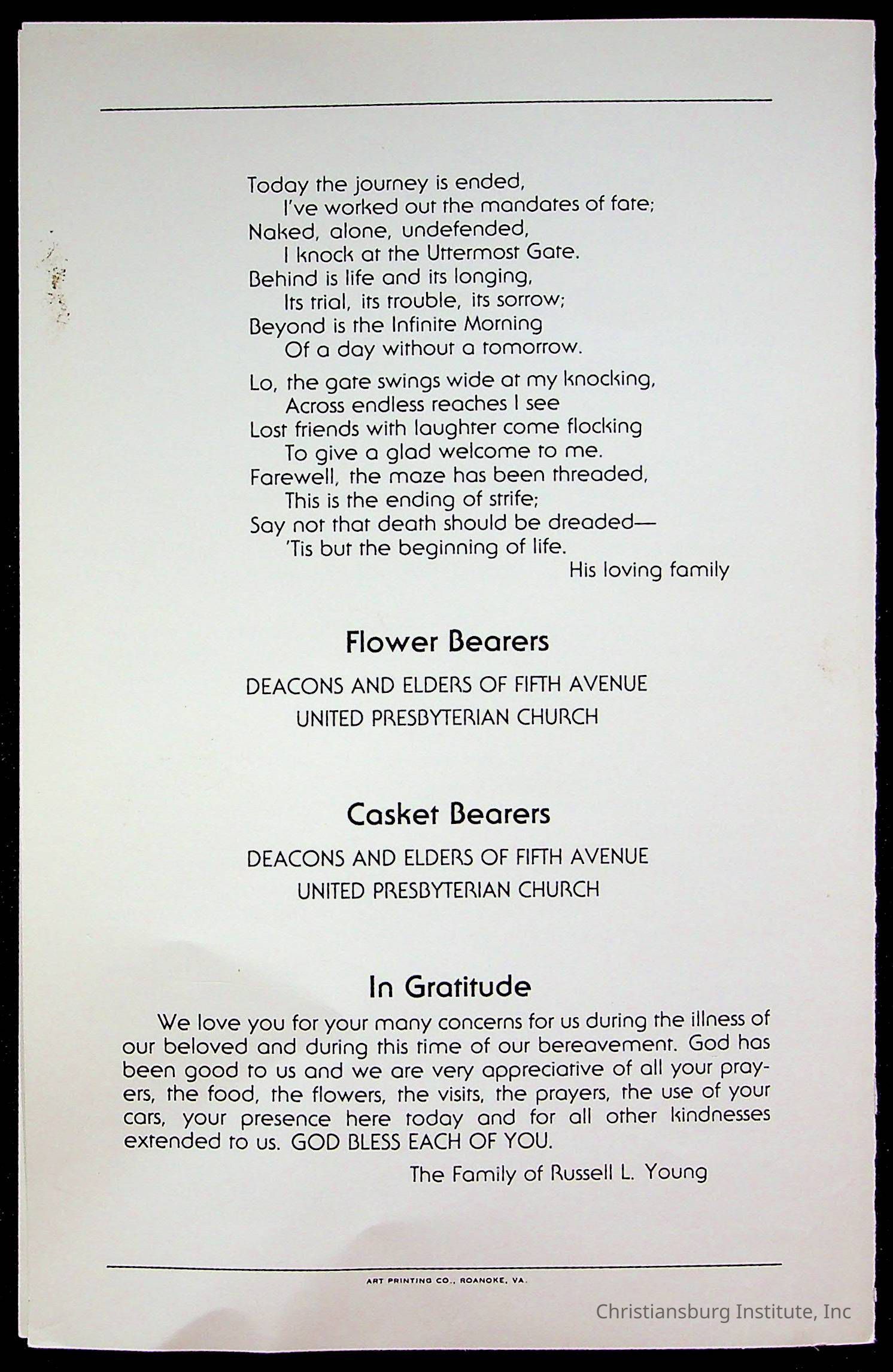 Copyright has been assigned to Christiansburg Institute Museum & Archives by Fifth Avenue Presbyterian Church. For permission to publish materials created by the donor, contact CIMA@christiansburginstitute.com. Materials not created by Fifth Avenue Presbyterian Church may still be under copyright.