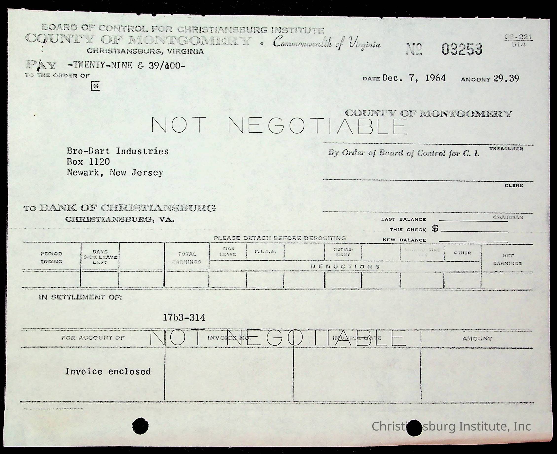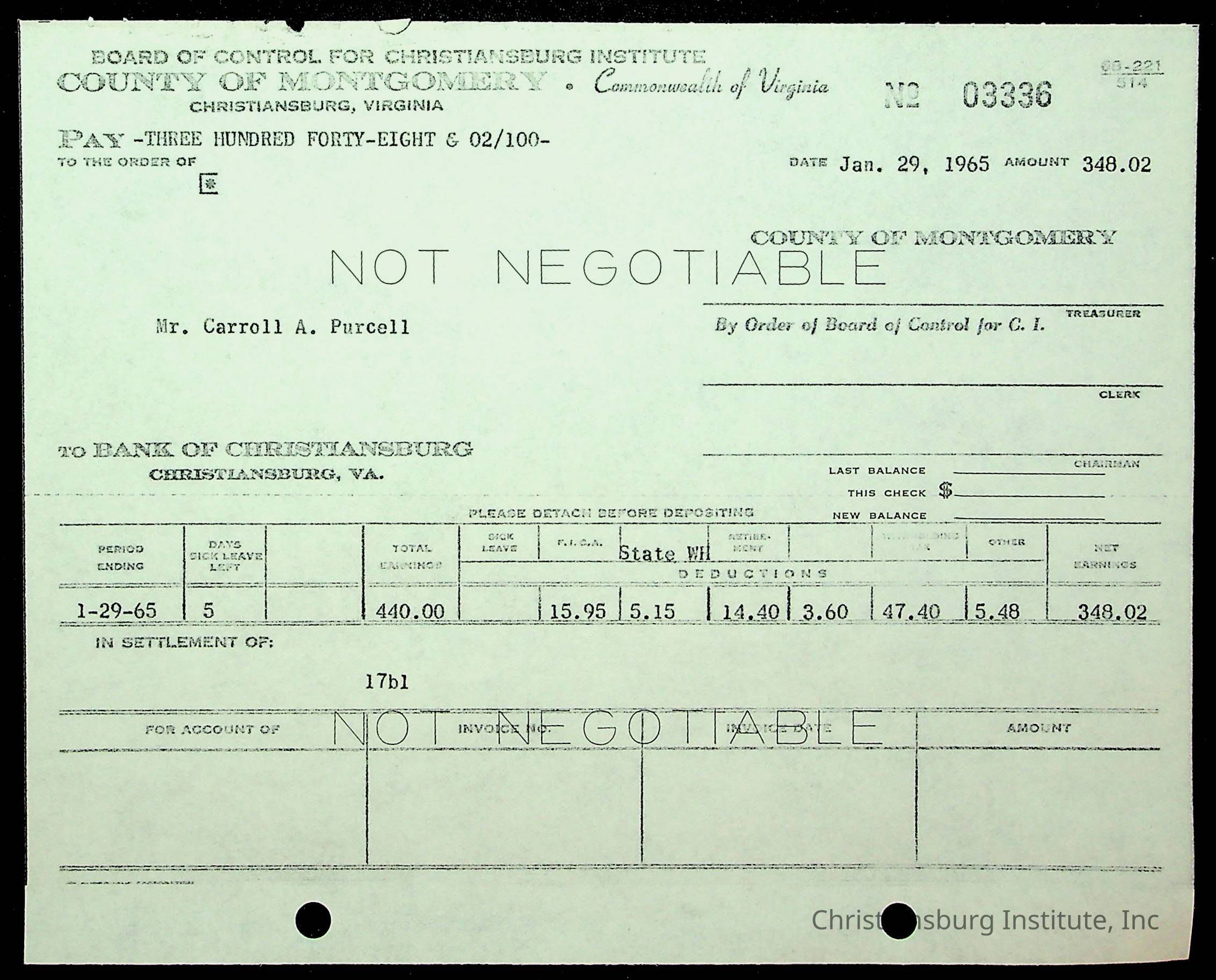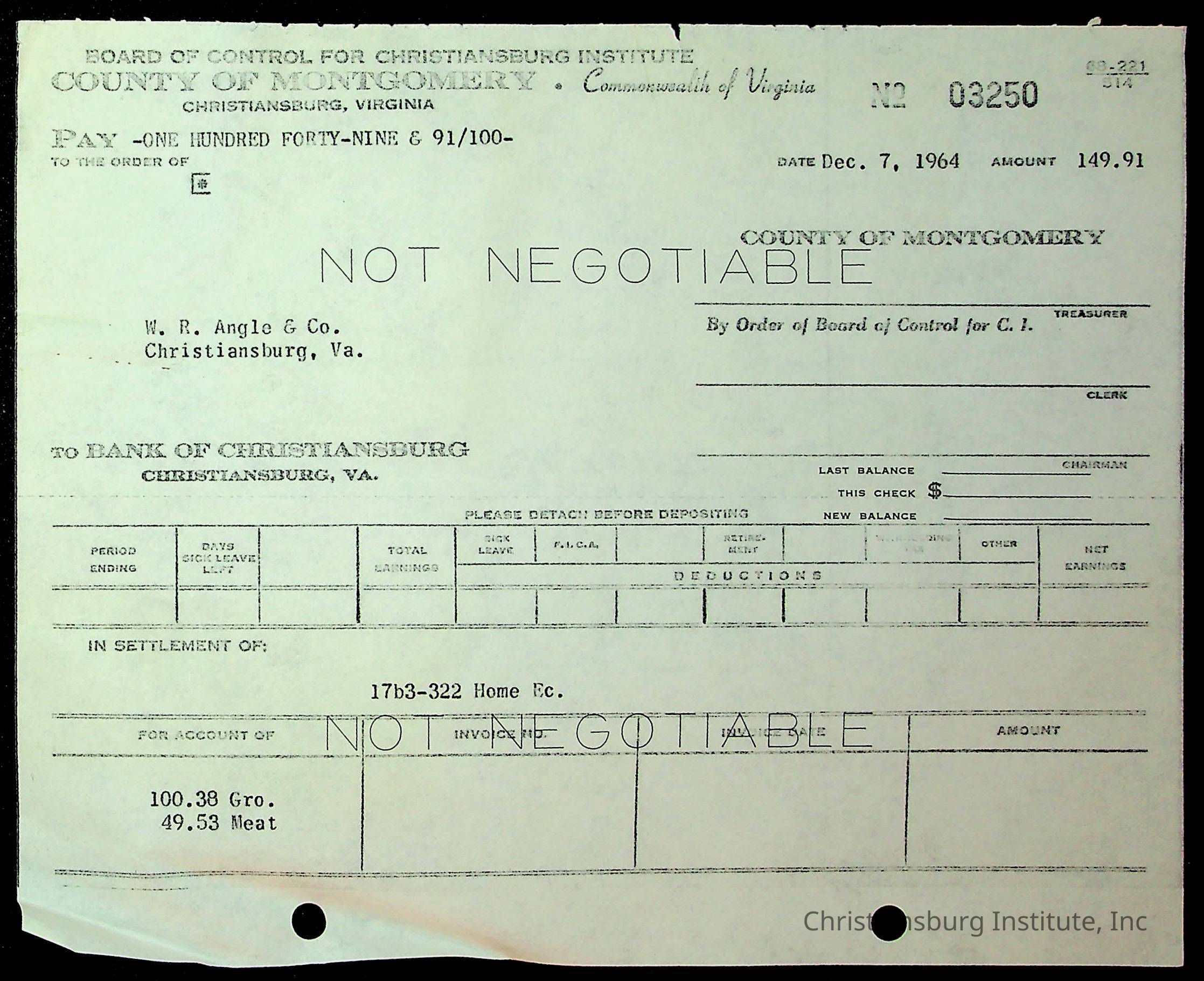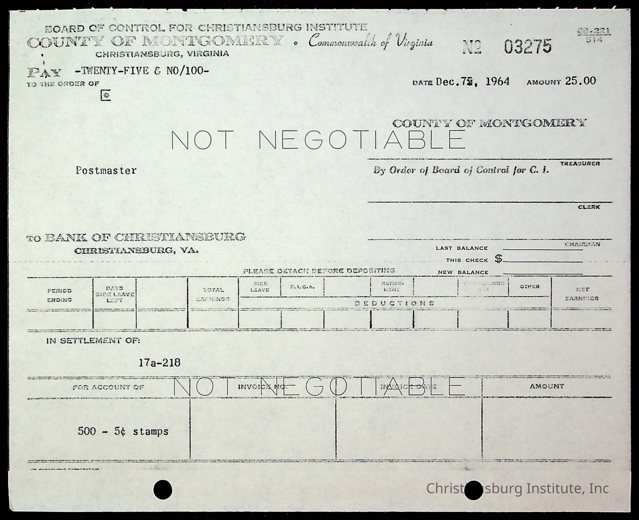 An archive of financial documents relating to the Board of Control for Christiansburg Institute dated 1964-1965. Documents include; bills, statements, and receipts.