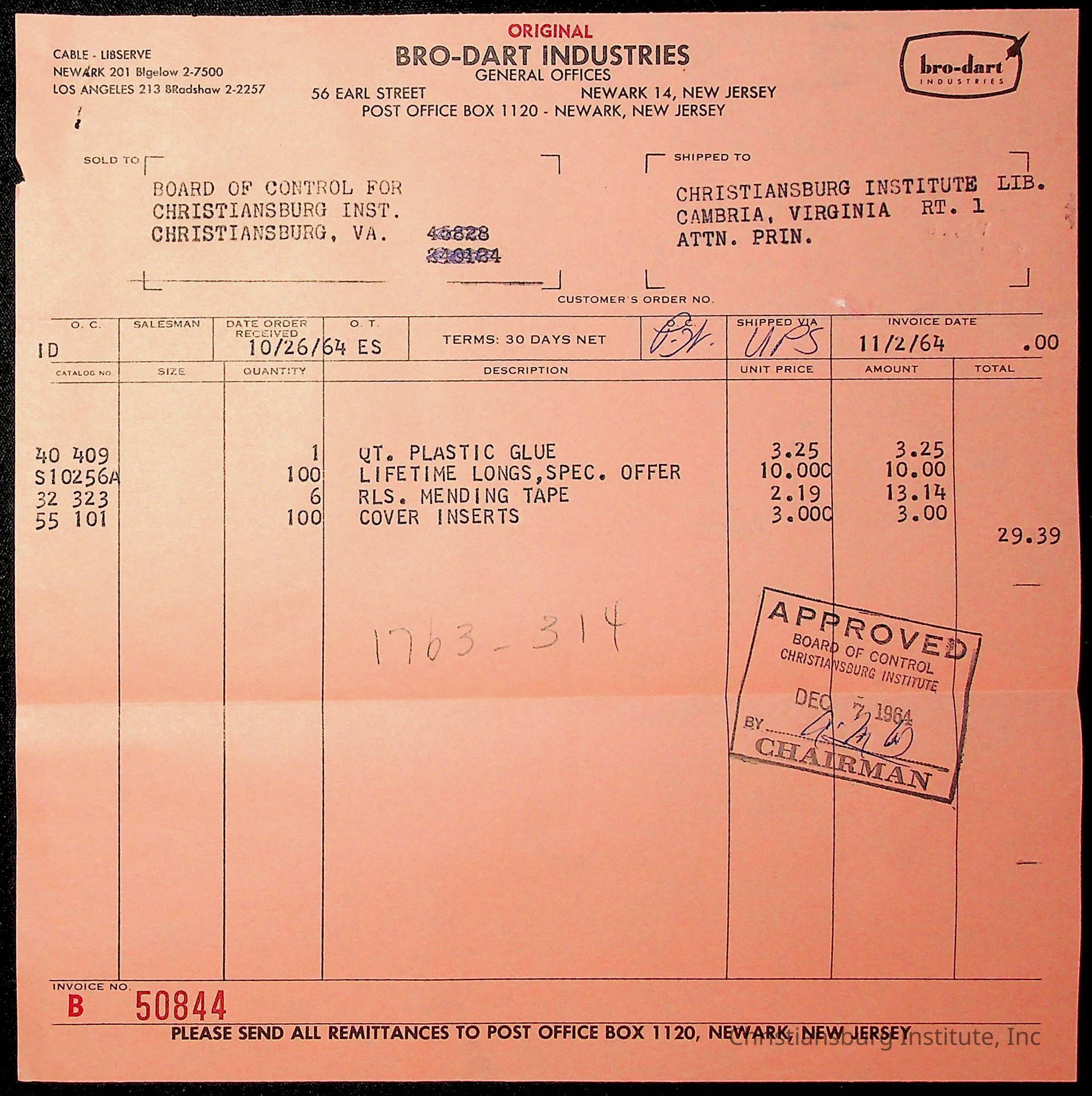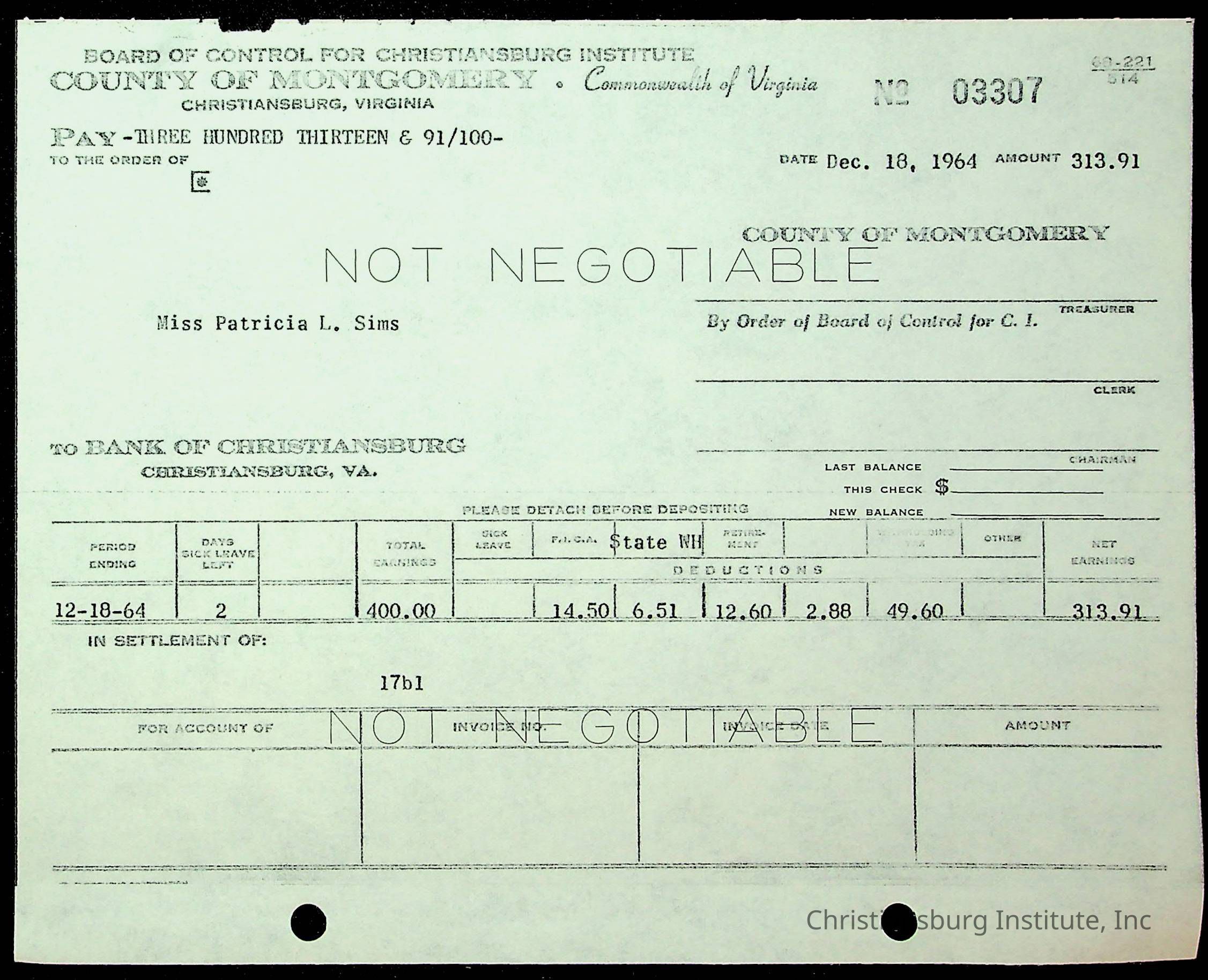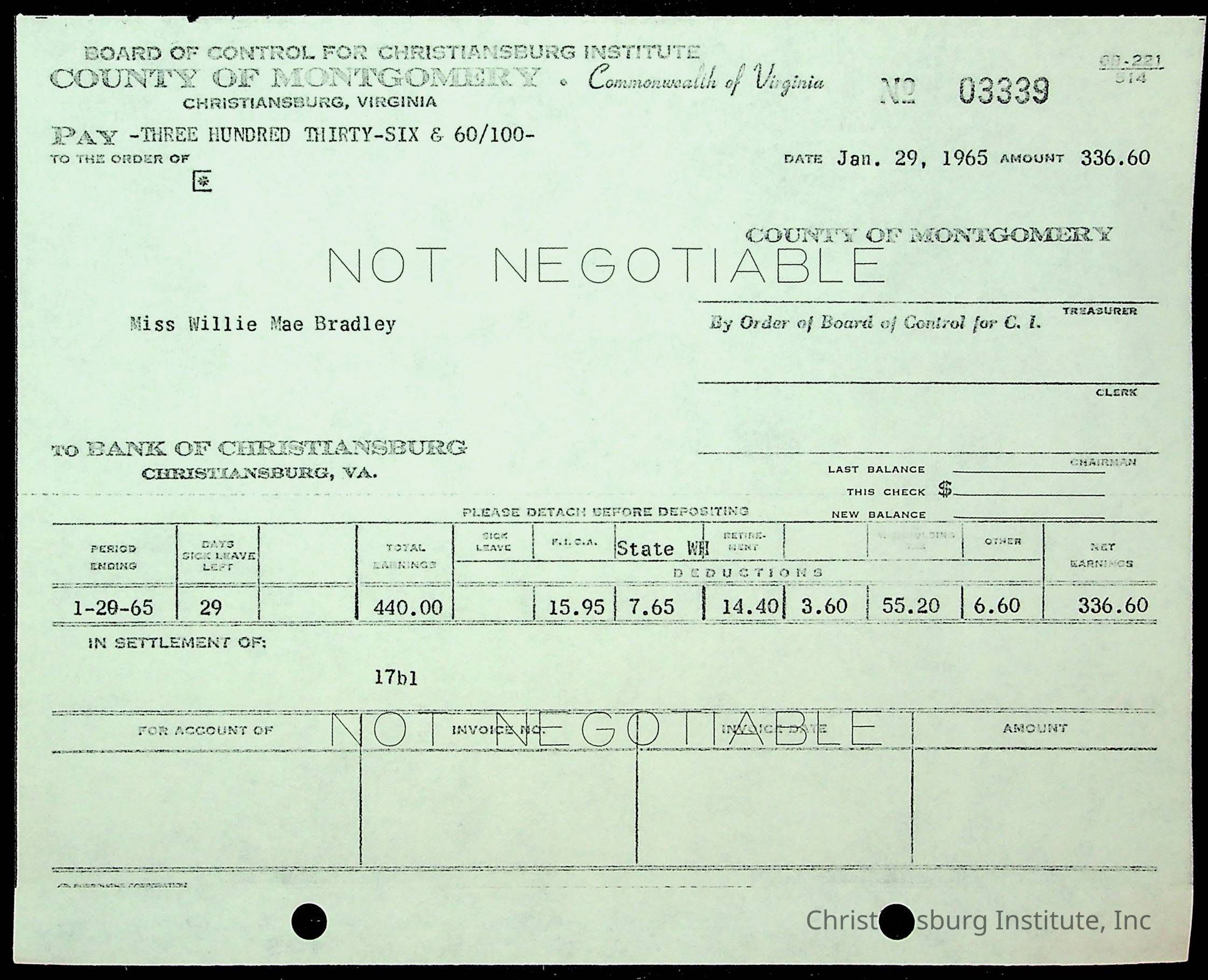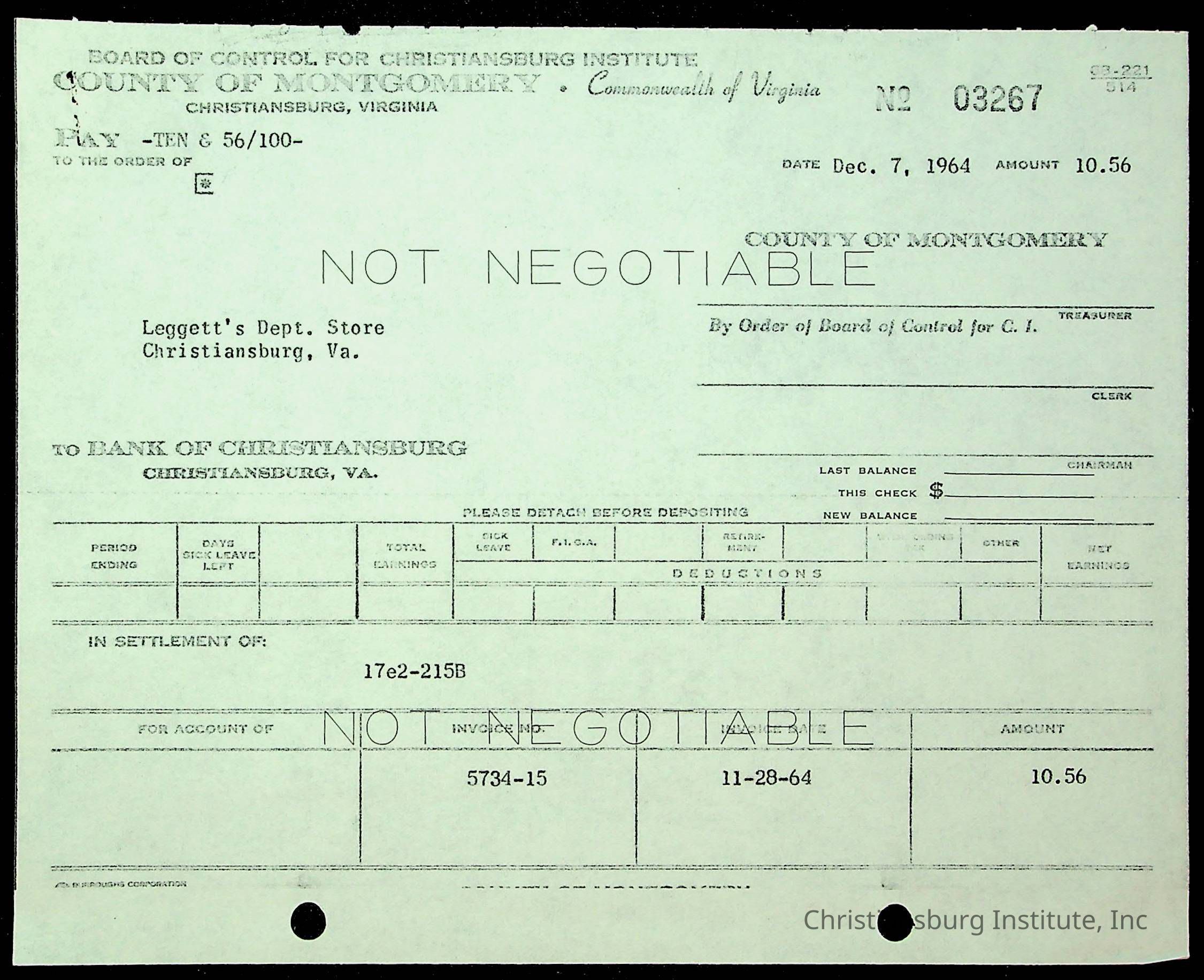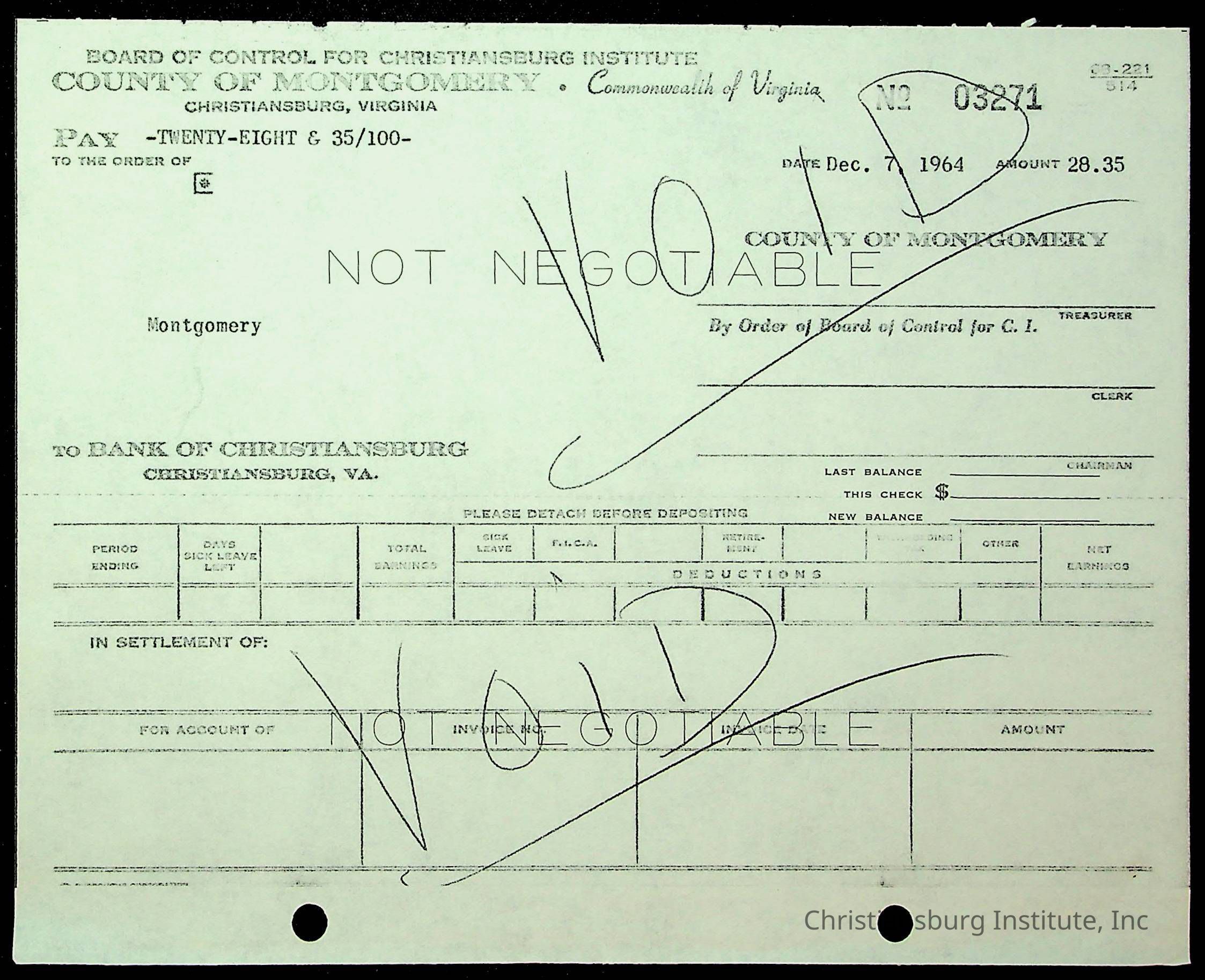 An archive of financial documents relating to the Board of Control for Christiansburg Institute dated 1964-1965. Documents include; bills, statements, and receipts.