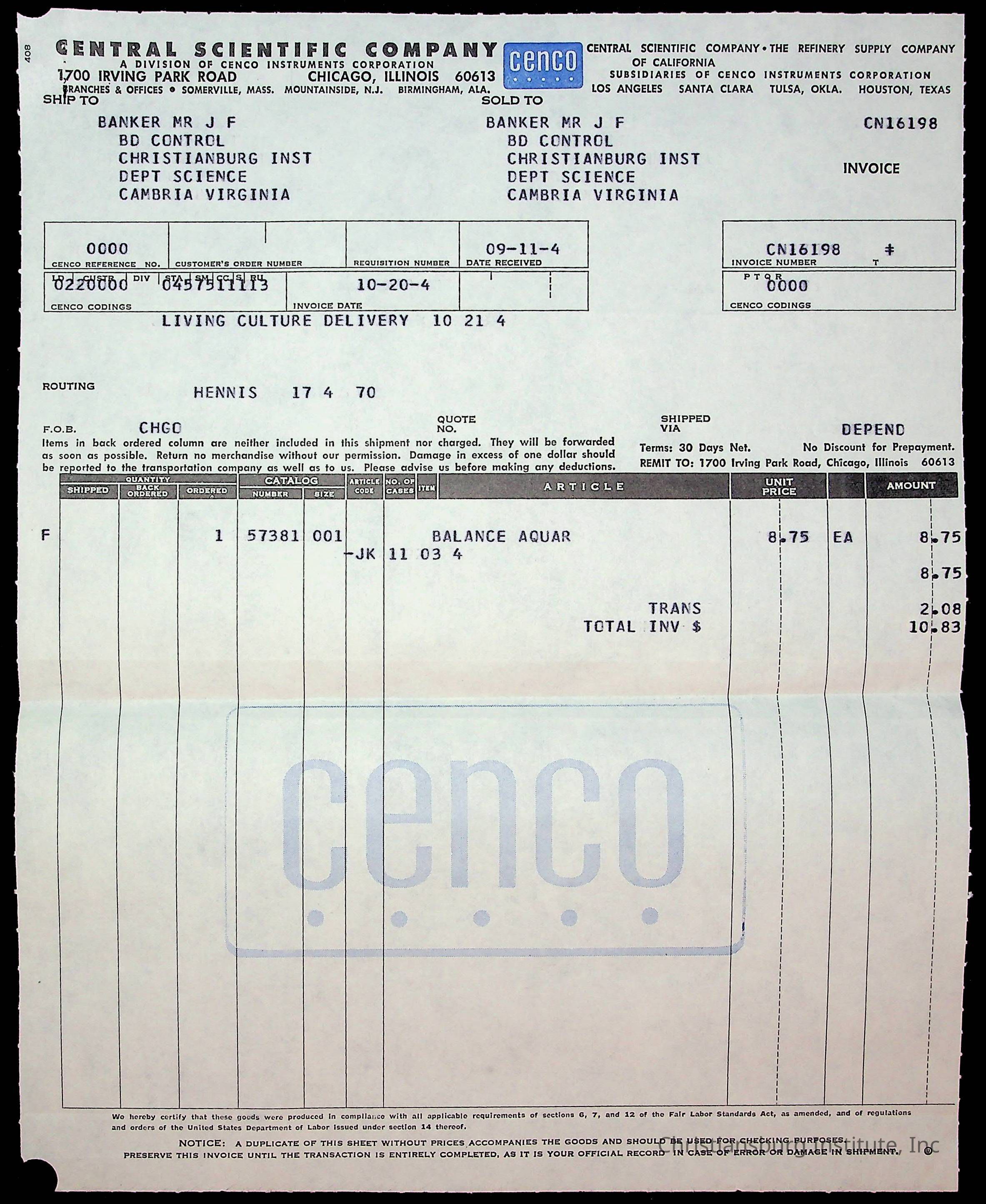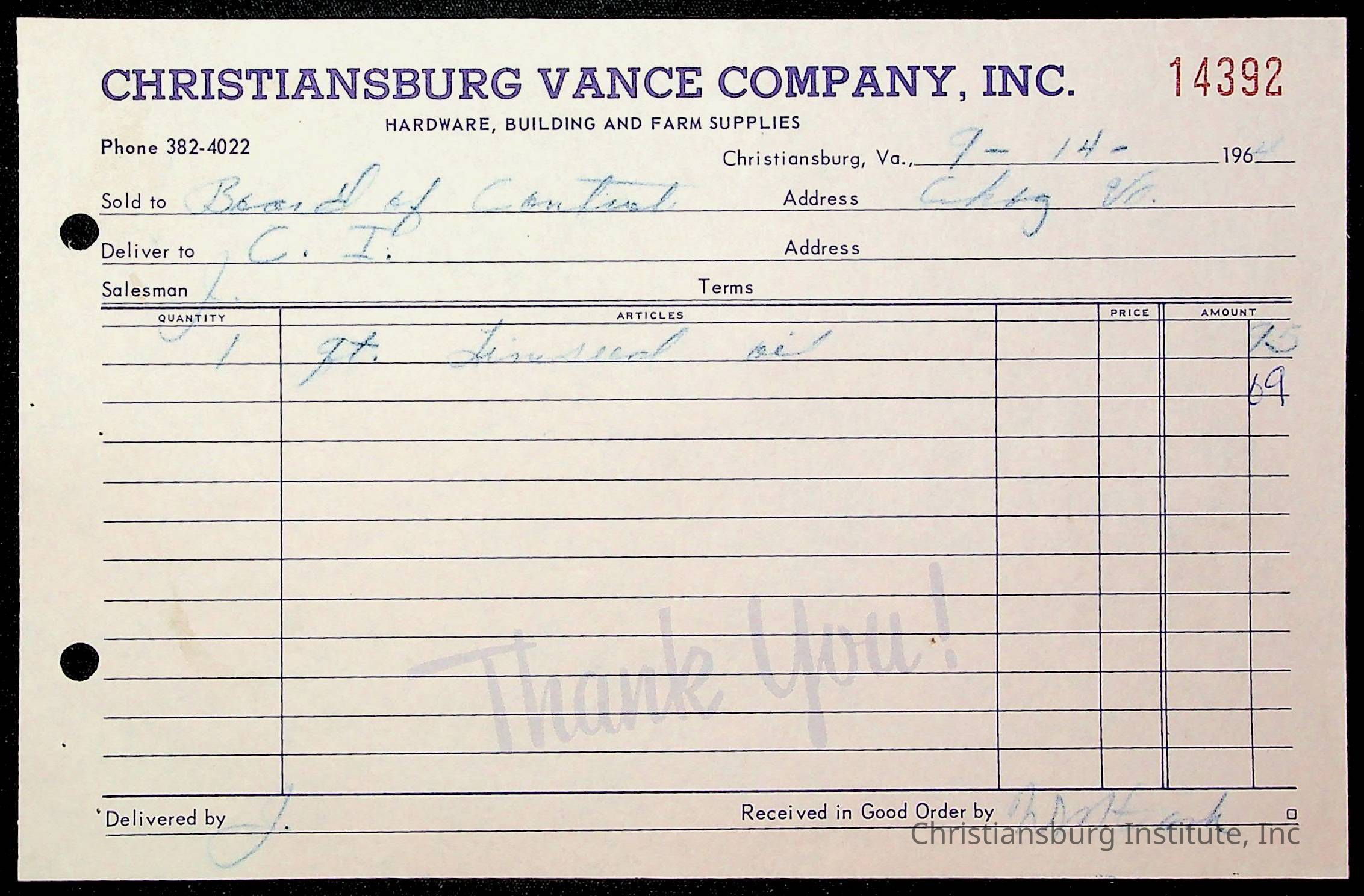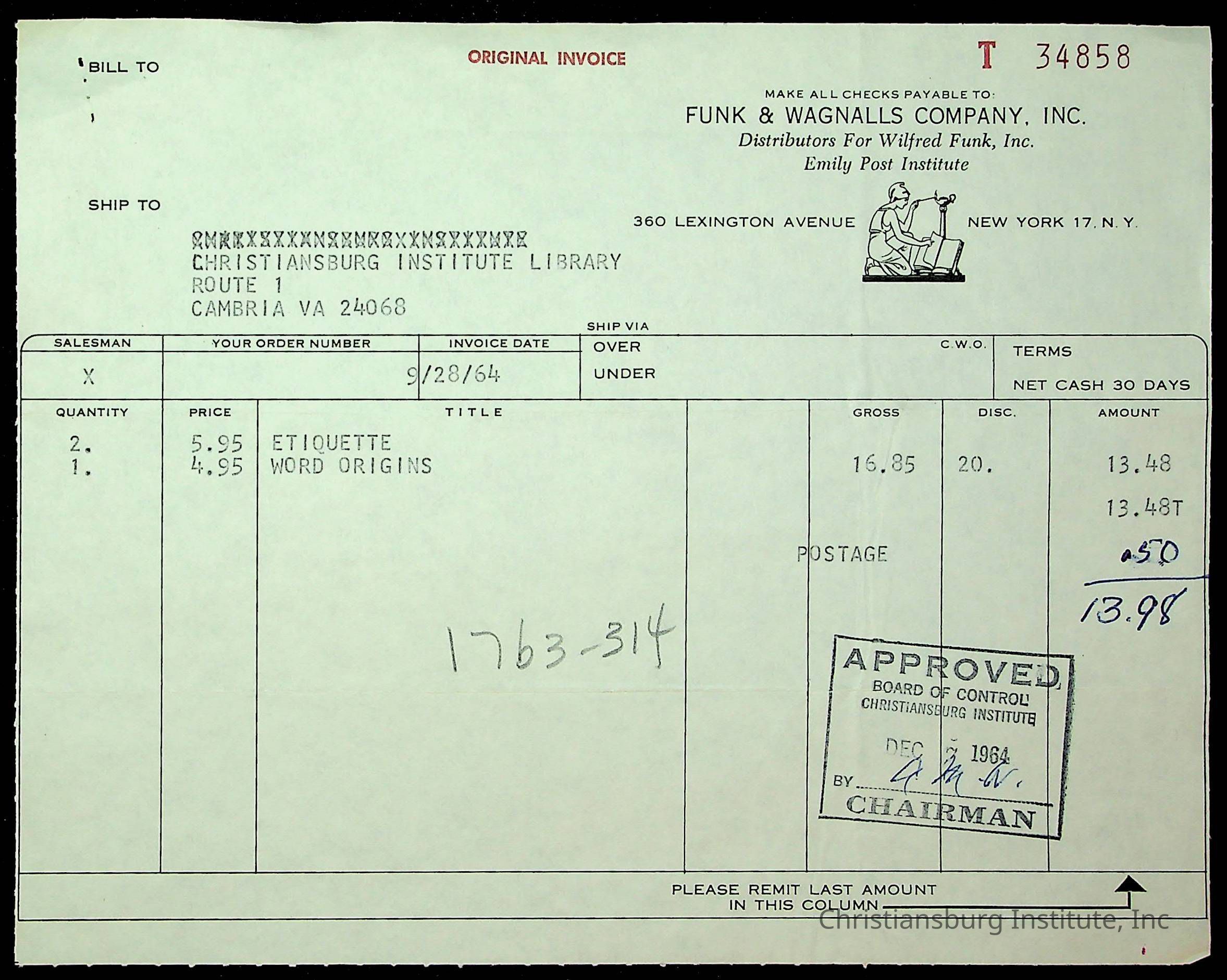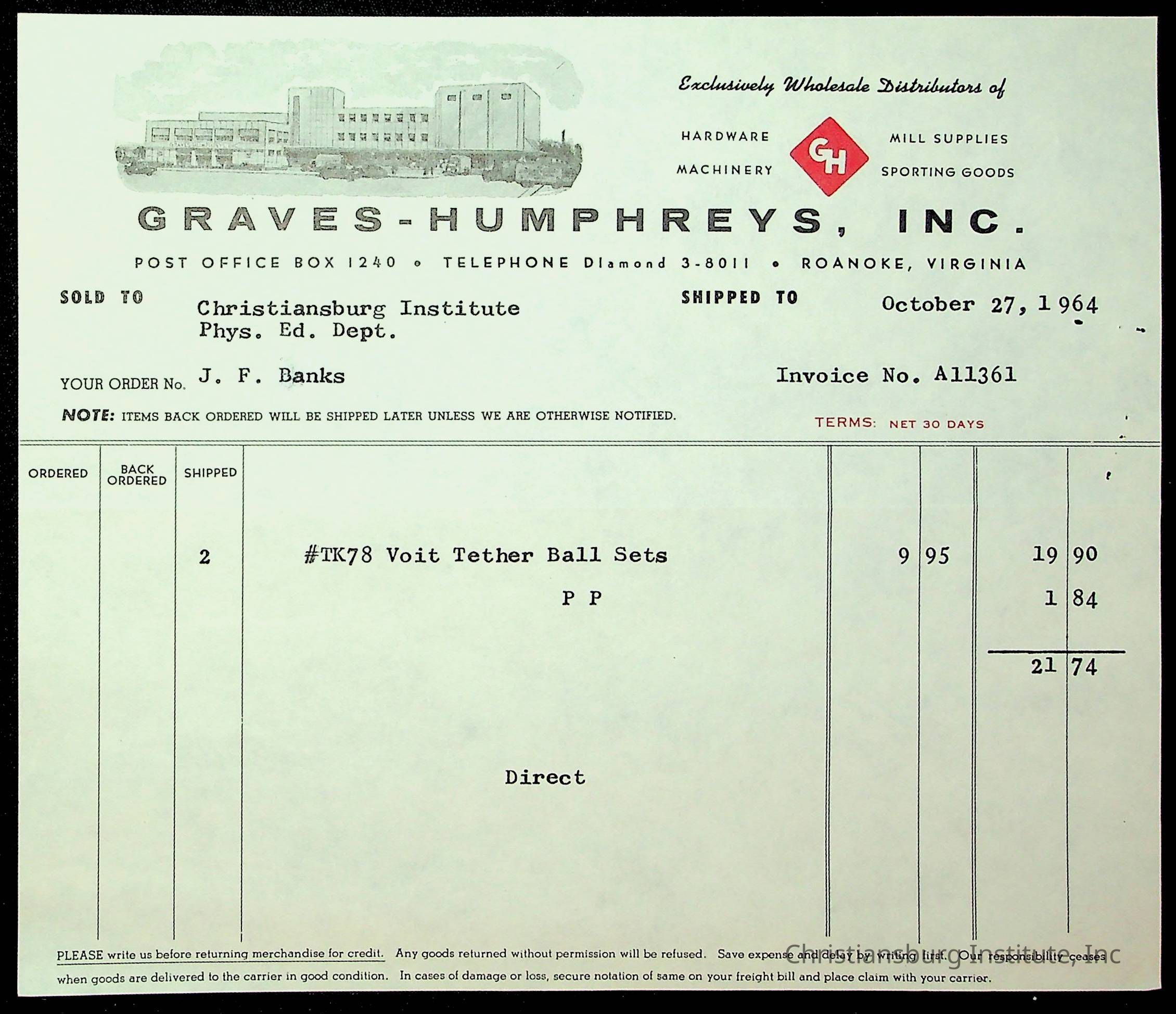 An archive of financial documents relating to the Board of Control for Christiansburg Institute dated 1964-1965. Documents include; bills, statements, and receipts.