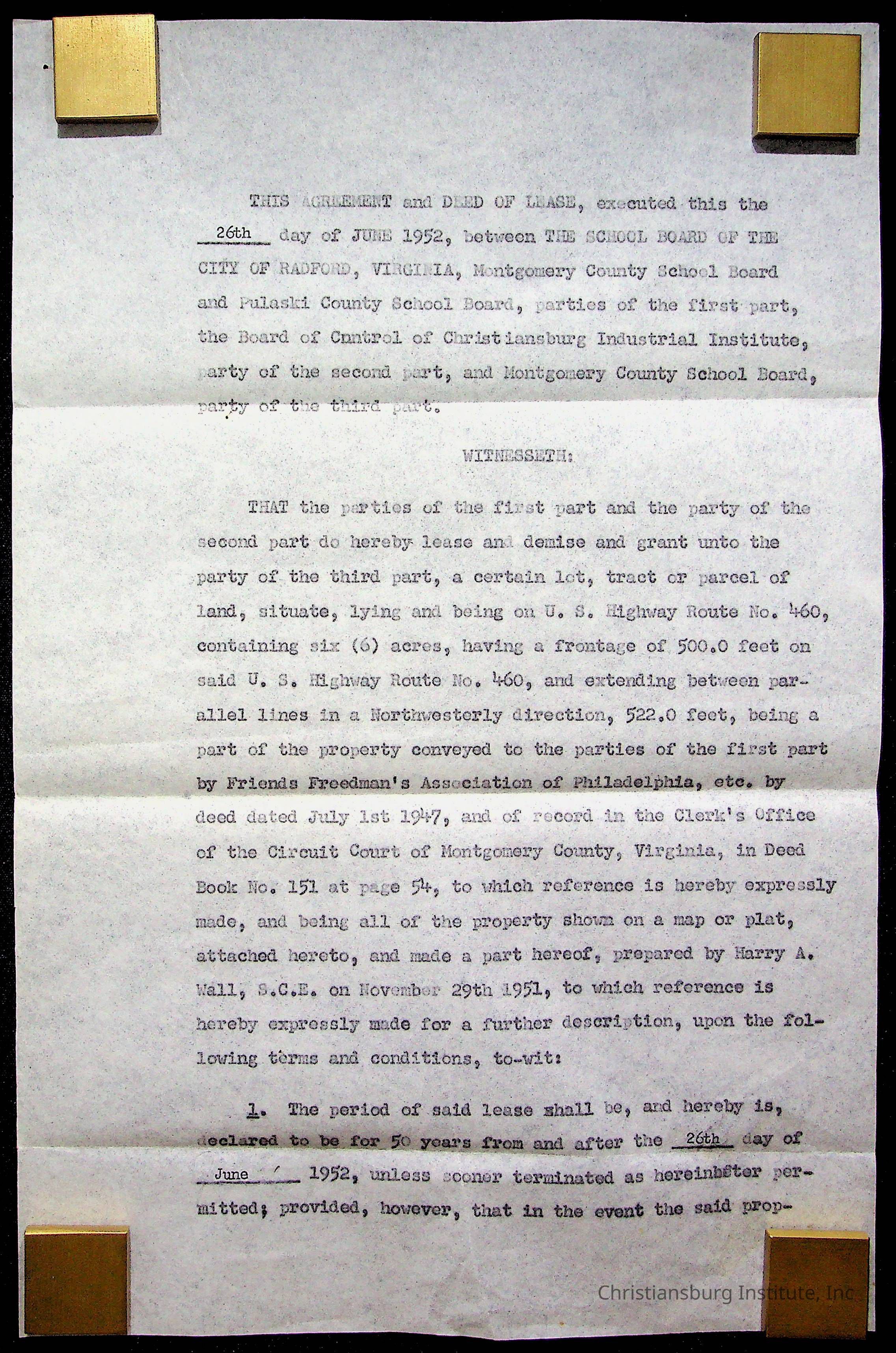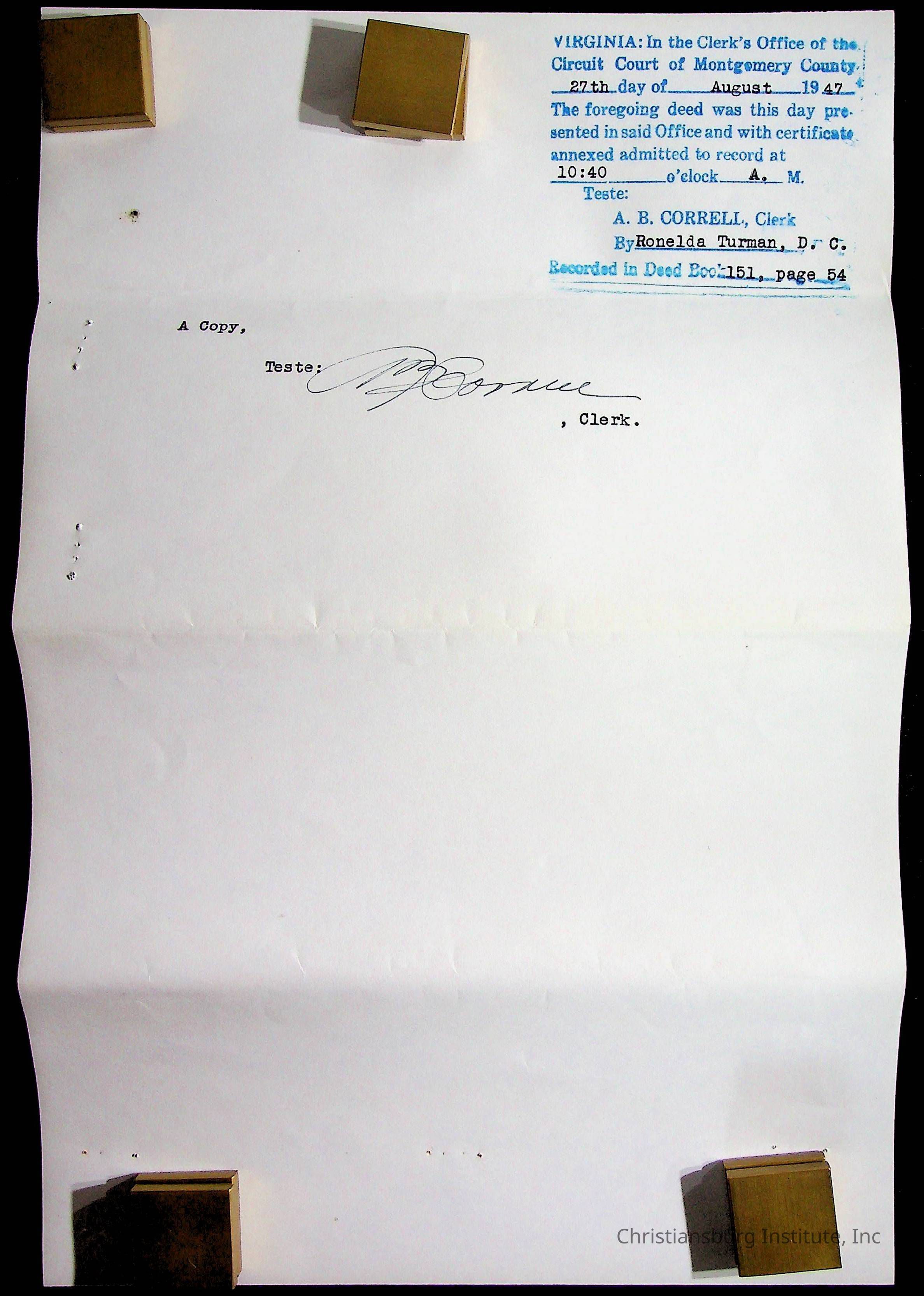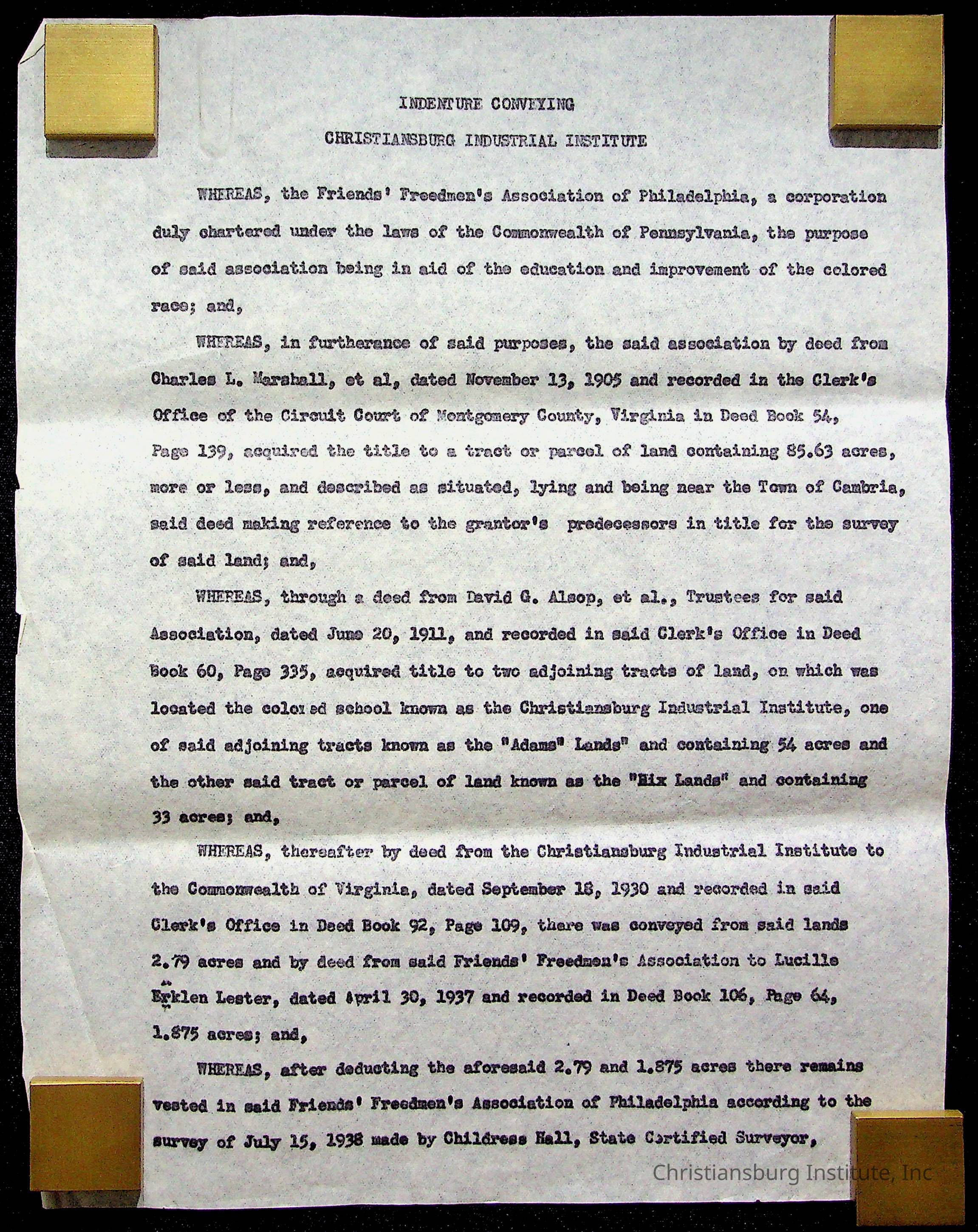 An archive of materials relating to the Christiansburg Institute including copies of deeds, correspondence, insurance paperwork, and other materials, circa 1940s-1960s.Collection
