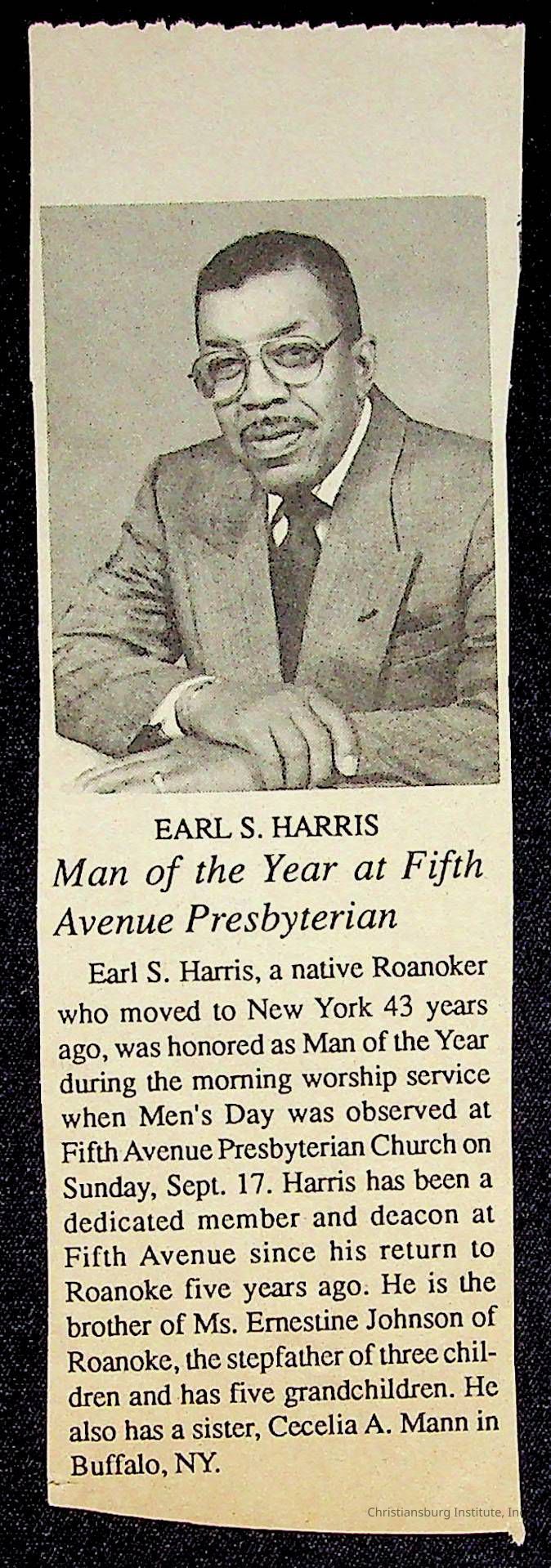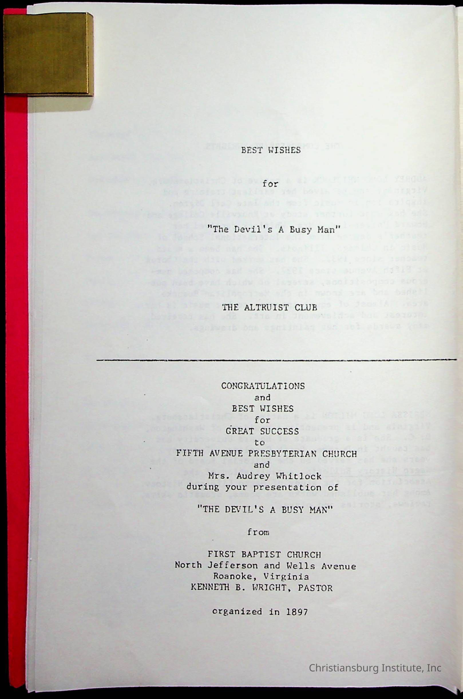 Copyright has been assigned to Christiansburg Institute Museum & Archives by Fifth Avenue Presbyterian Church. For permission to publish materials created by the donor, contact CIMA@christiansburginstitute.com. Materials not created by Fifth Avenue Presbyterian Church may still be under copyright.
