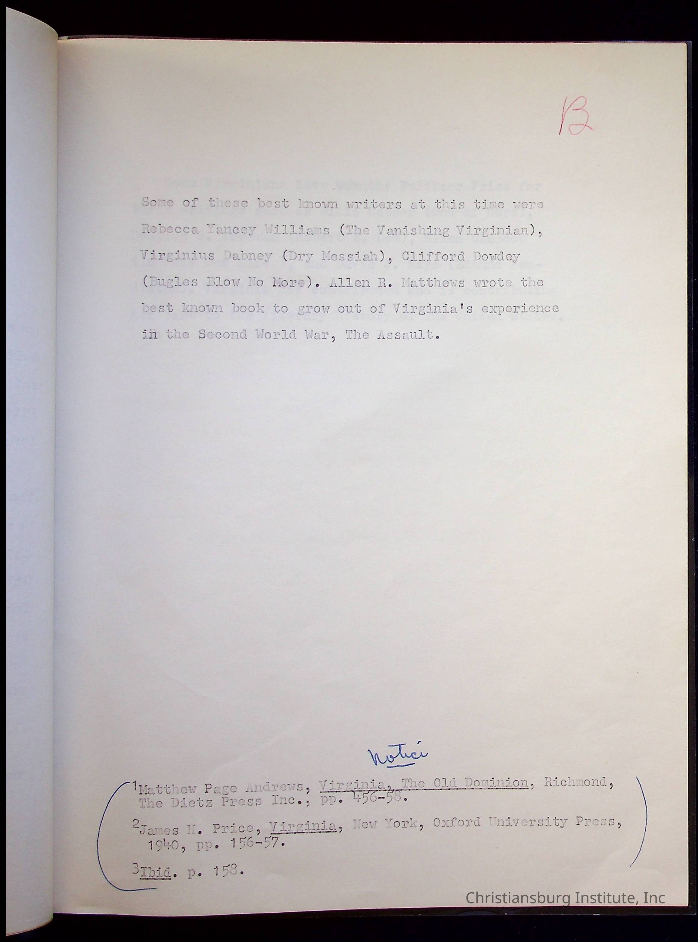 A typed document titled "Virginia Literature" written by Christiansburg Institute student, Eloise Russo Simmons for Viola Charlton's English class dated January 17th, 1966.Creator