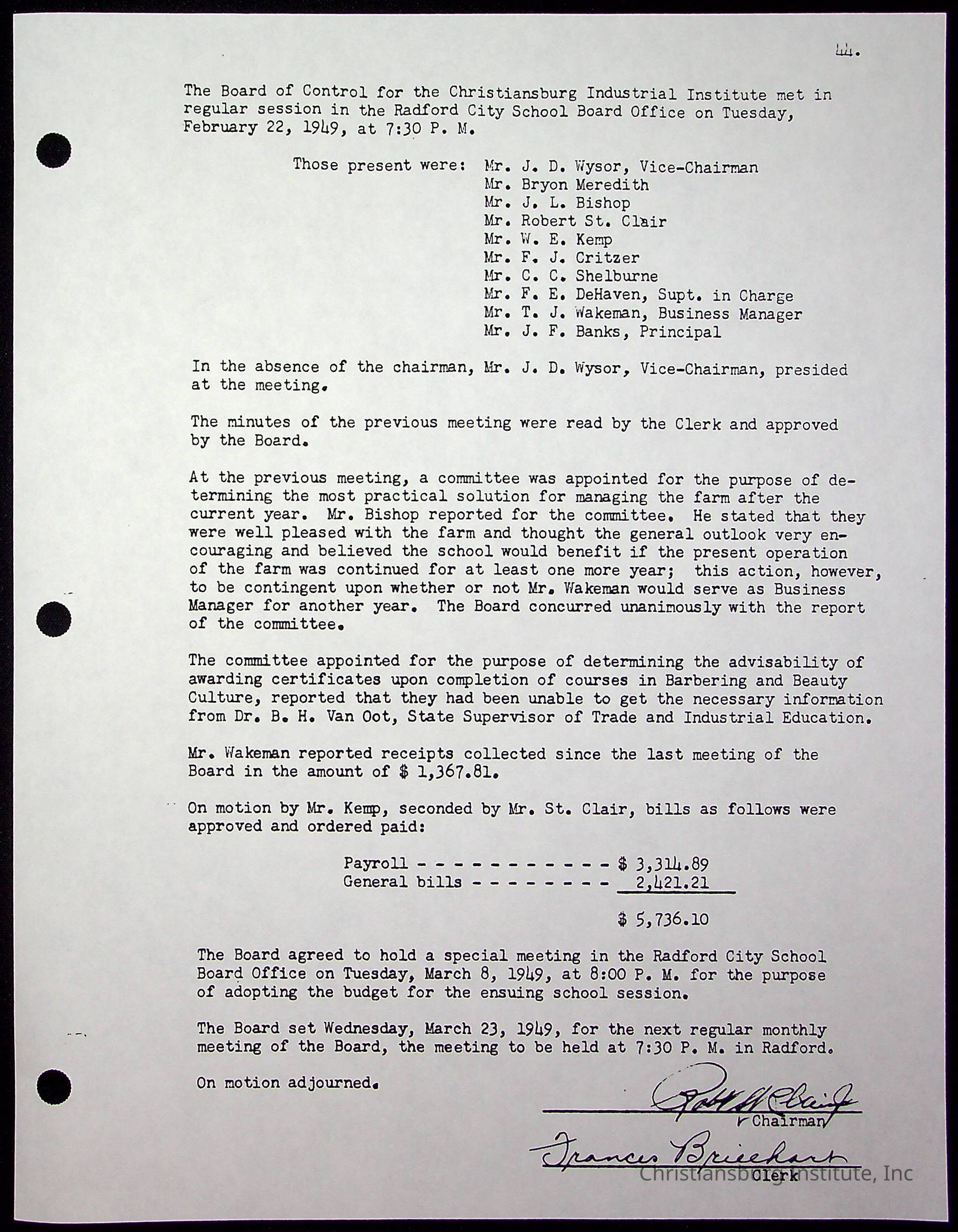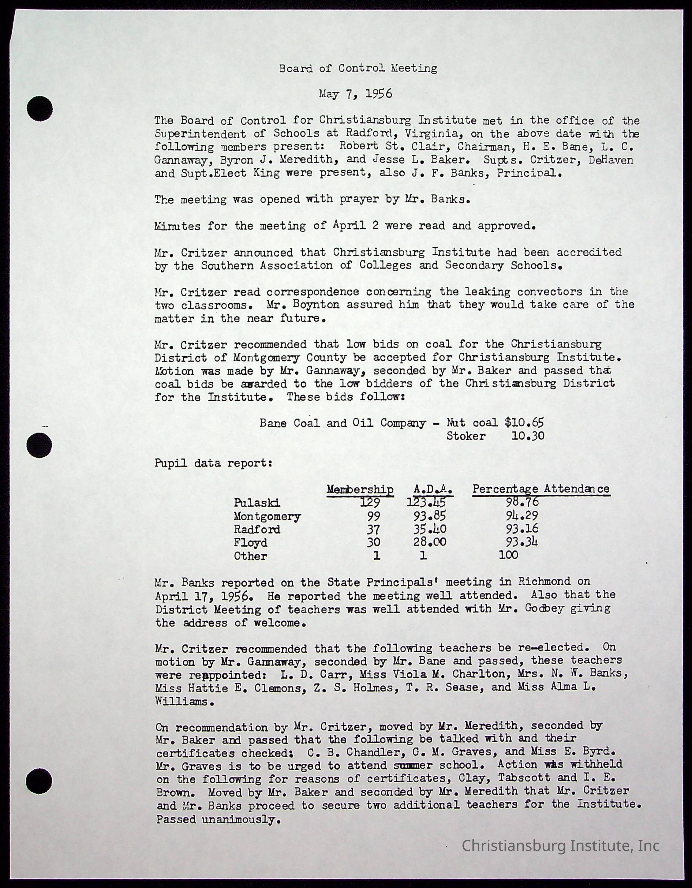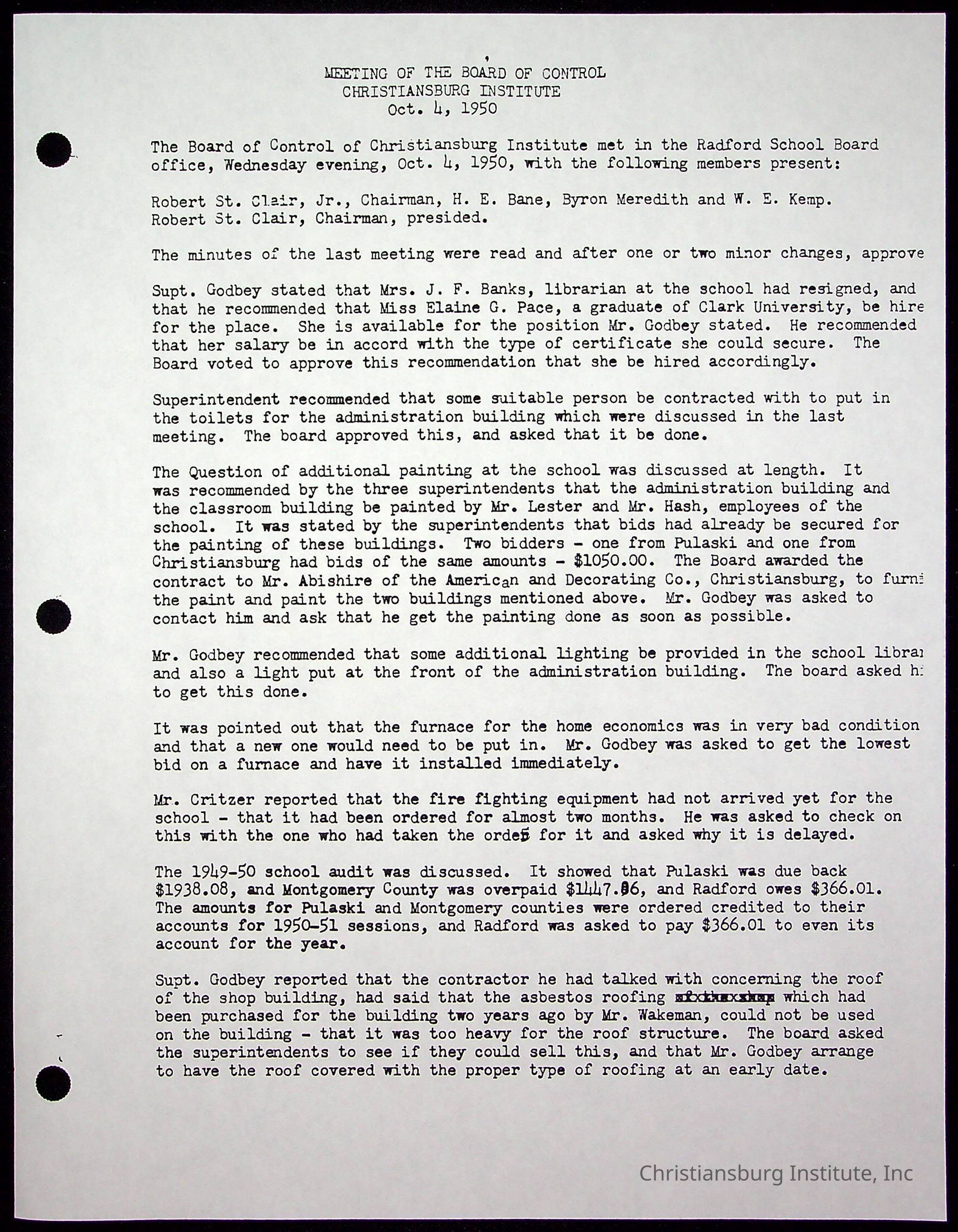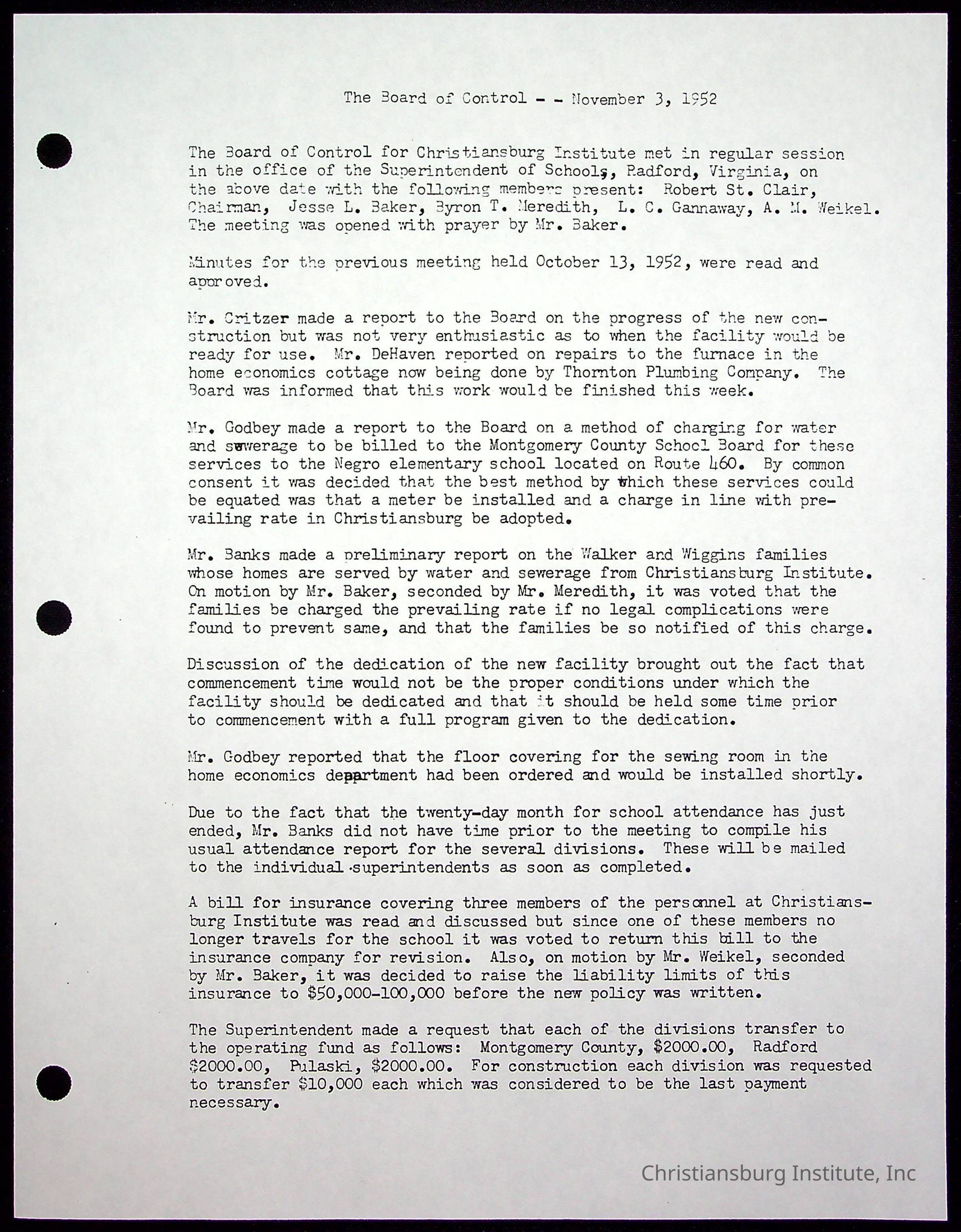 Christiansburg Industrial Institute Board Minutes, July 1947-August 1963 (photocopy)Description