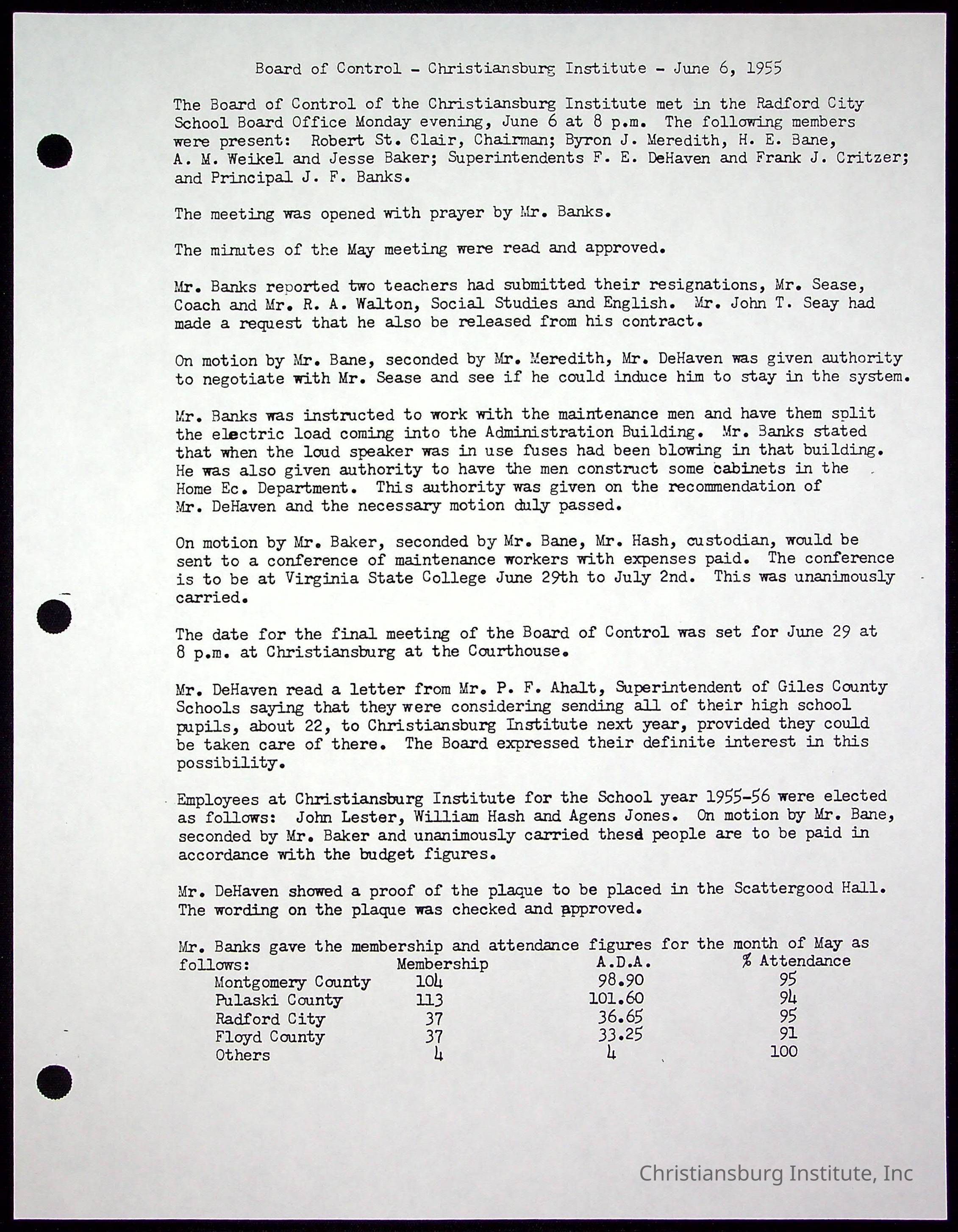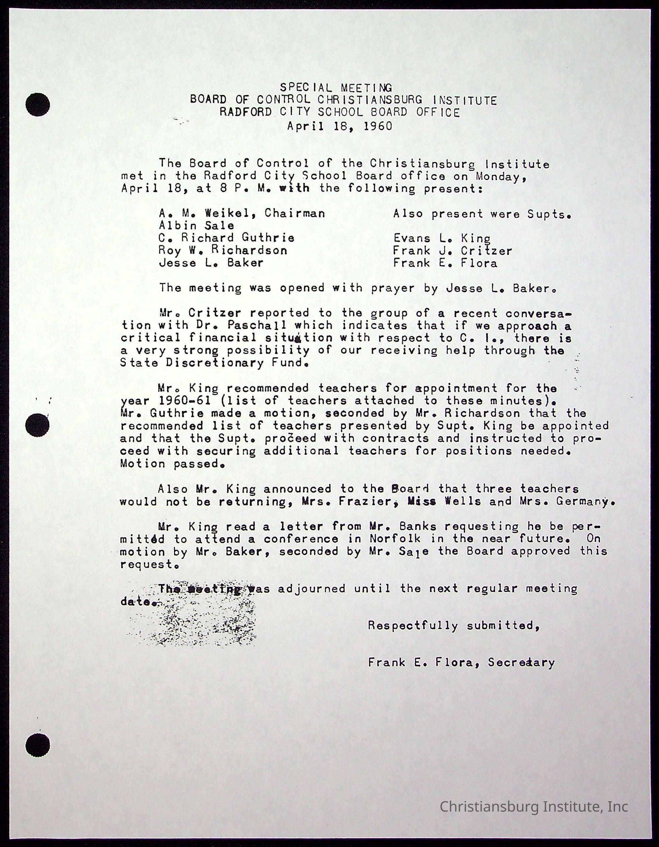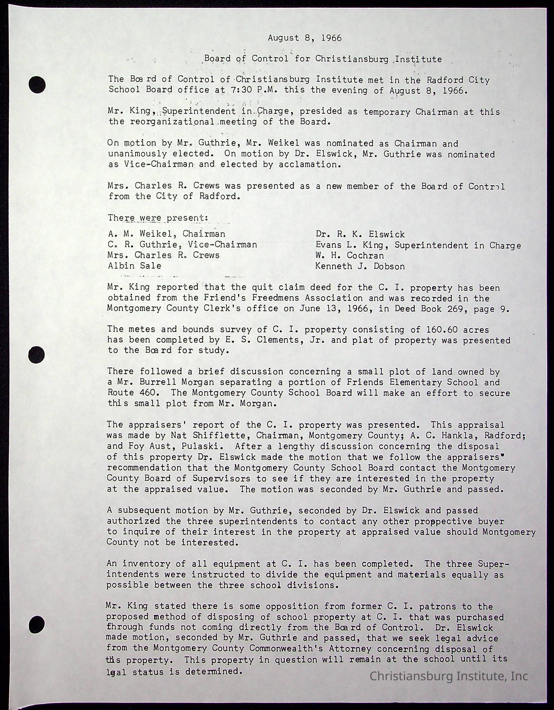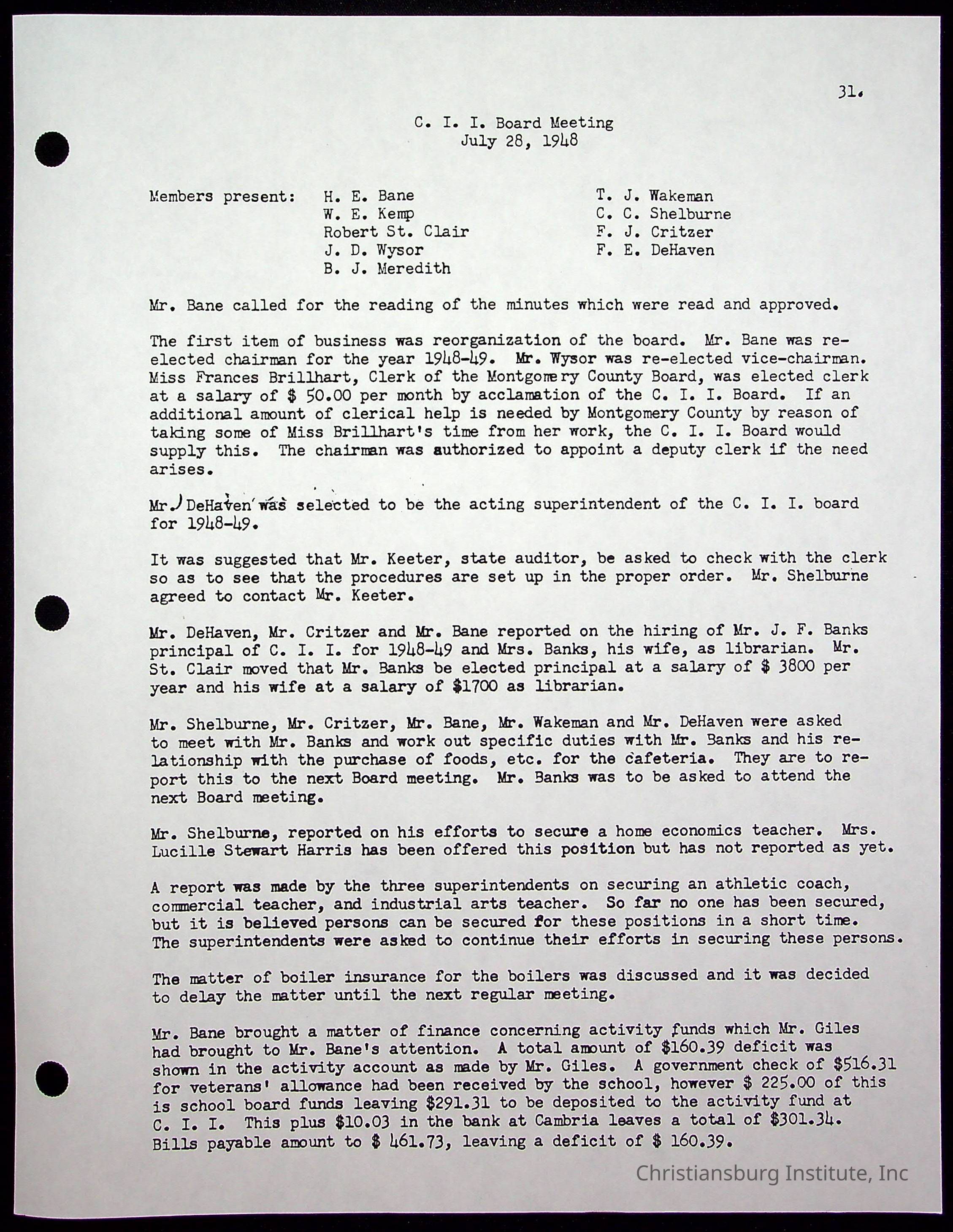 Christiansburg Industrial Institute Board Minutes, July 1947-August 1963 (photocopy)Description