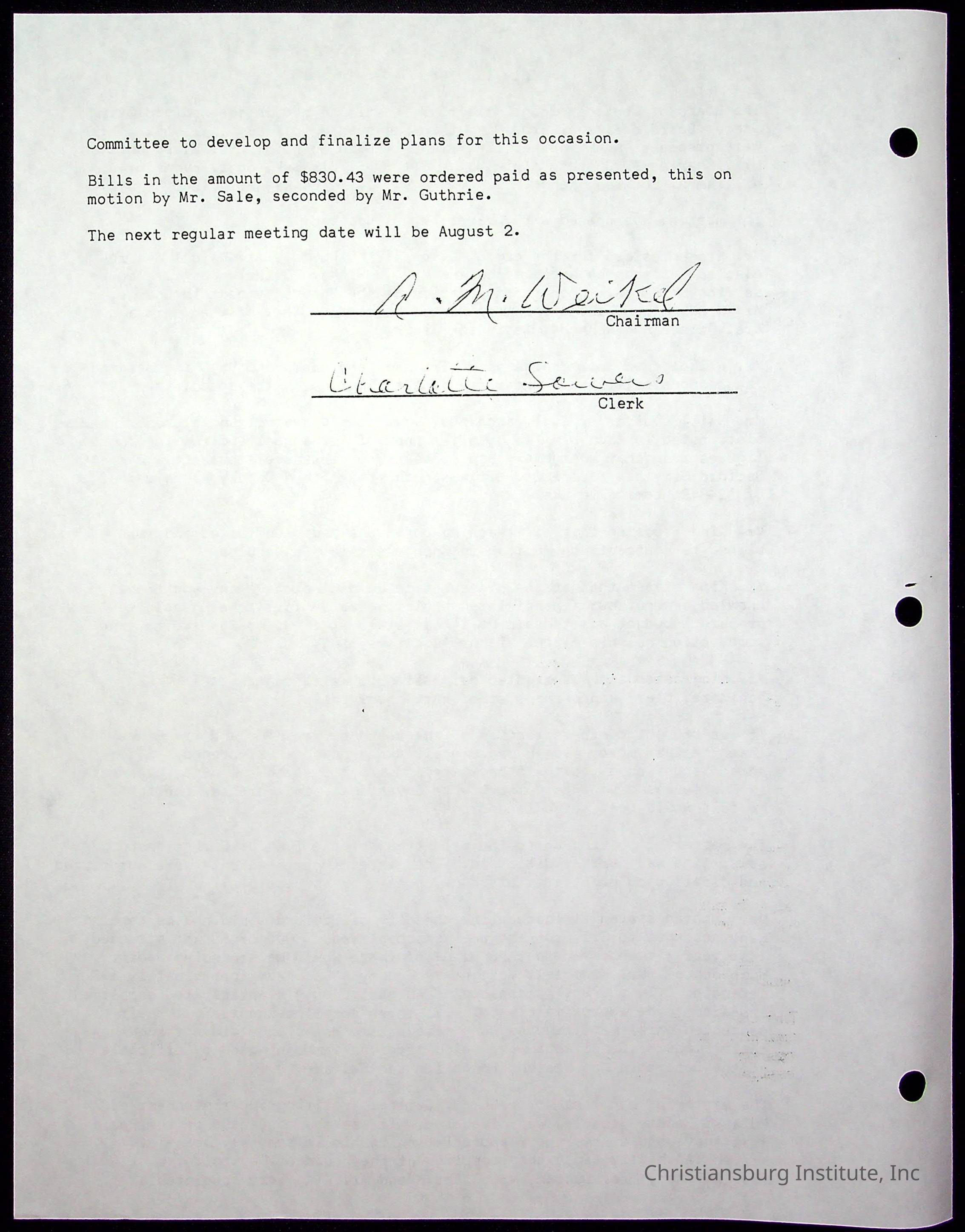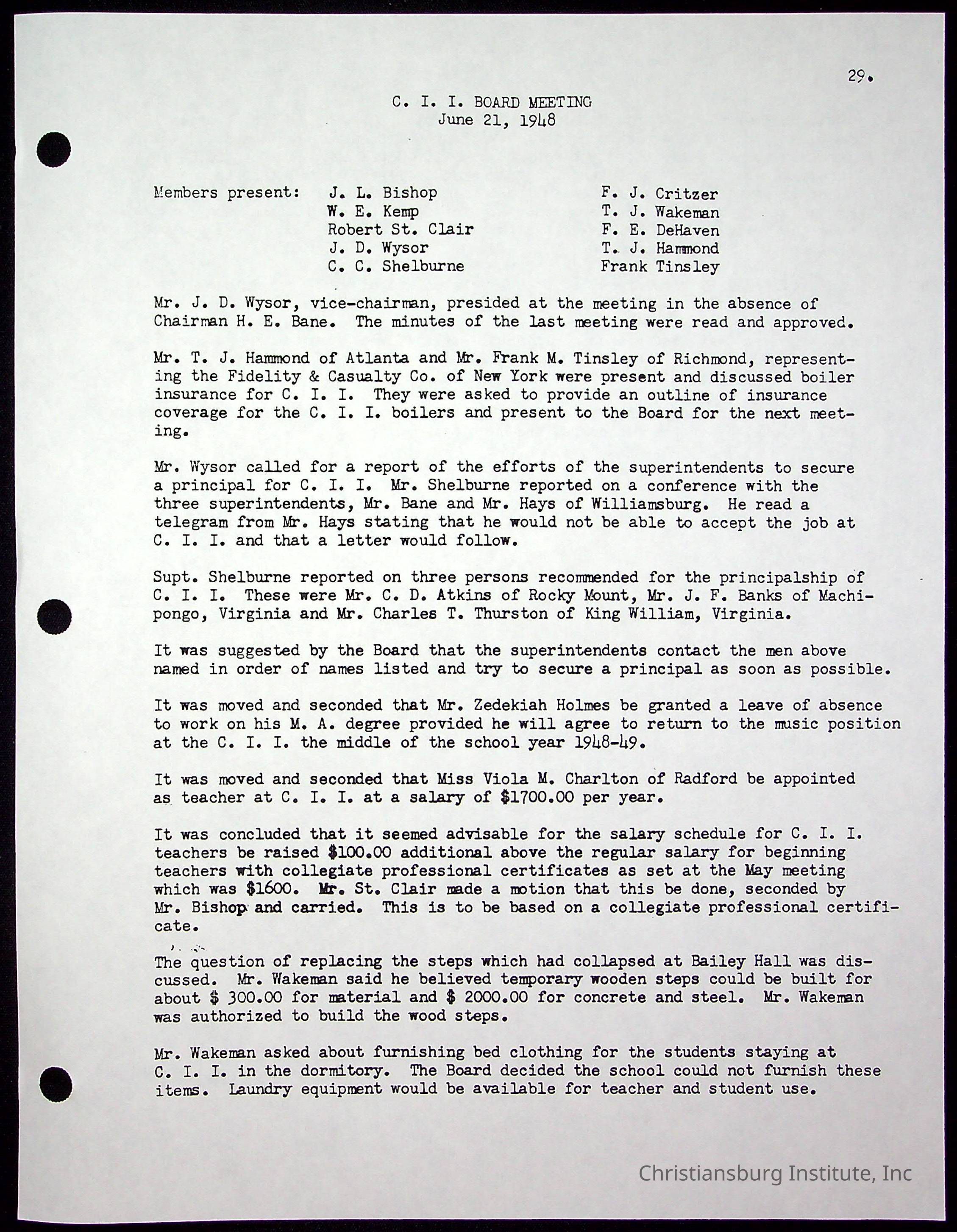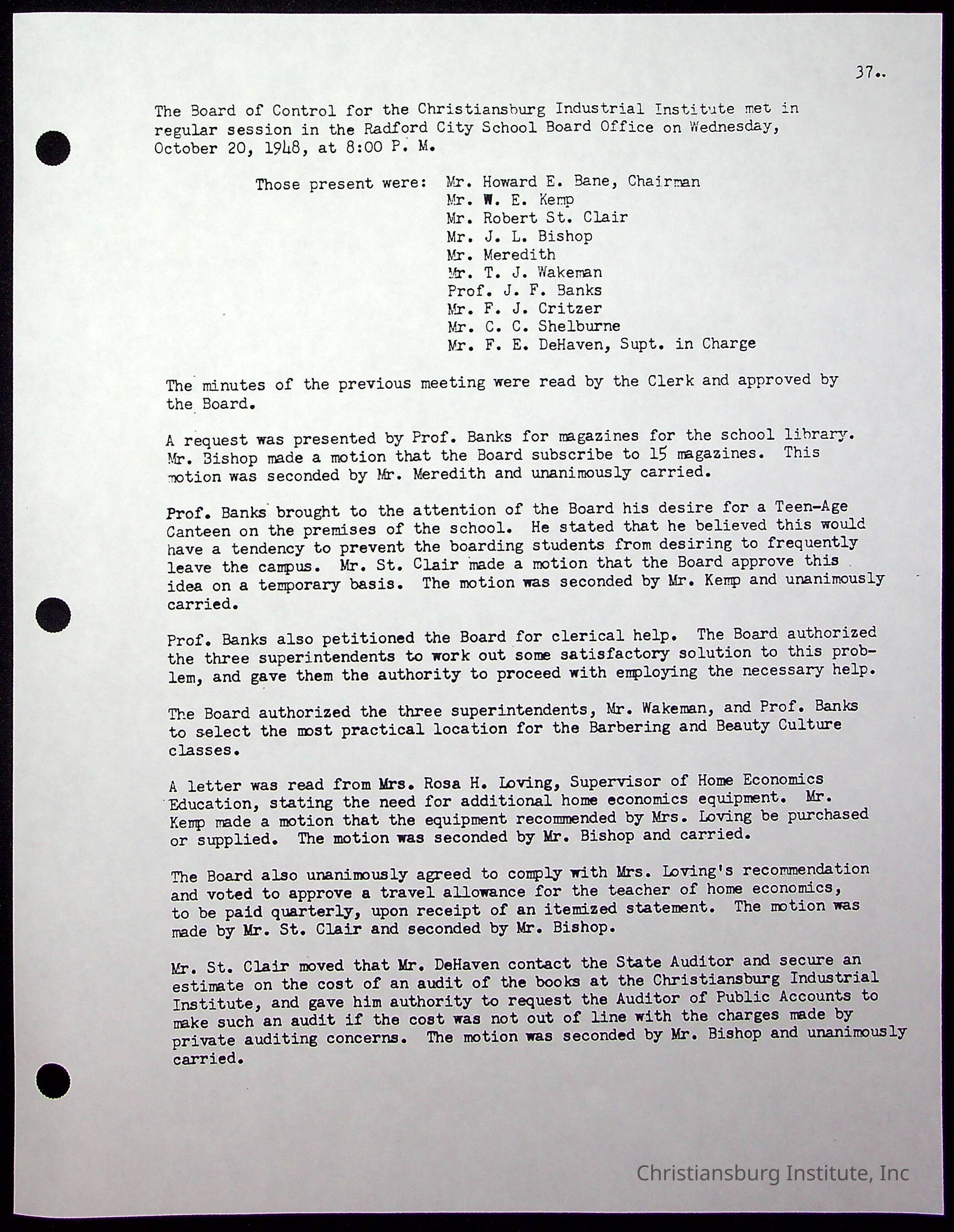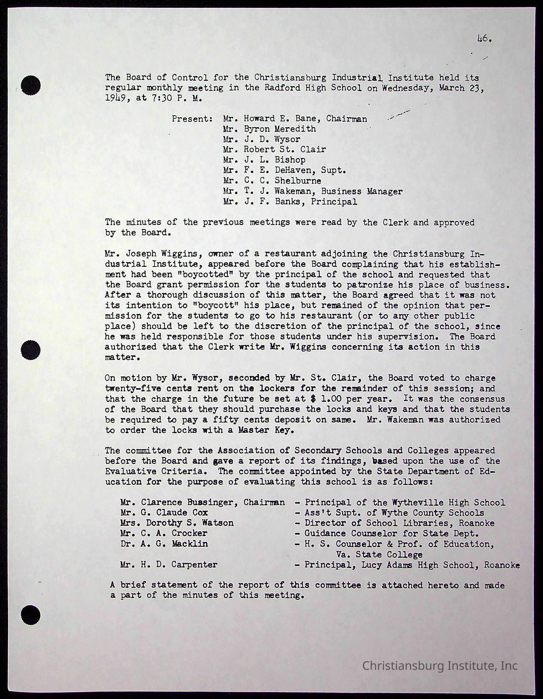 Christiansburg Industrial Institute Board Minutes, July 1947-August 1963 (photocopy)Description
