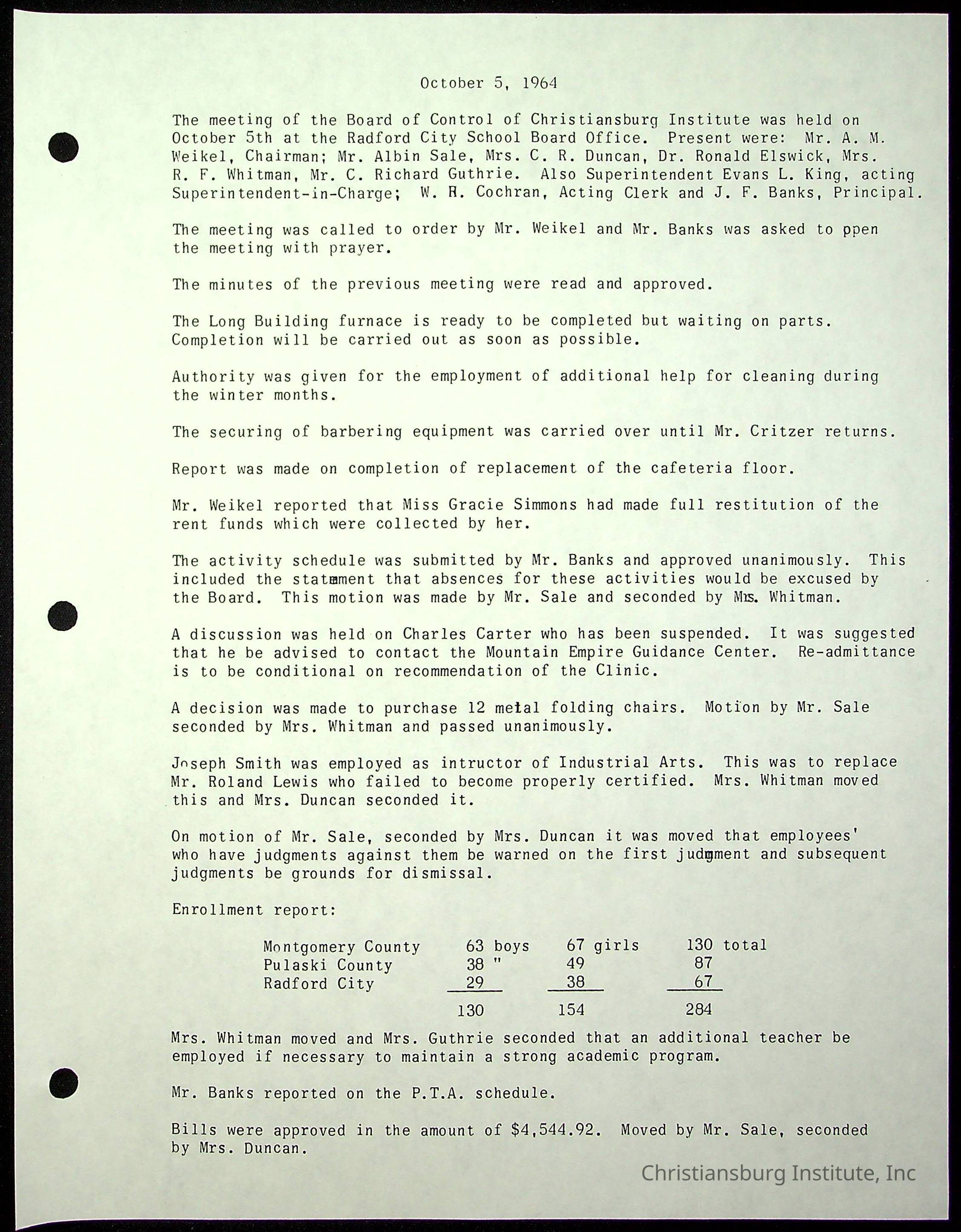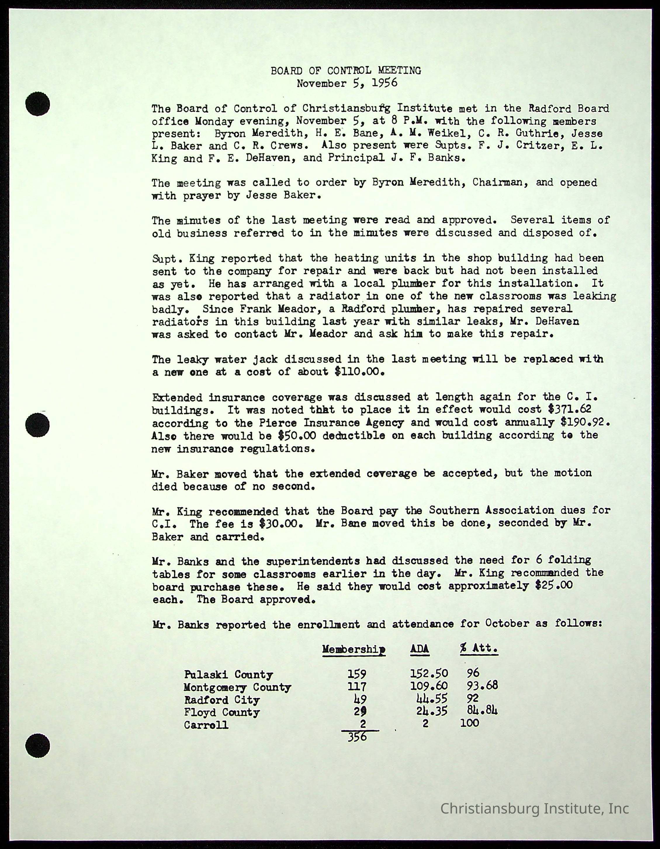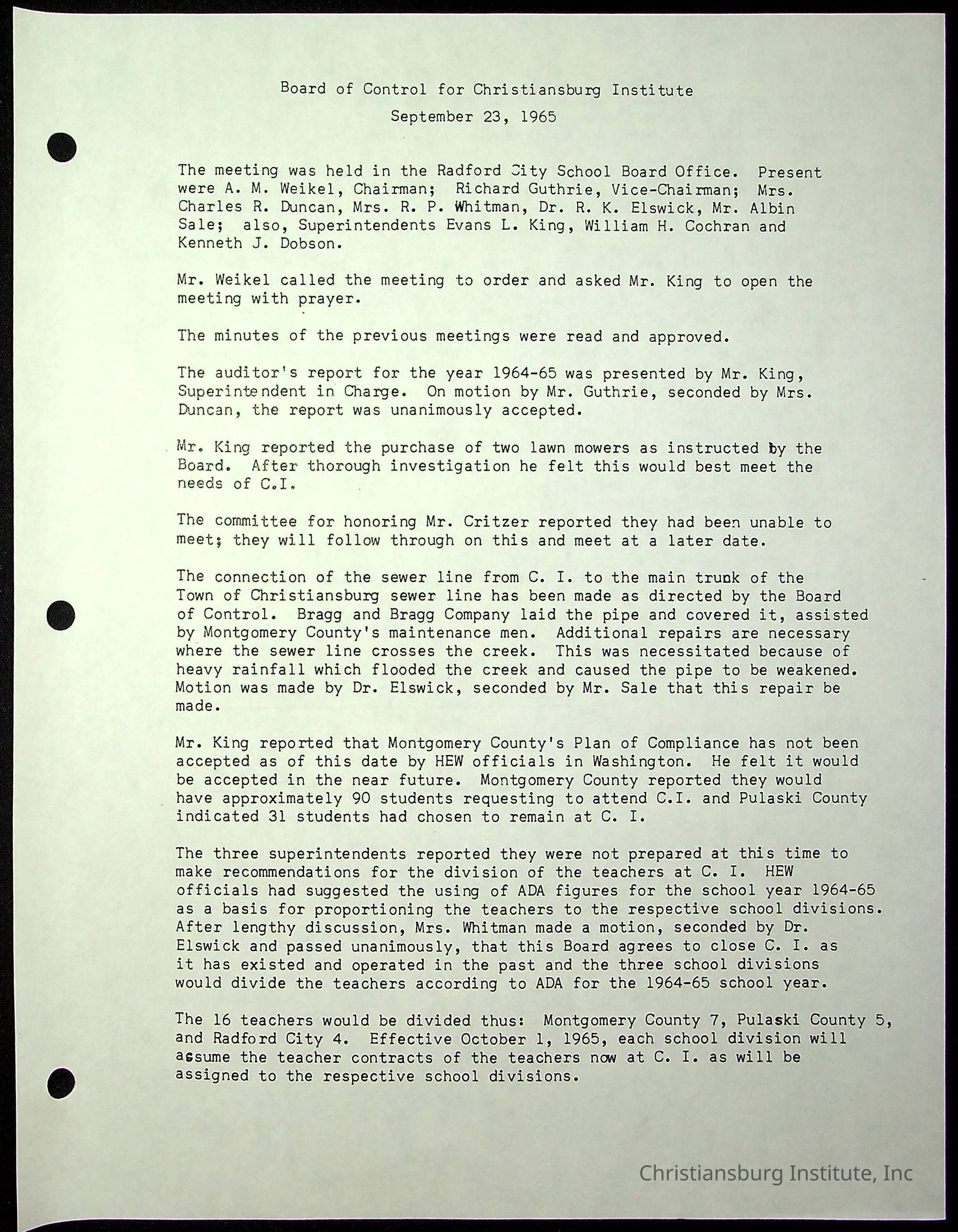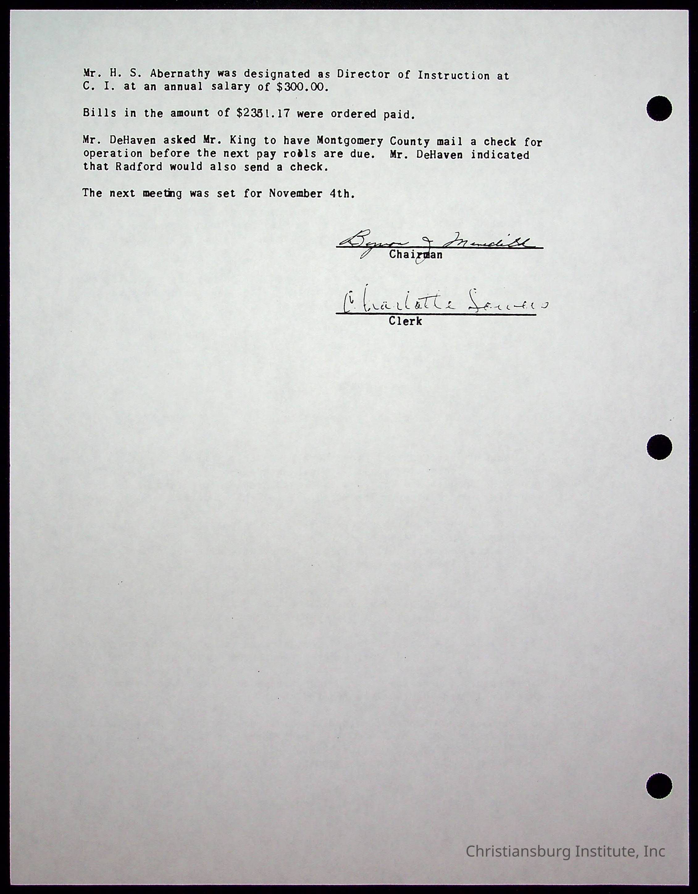 Christiansburg Industrial Institute Board Minutes, July 1947-August 1963 (photocopy)Description