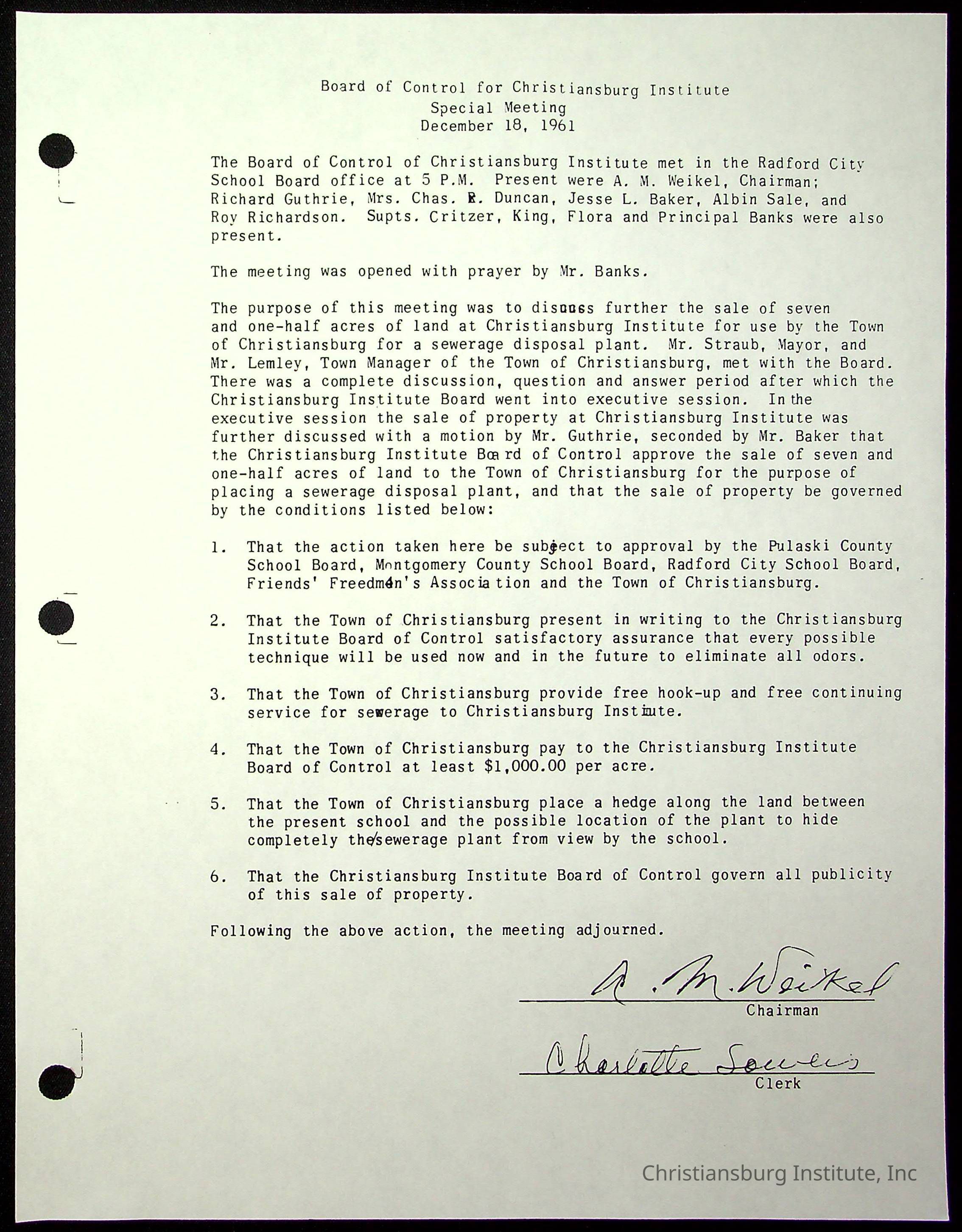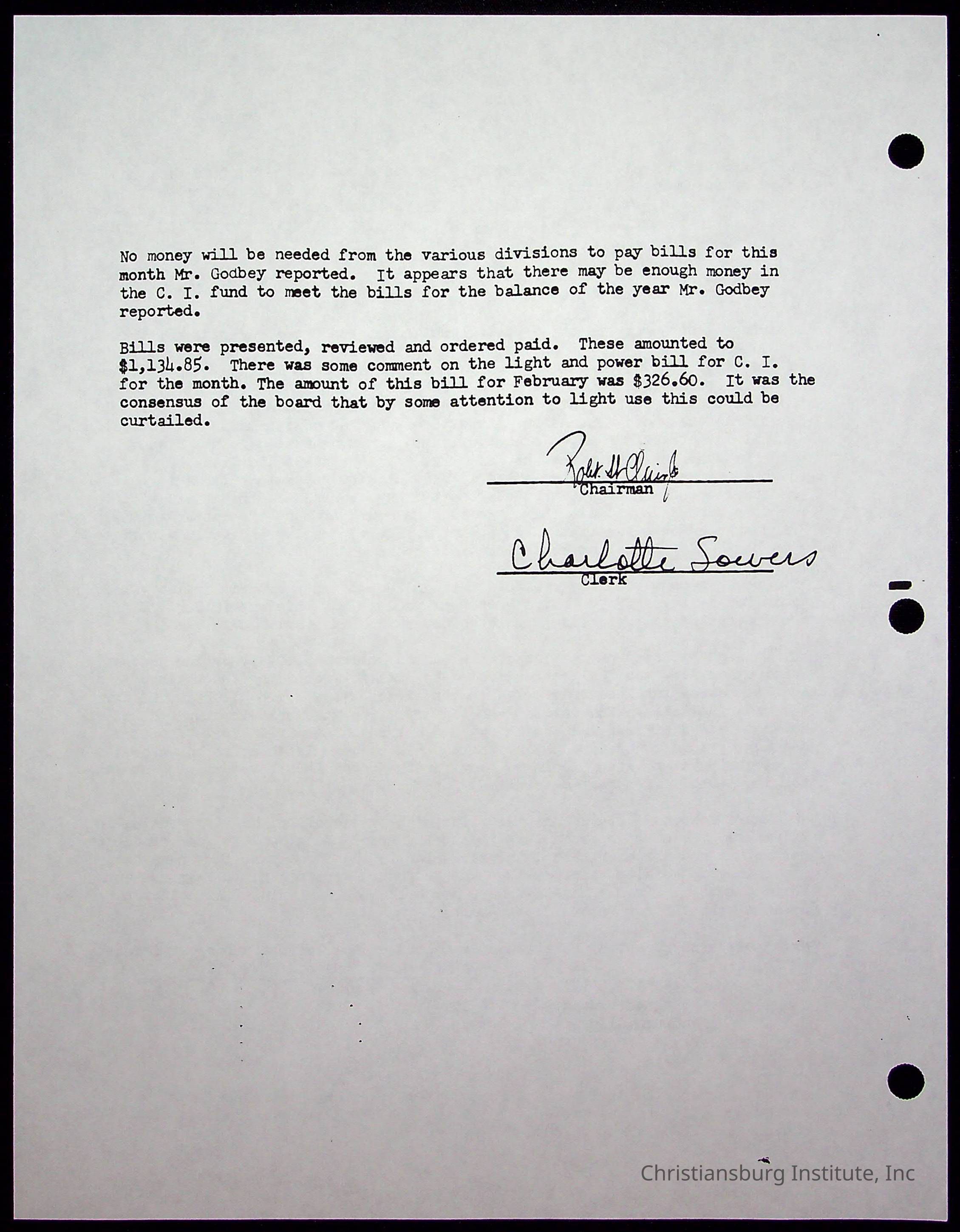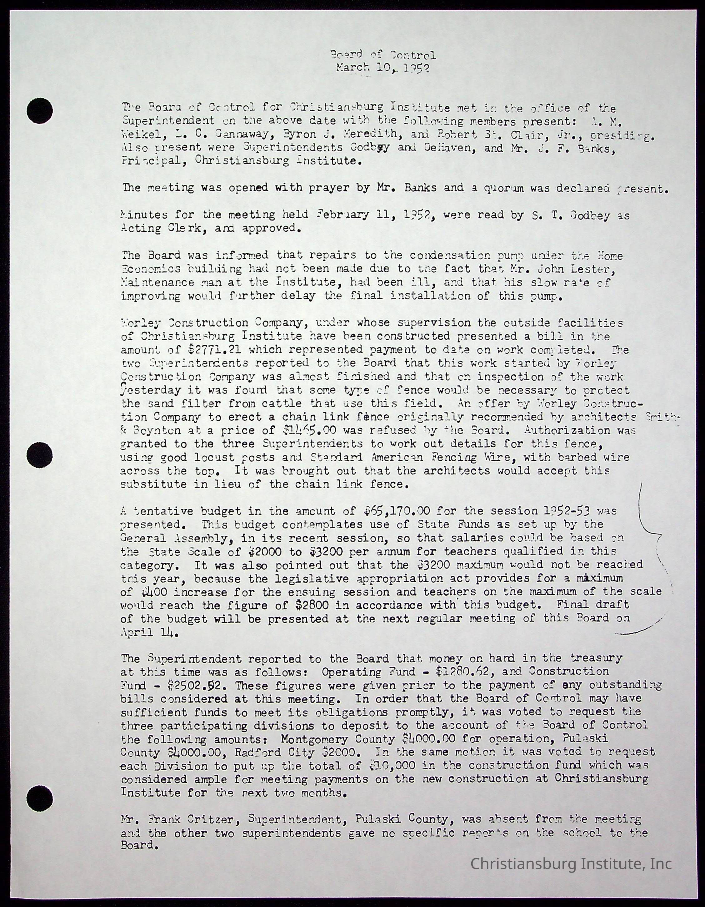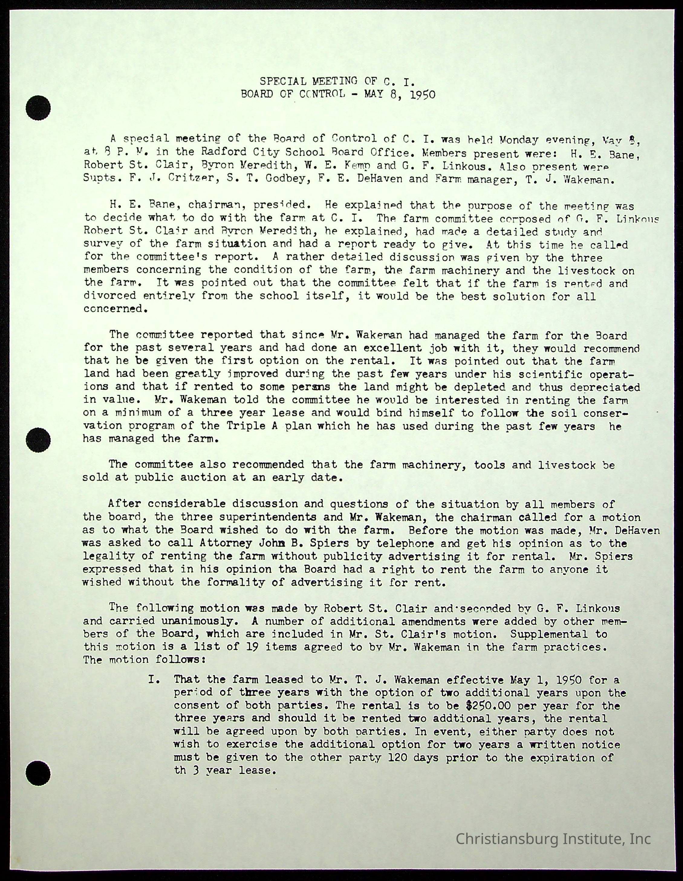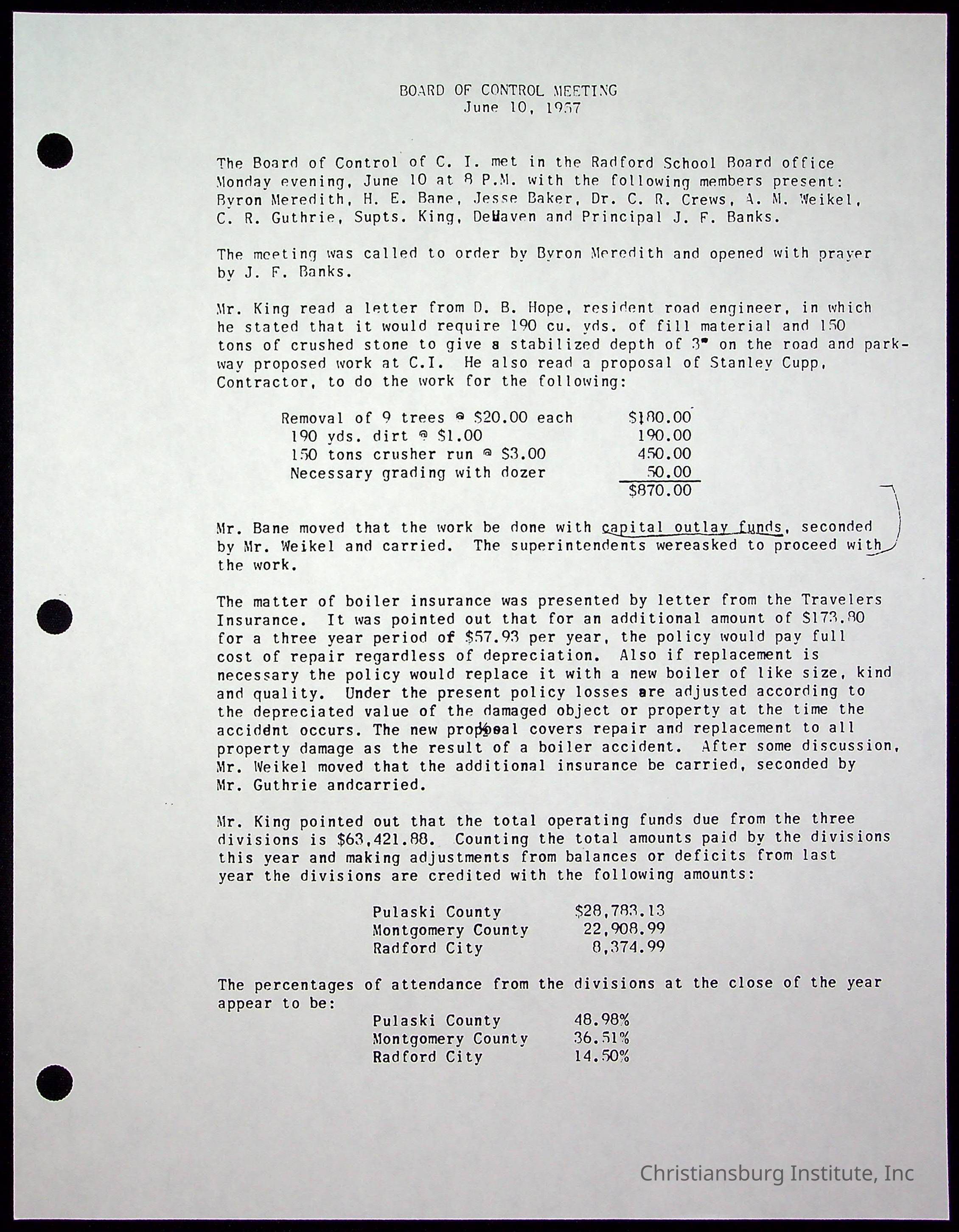 A binder of a photocopy version of the Christiansburg Industrial Institute board minutes from July 1947 through August 1963.Creator