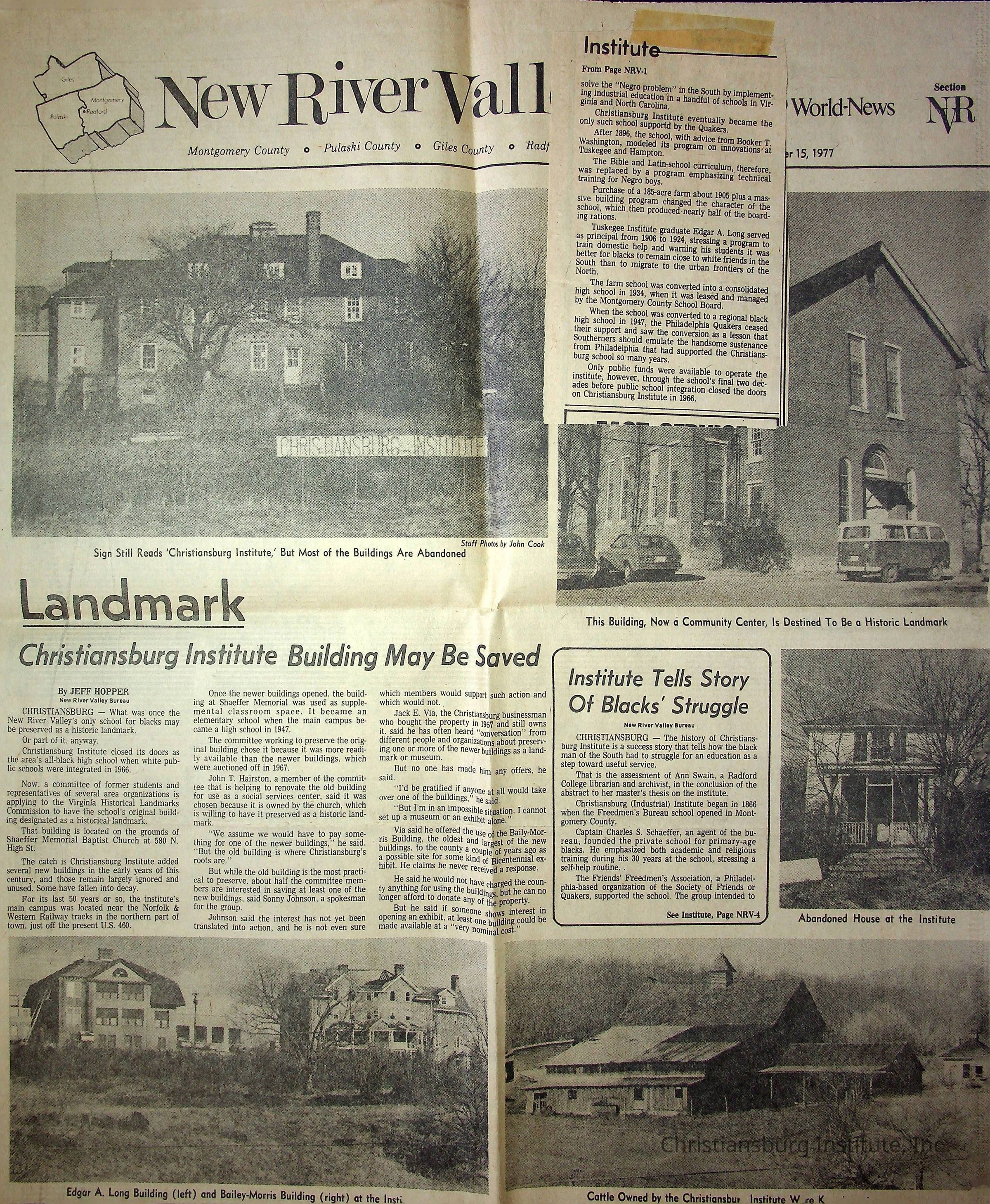 A collection of newspaper articles that feature stories about Christiansburg Institute dates range from 1913 through 1978. These articles come from various newspapers.Date(s) of Creation
