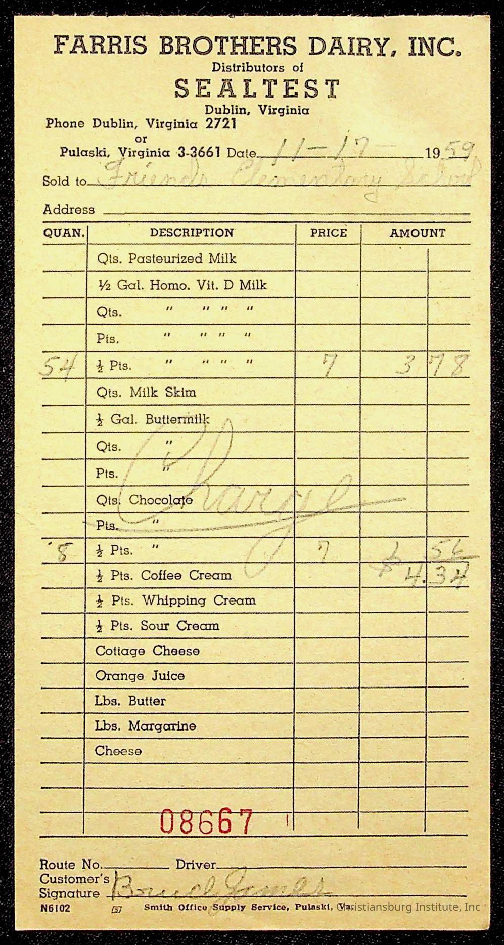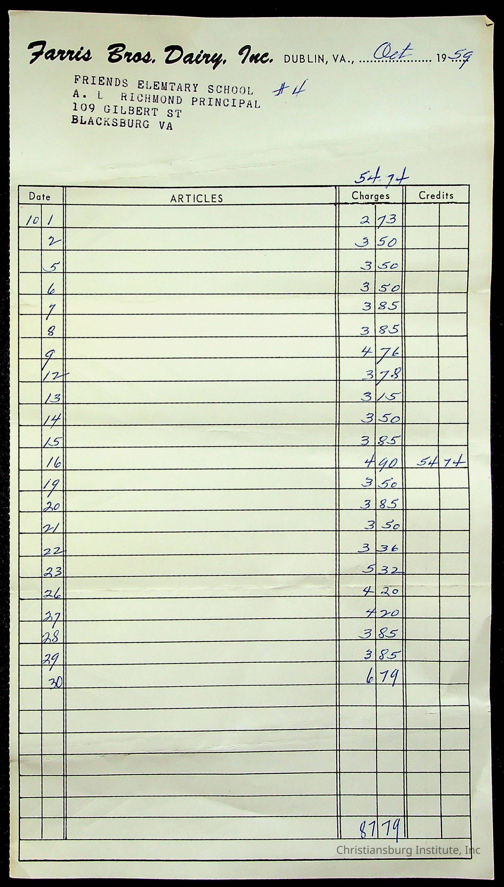 An archive of various receipts and bills for Friends Elementary School, circa 1950s-1960s.Collection