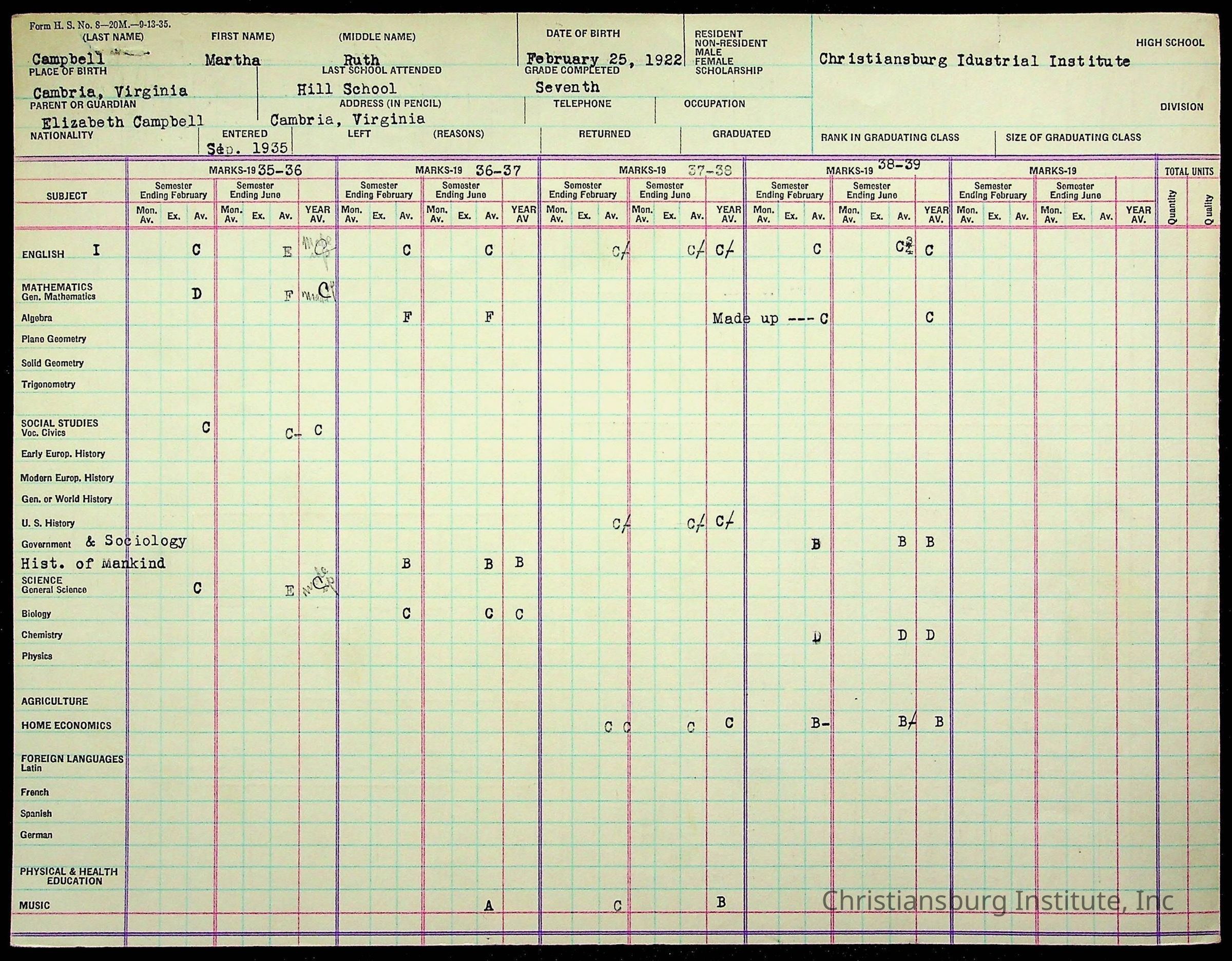The student file for the Christiansburg Institute student, Martha Ruth Campbell circa 1930s.