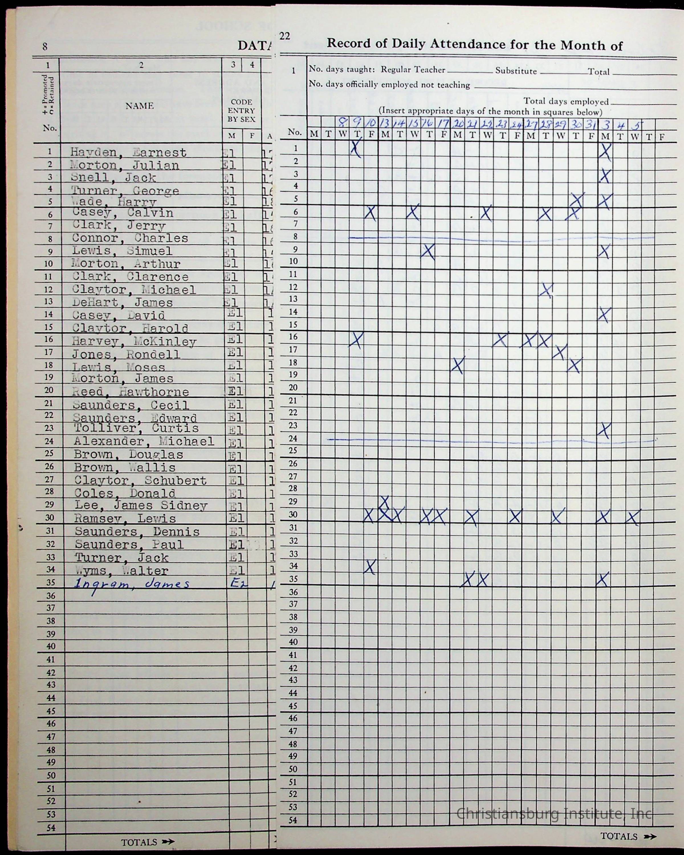 Hattie E. Clemons' Virginia teacher's register book for the school year 1960-1961 for Radford boy students at Christiansburg Institute including information about her students, their attendance, and course grades.Collection