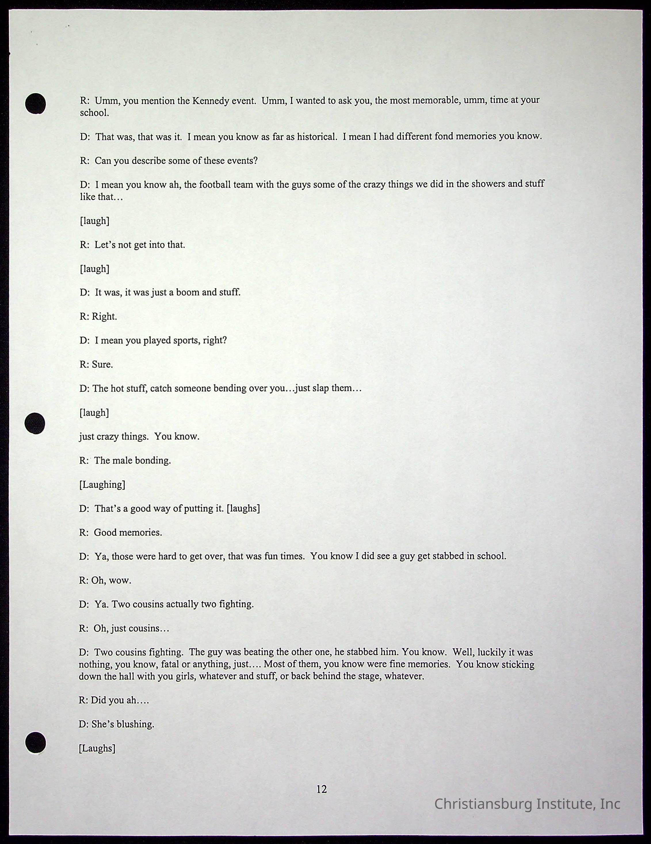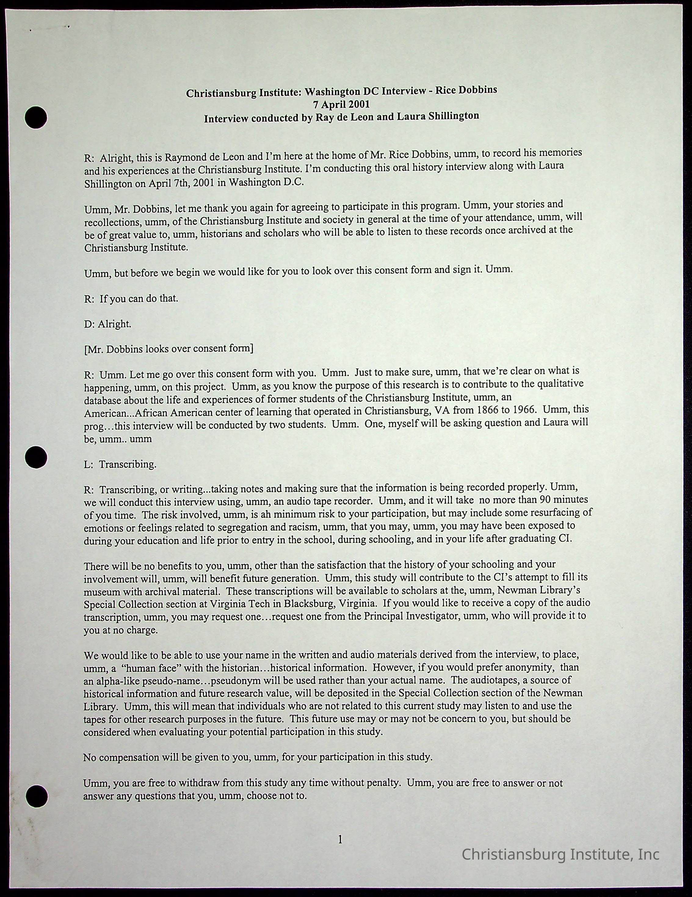 An oral history with Christiansburg Institute alumni, Rice Dobbins Jr conducted by Ray de Leon and Laura Shillington on April 7th, 2001.
