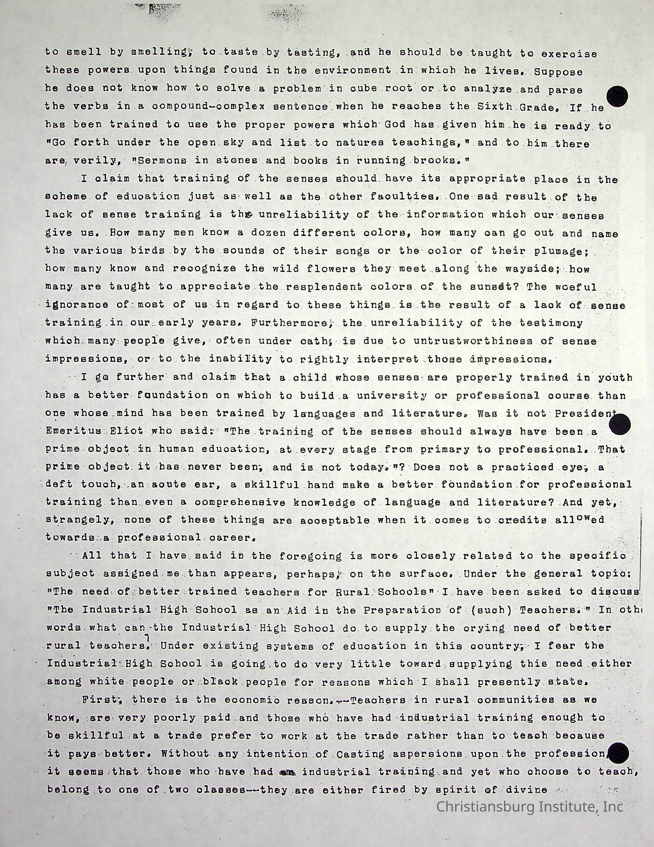 A photocopy version of a typed speech written by Edgar A. Long titled 'Industrial High School' spoken at the State Teachers Association in 1916. Gifted by Carlton Banks in 2001.Creator