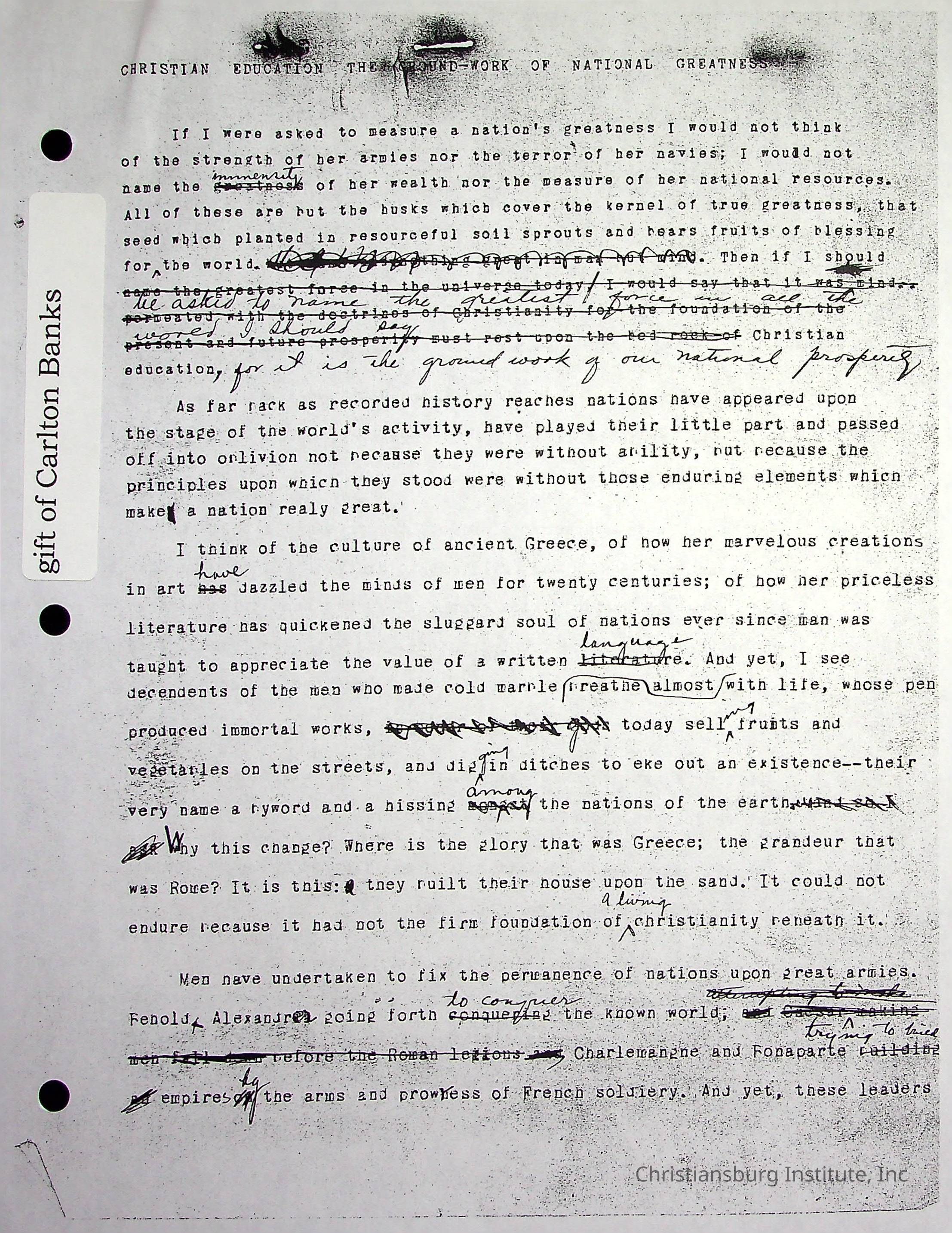 A photocopy version of a typed document written by Edgar A. Long titled 'Christian Education' that is undated. Gifted by Carlton Banks in 2001.Creator