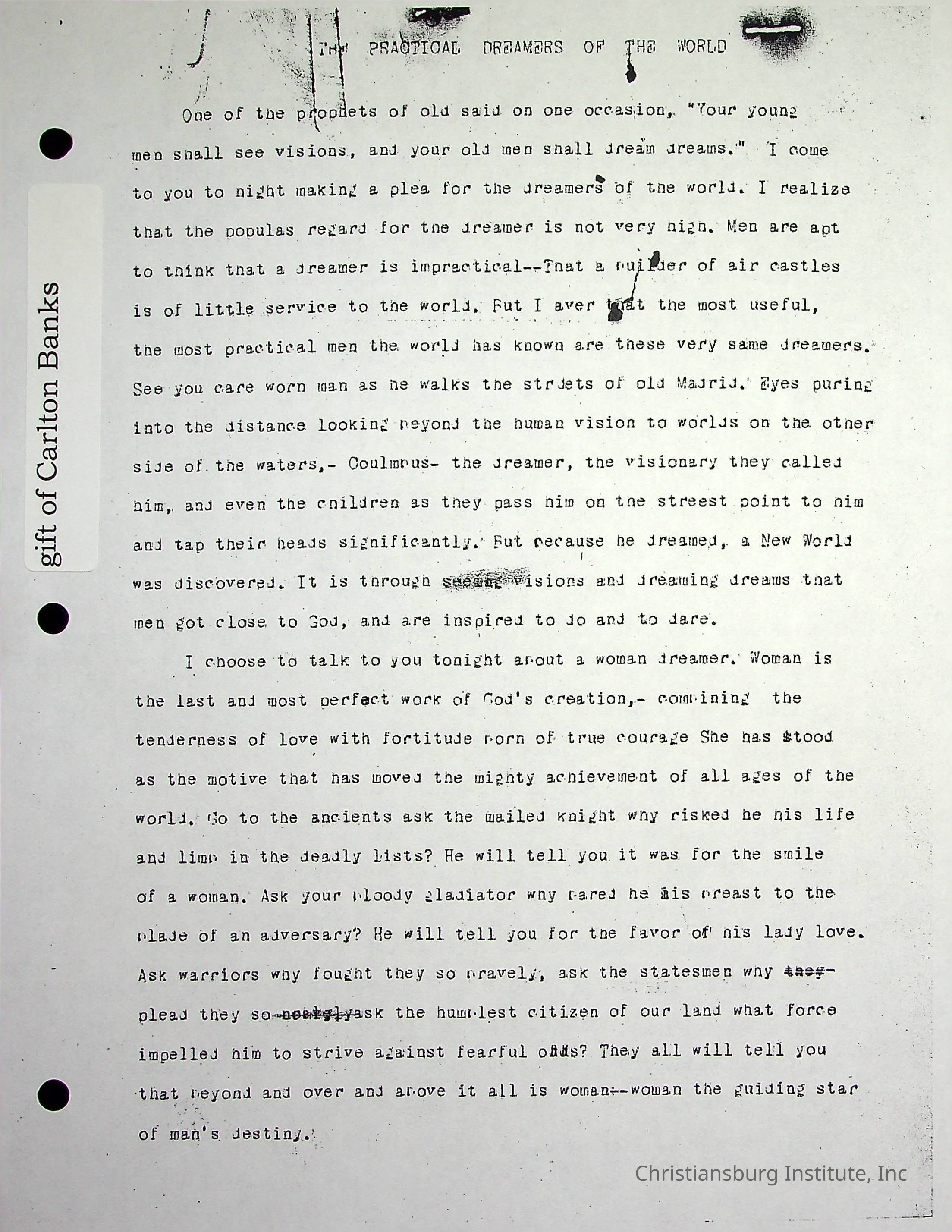A photocopy version of a typed document written by Edgar A. Long titled 'Practical Dreamers' that is undated. Gifted by Carlton Banks in 2001.Collection