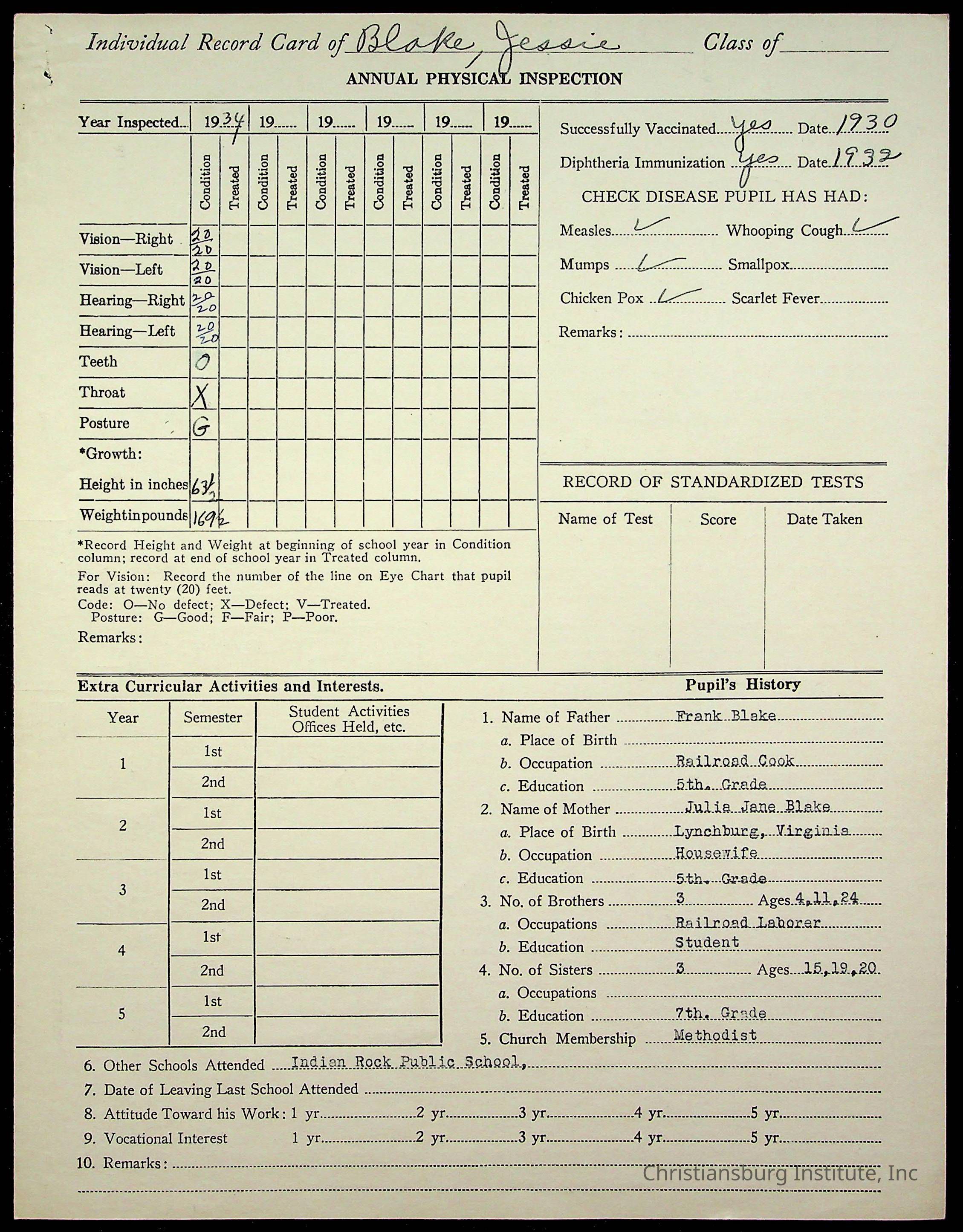 The student file for the Christiansburg Institute student, Jessie Maxie Blake circa 1930s.