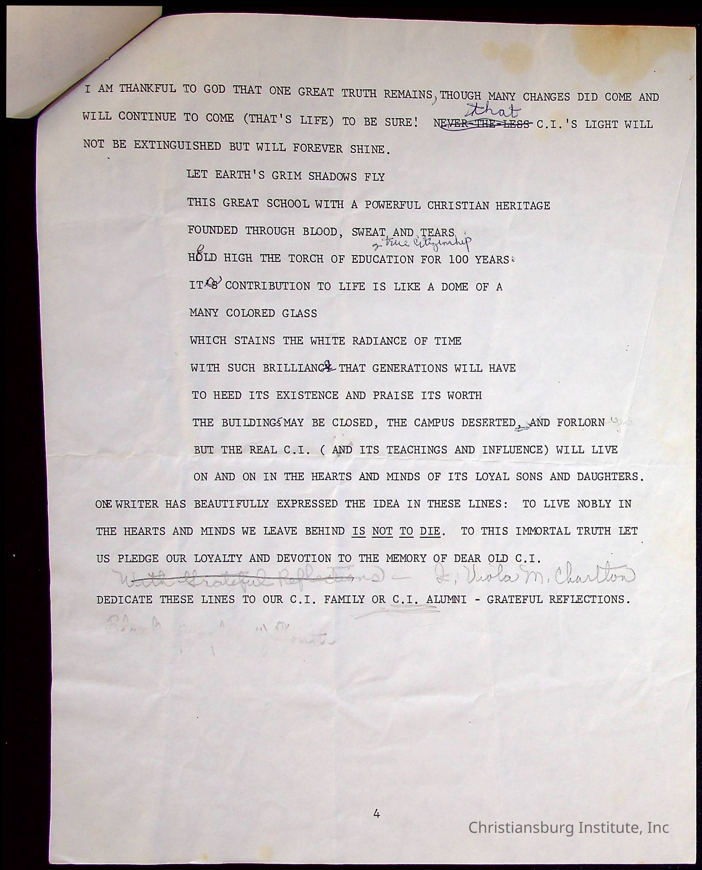 A typed speech presented at the Christiansburg Institute Alumni Association reunion, written and spoken by former Christiansburg Institute teacher, Viola Charlton, undated.Collection