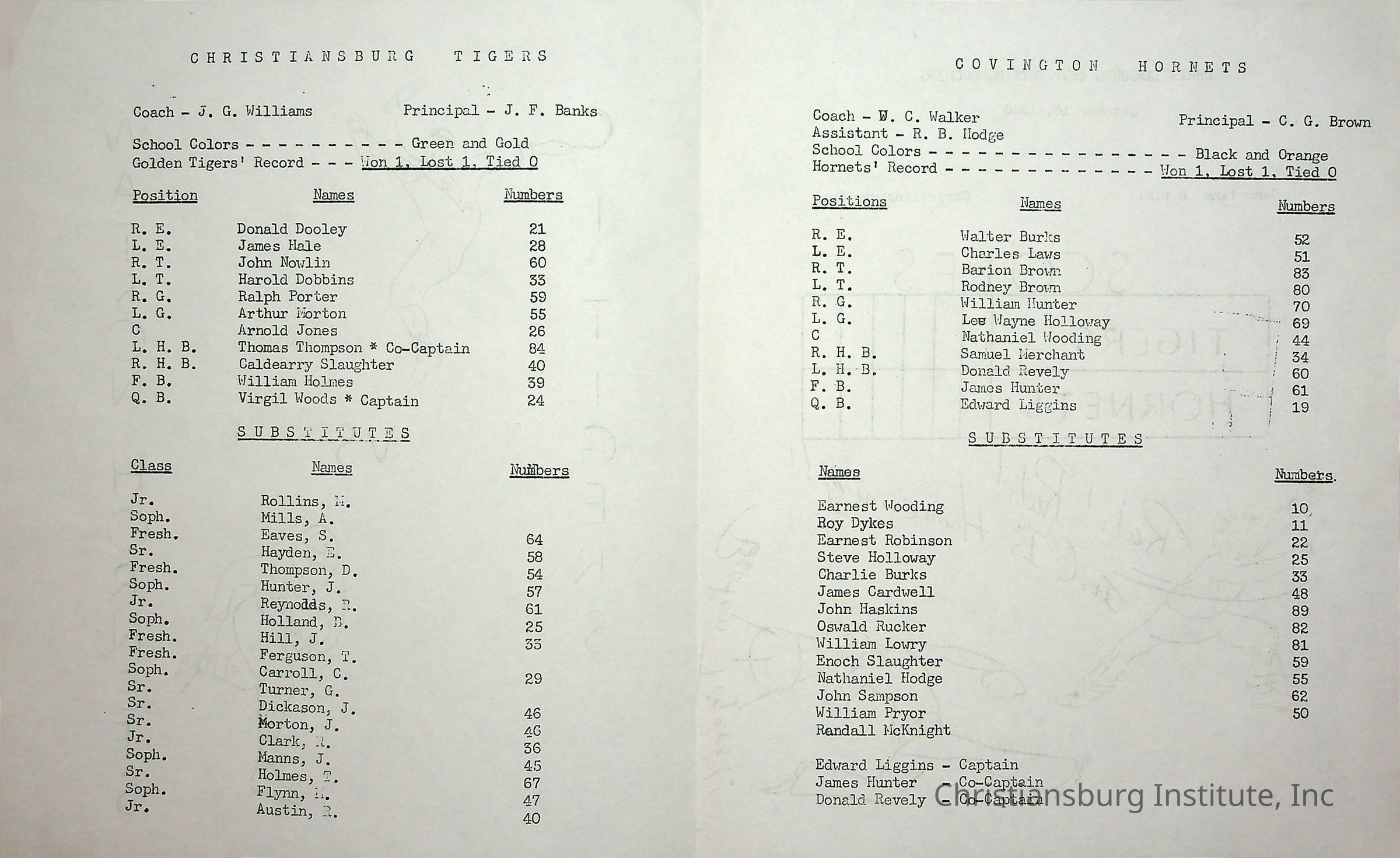 An event program for Christiansburg Institute's football homecoming on October 14th, 1960. This football game was played against the Covington Hornets at Christiansburg Park.Creator