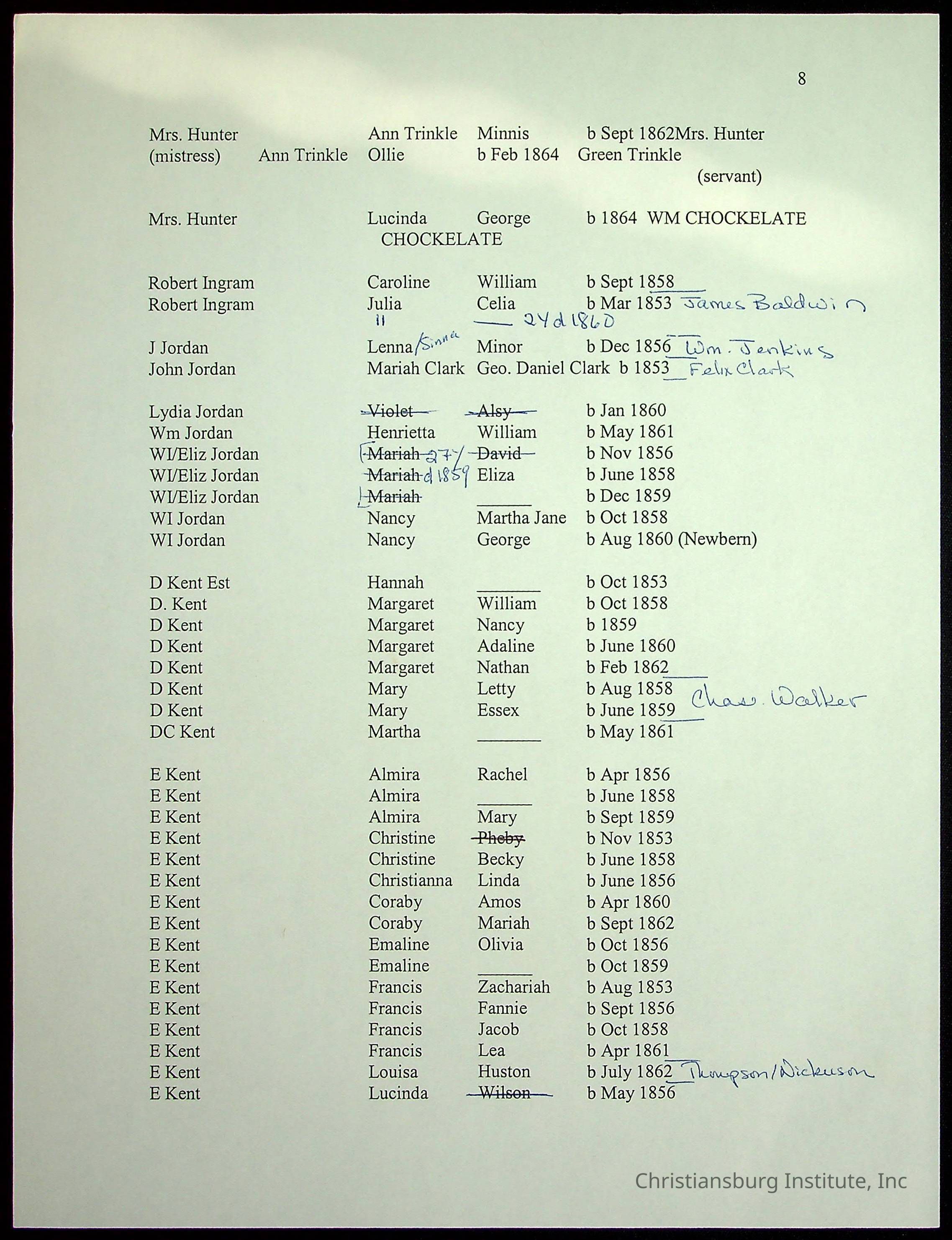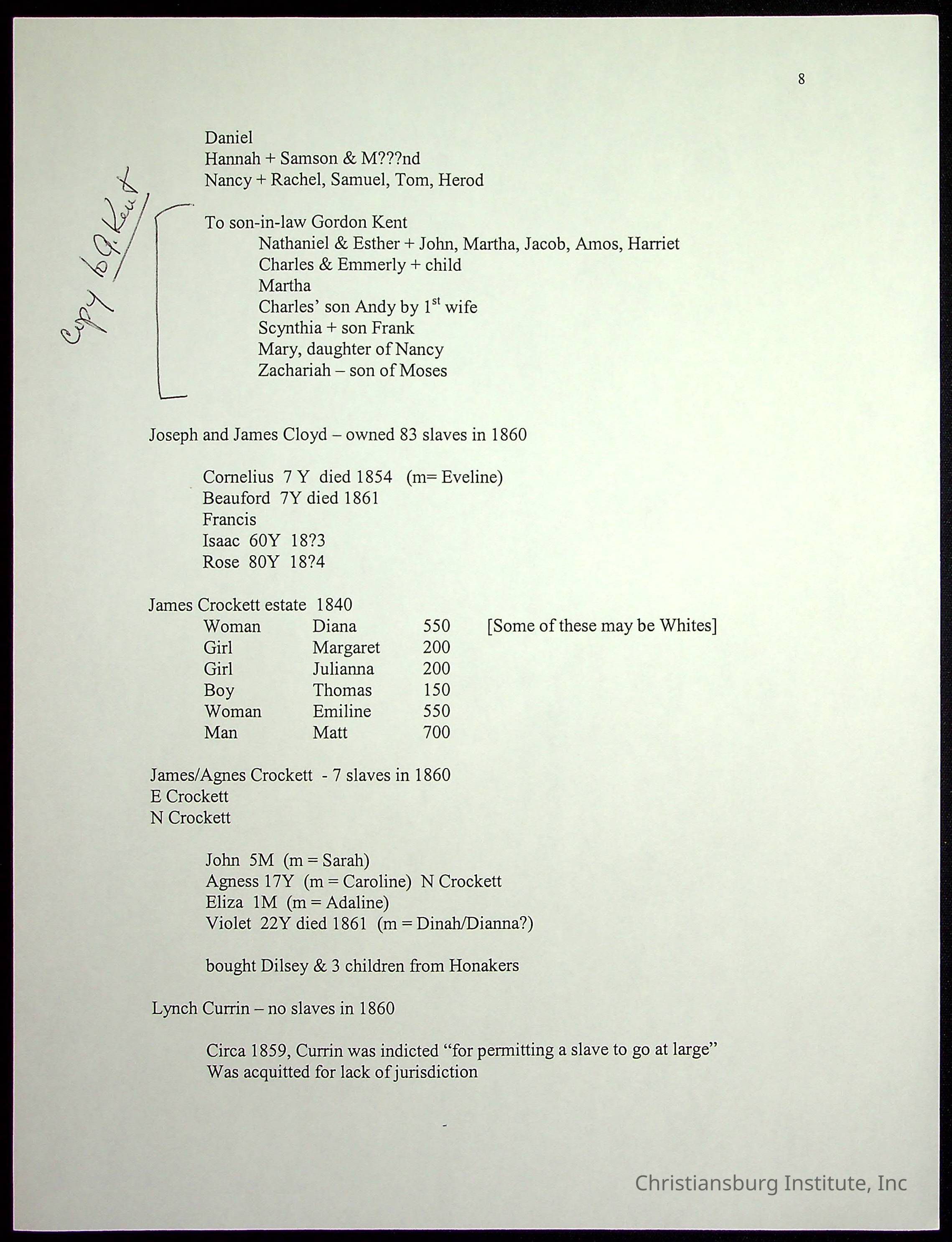 A folder of research materials collected by Radford University professor, Dr Linda Killen. This folder is titled 'Pulaski Slaves/Owners' and includes Killen's research on the enslaved population and their owners from Pulaski County, Virginia. Please note: some of the documents were damaged by fire.