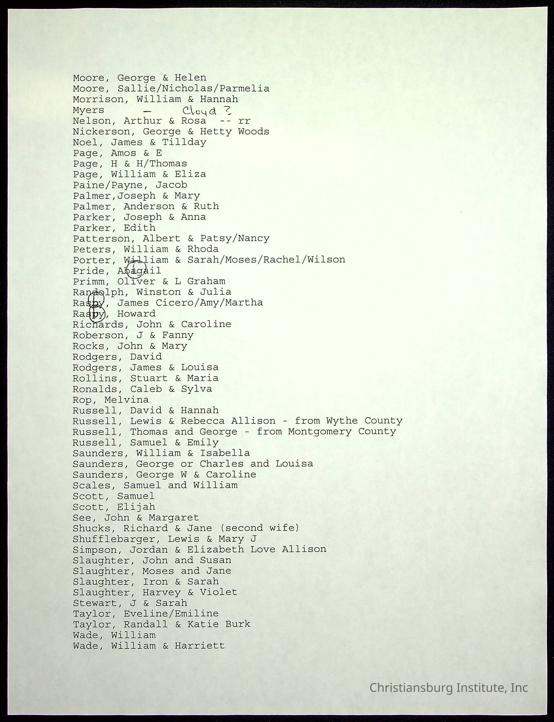 Farm Land, Boom Town, Village: A History of Belspring, Virginia, 1750-1940, The Reports of Charles S. Schaeffer from the Virginia counties of Montgomery and Pulaski, with additional information on the counties of Floyd, Giles, Craig, Wythe, and Roanoke., Ingles Ferry Ledgers (1840s-1880s), These people lived in a pleasant valley, Making their mark: Black Families of New River Depot, 1870-1940., Whartons’ Town New River Depot, 1870-1940., Radford’s Early Black Residents, 1880-1925
