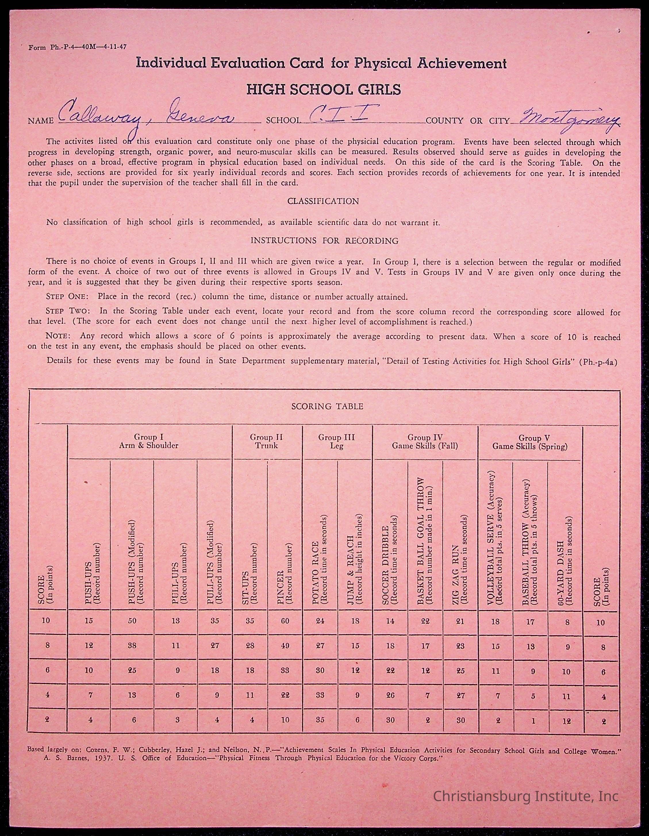 Christiansburg Institute, Montgomery County Public Schools, Calloway, Geneva