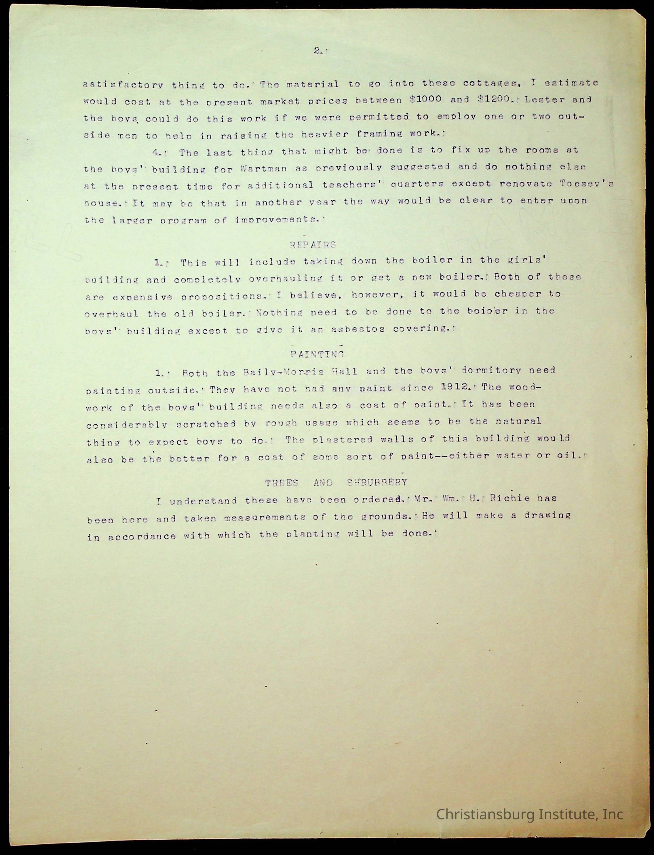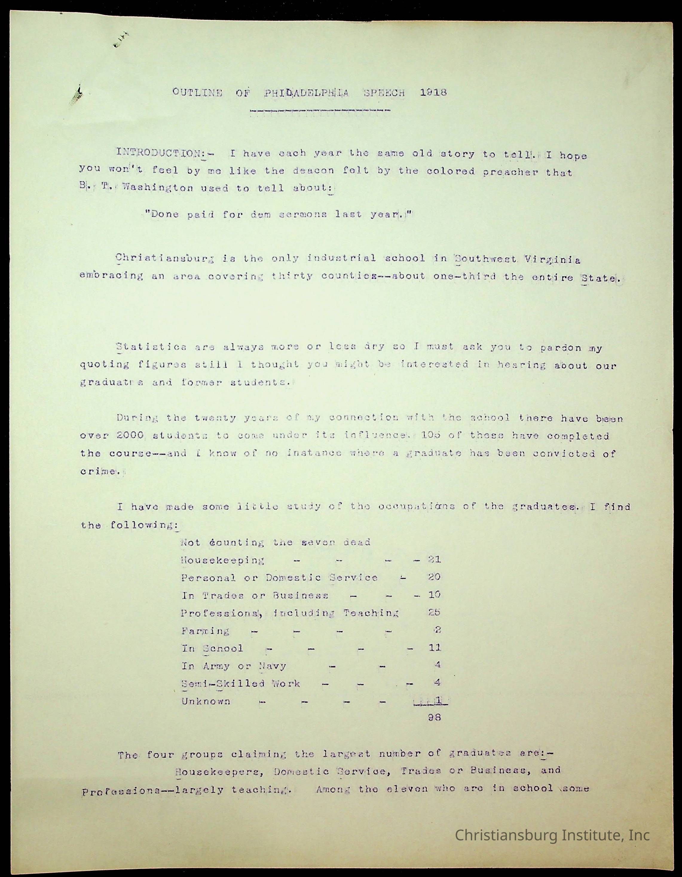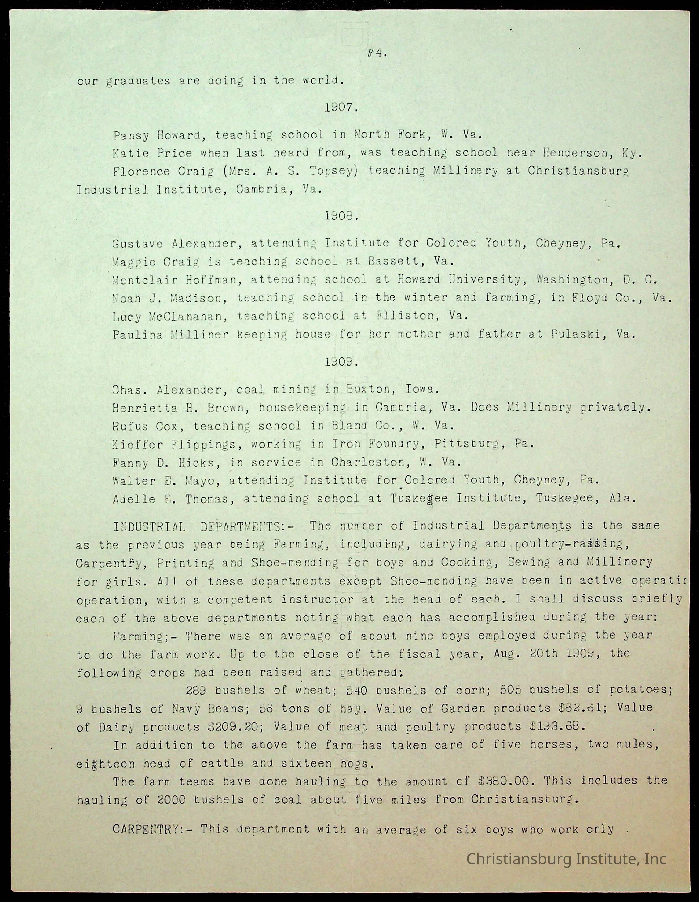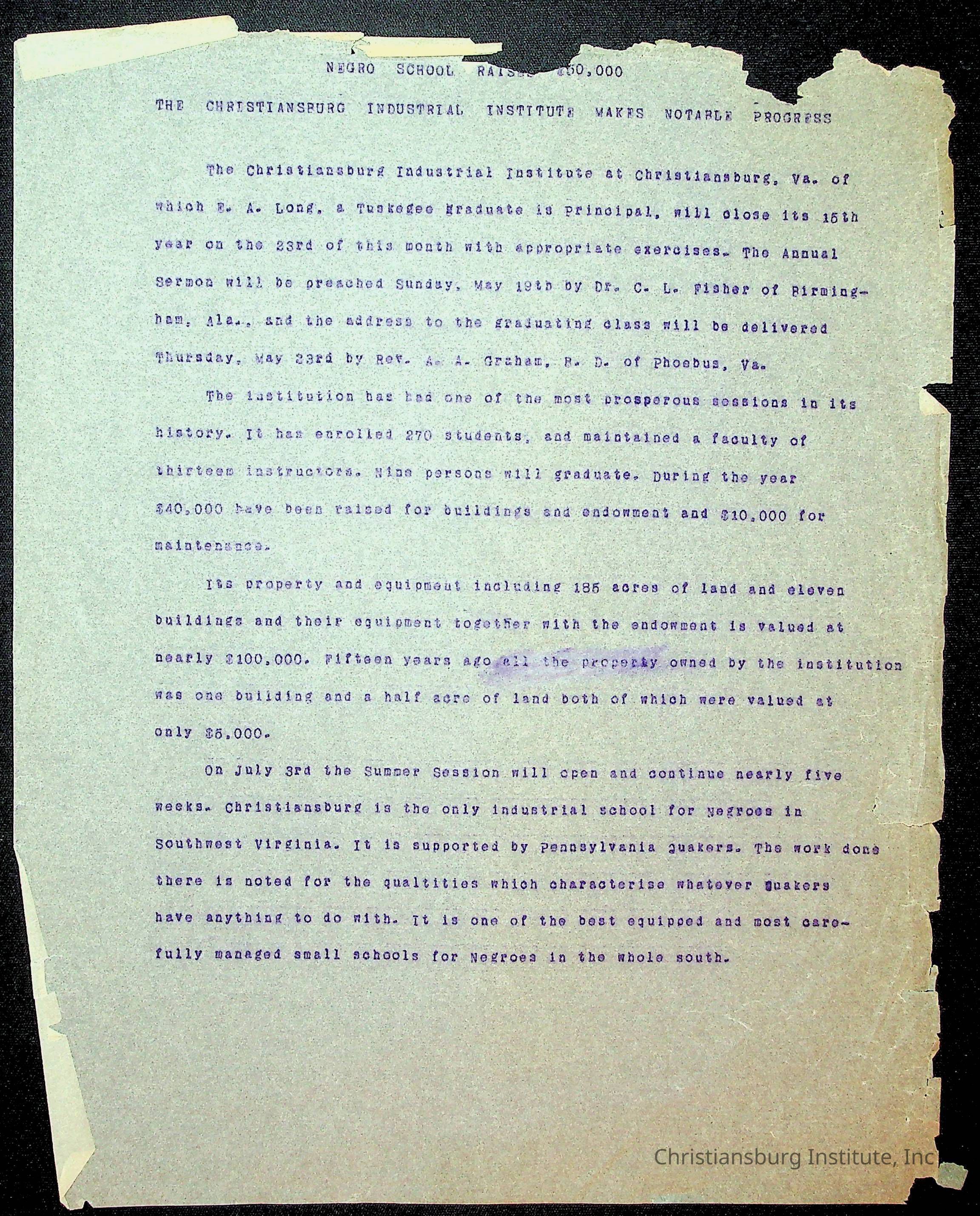 Copyright has been assigned to Christiansburg Institute Museum & Archives by Montgomery County Public Schools. For permission to publish materials created by the donor, contact CIMA@christiansburginstitute.com. Materials not created by Christiansburg Industrial Institute may still be under copyright.