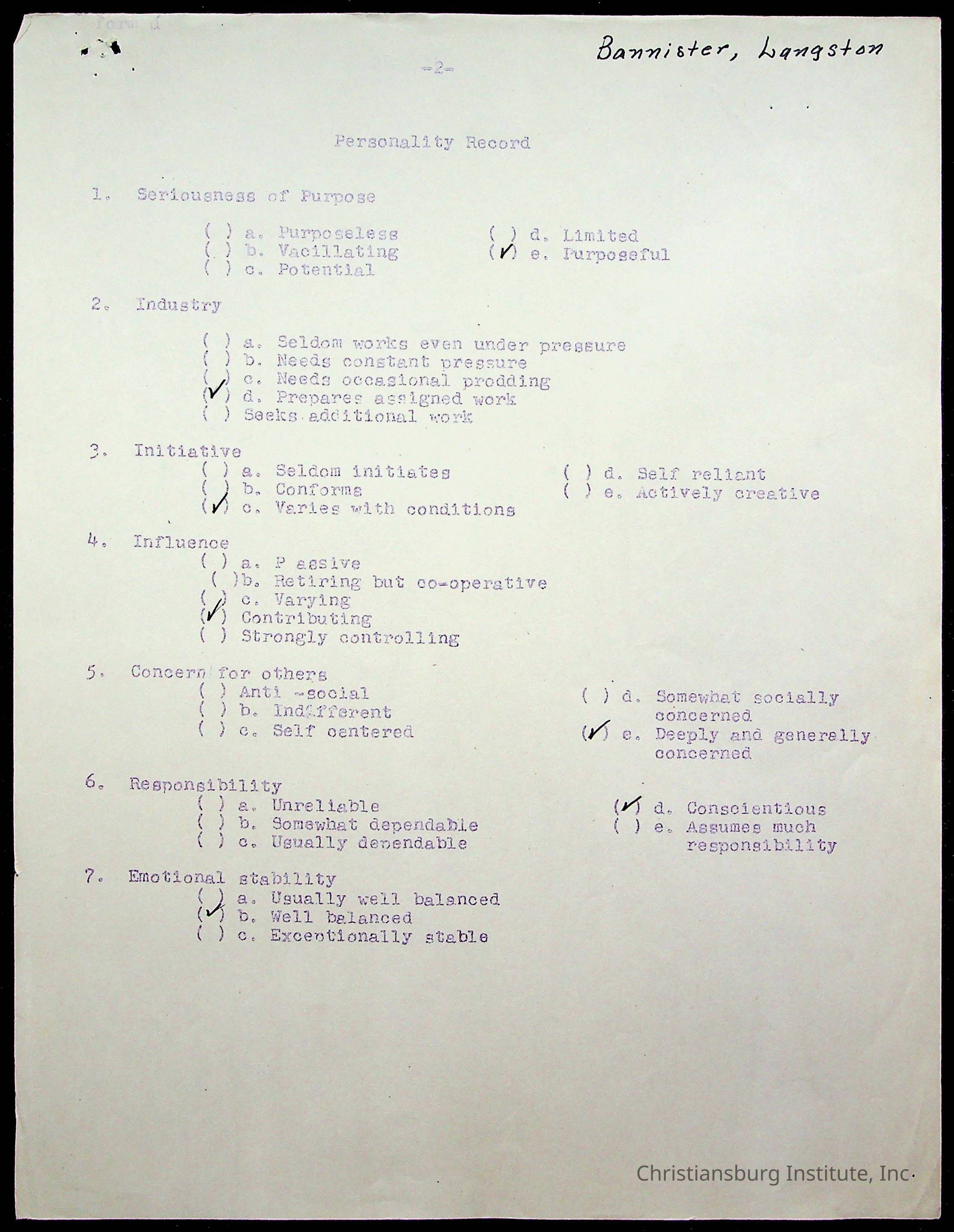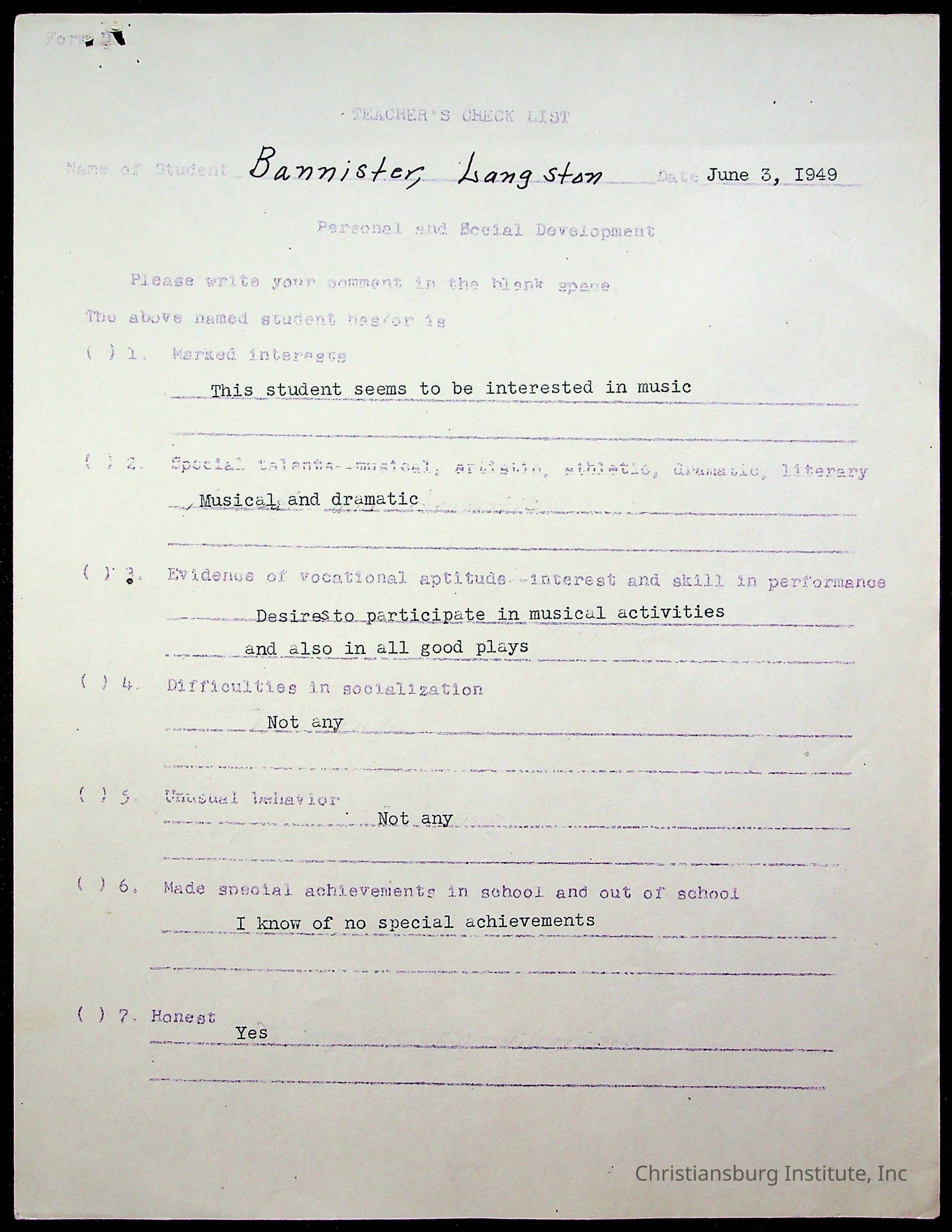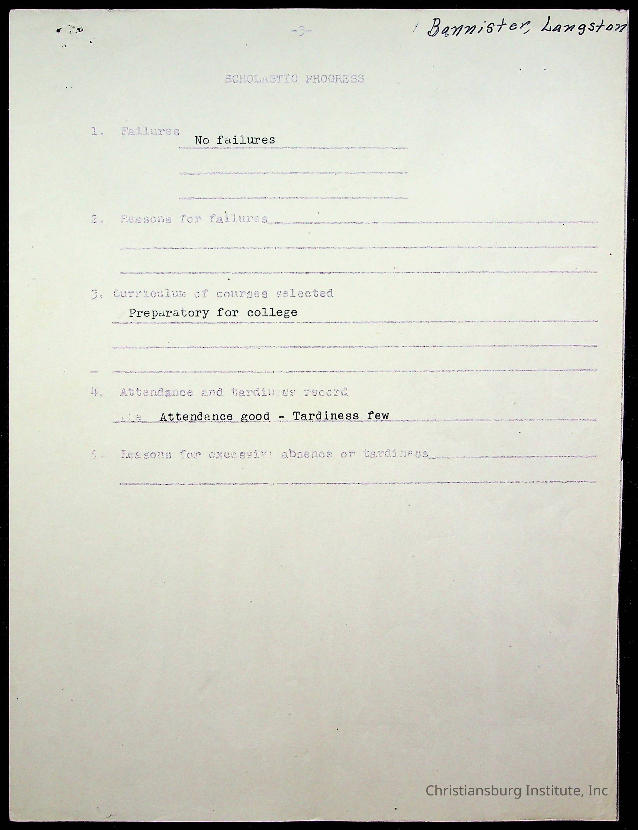 The student file for the Christiansburg Institute student, Langston Clinton Bannister circa 1940s.