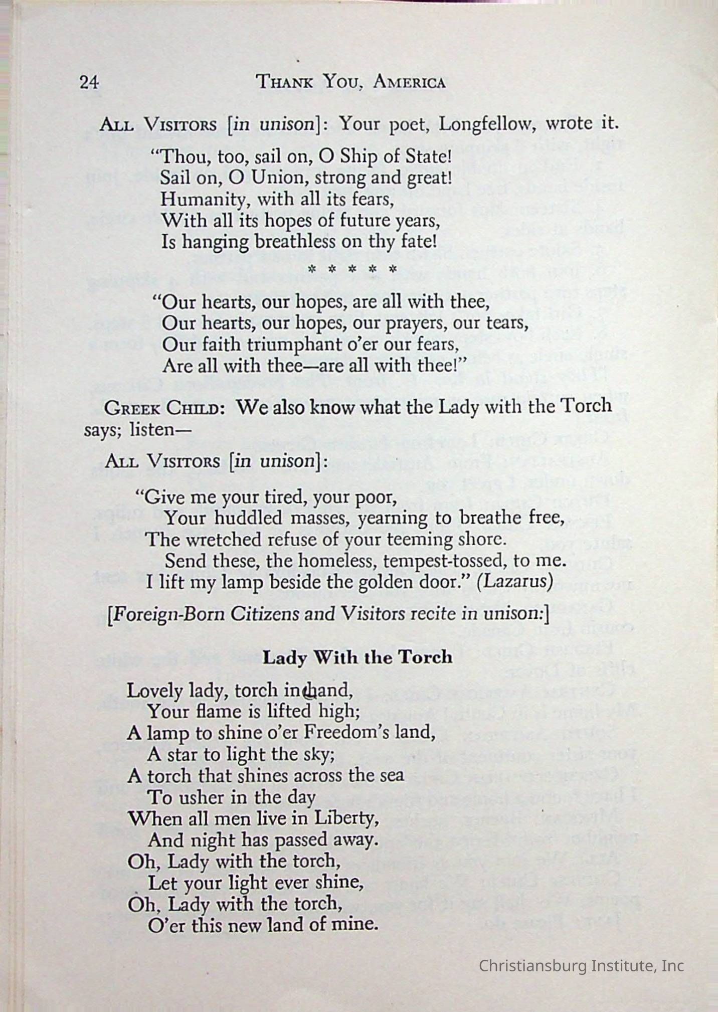 "Thank You, America: A Patriotic Pageant for a Large Group" a play written by Effa E. Preston and published by the Eldridge Entertainment House, Inc, undated. This playbill was owned by the Christiansburg Institute drama teacher, Viola Charlton.Collection