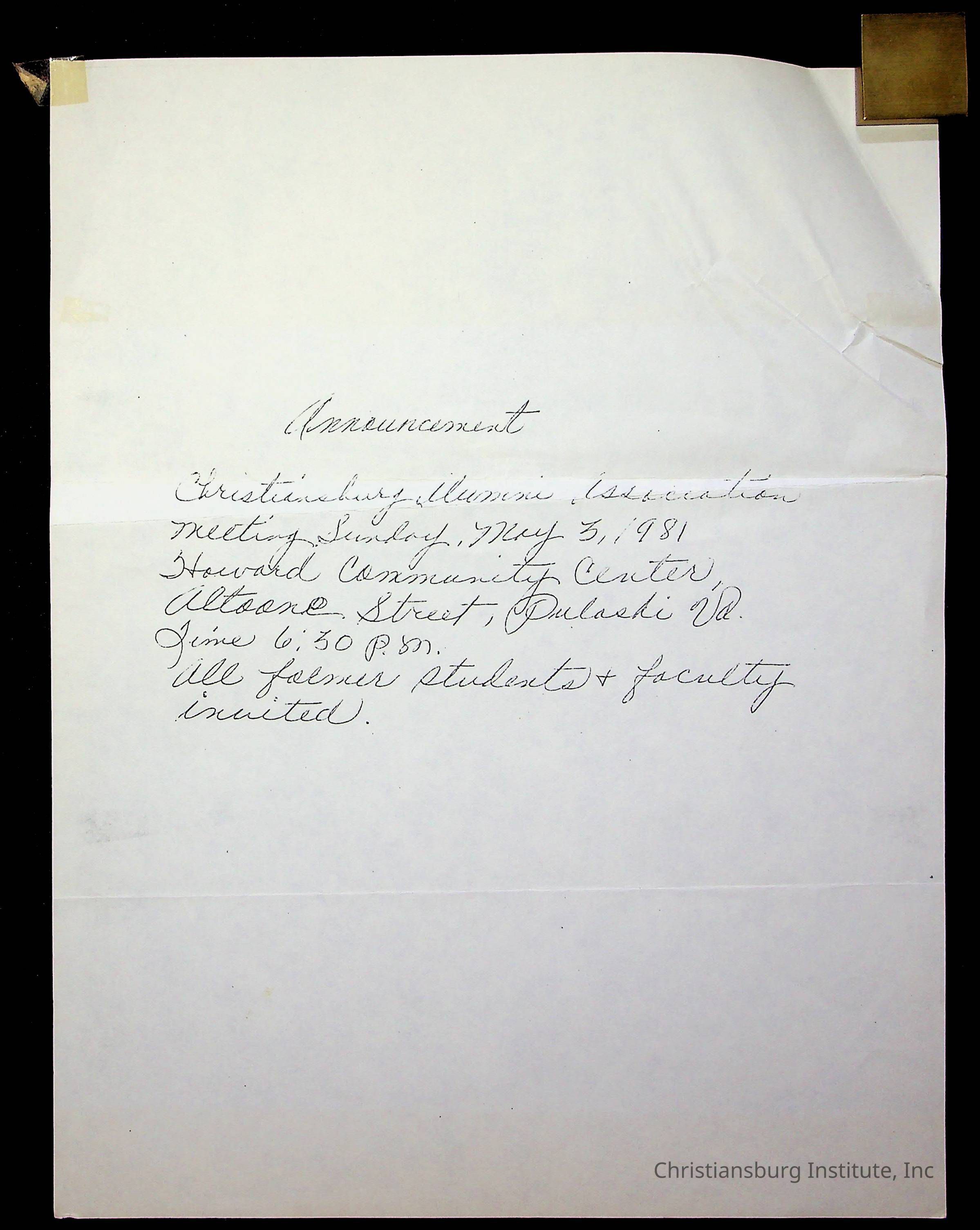 An archive of materials sent to CIAA member, Amanda DeHart and various miscellaneous materials pertaining to the Christiansburg Institute Alumni Association including announcements and receipts, undated.