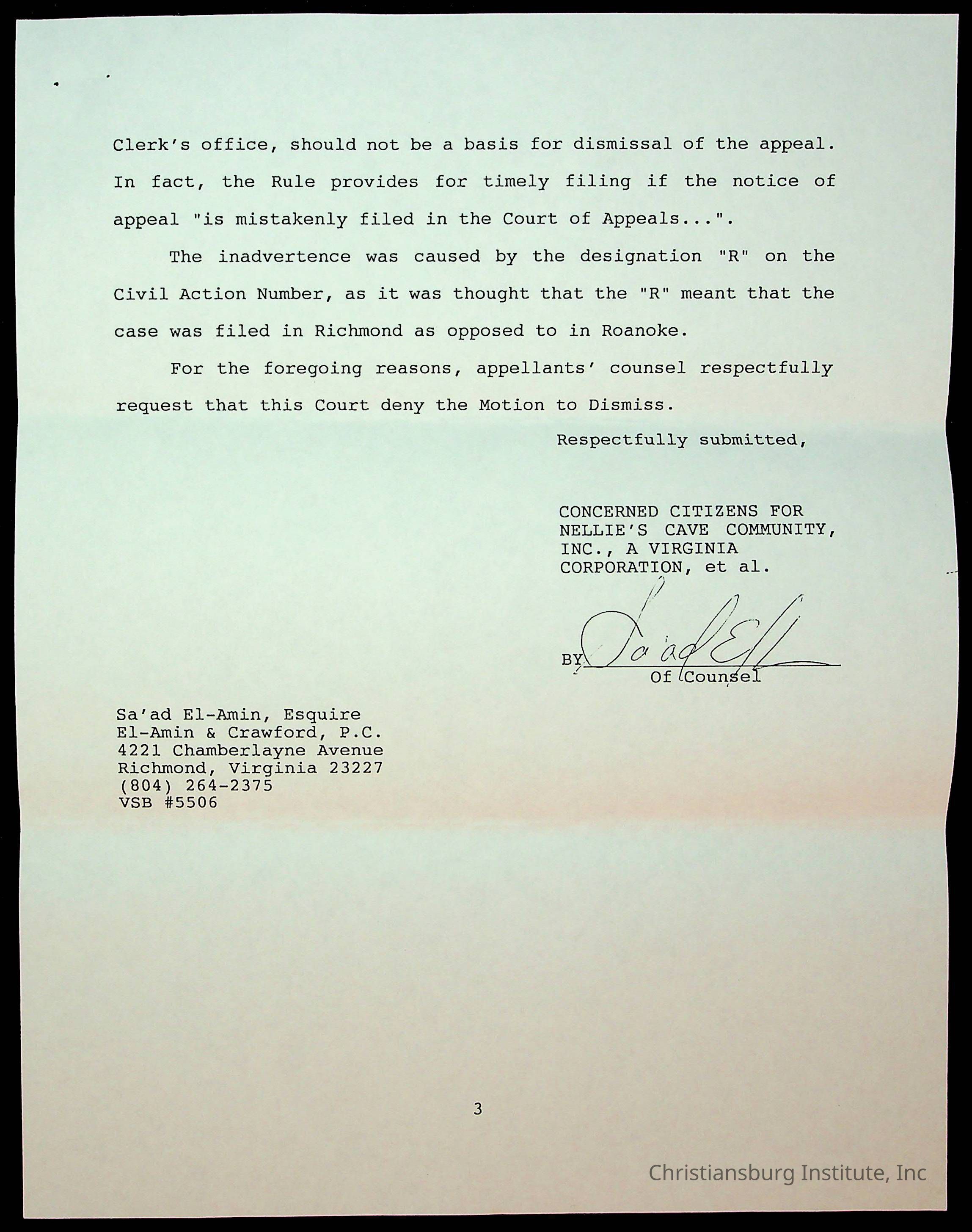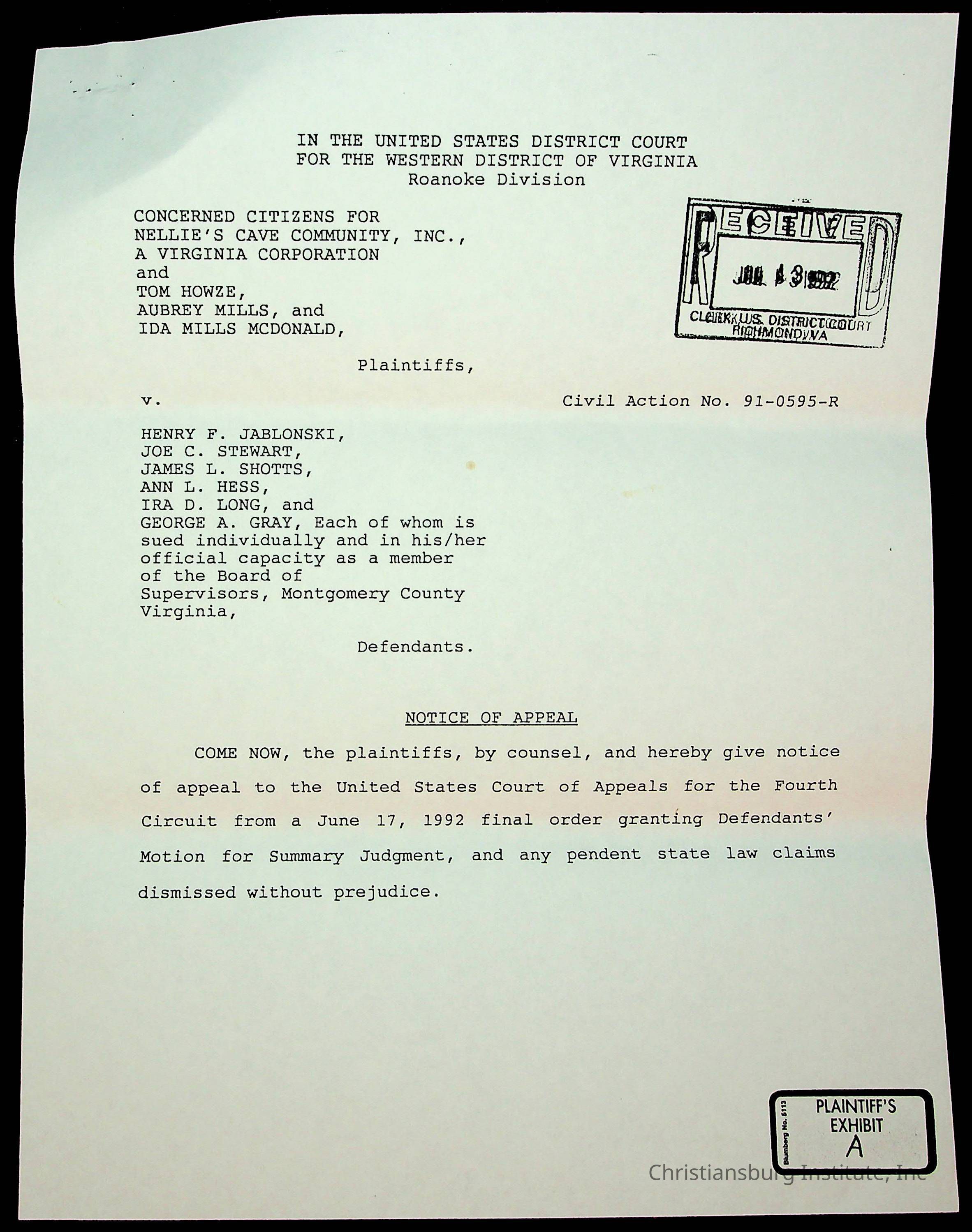 An archive of court documents in the case, concerned citizens for Nellies Cave community, Inc. versus the board of supervisors of Montgomery County, Virginia including the memorandum in opposition to the appellees' motion to dismiss the appeal for lack of jurisdiction, dated 1992.Collection