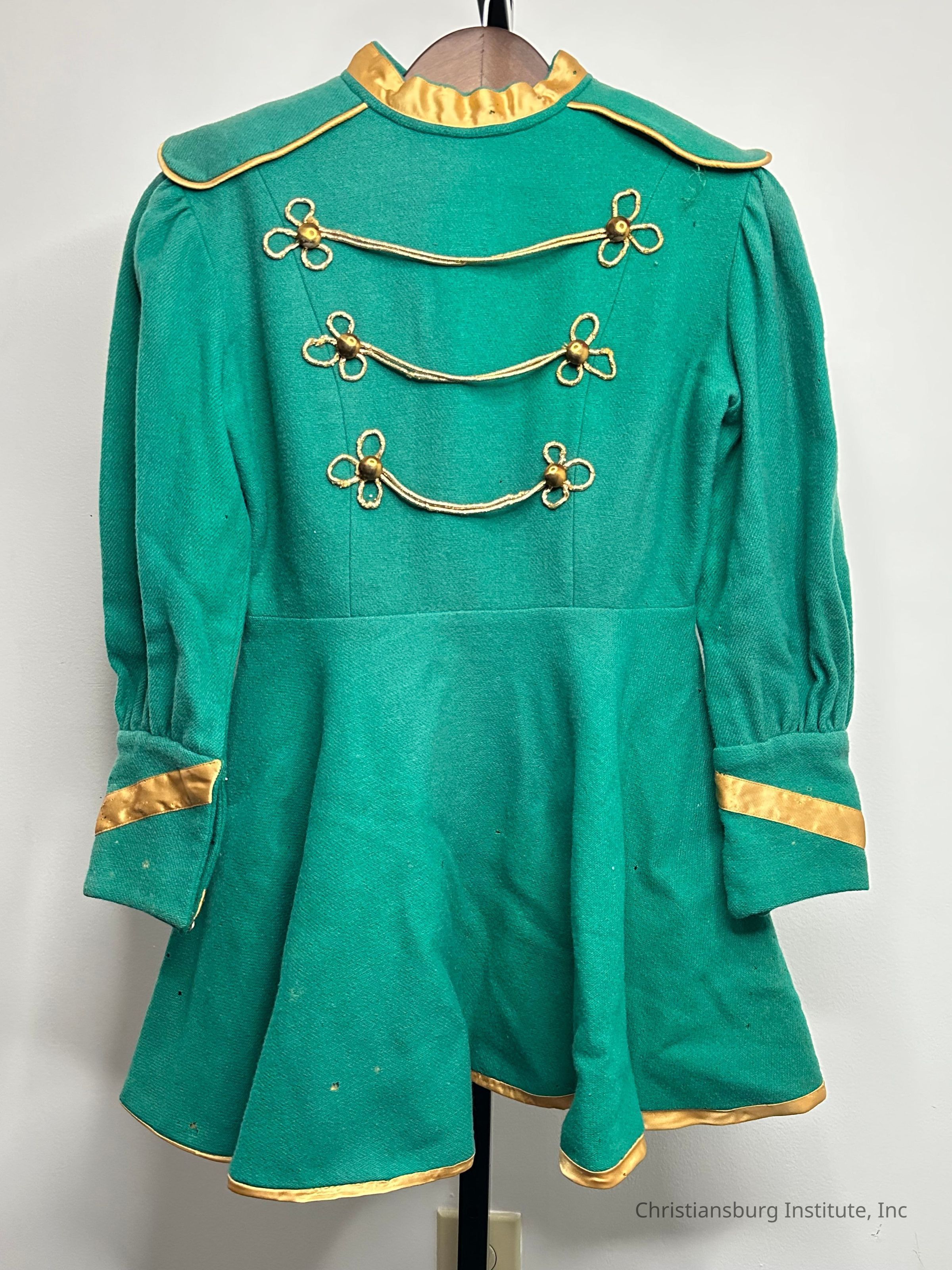 A green and gold Christiansburg Institute majorette uniform with a matching felt hat, undated.Collection