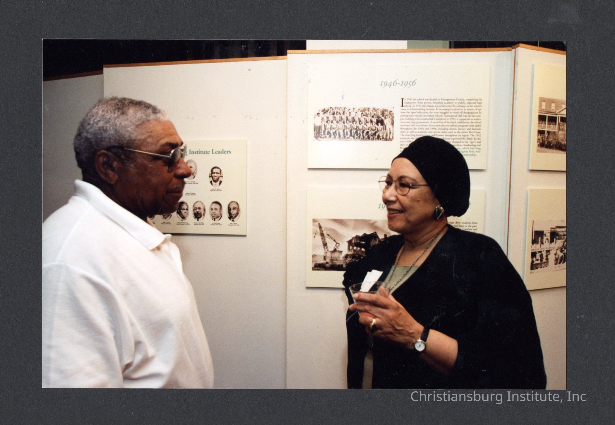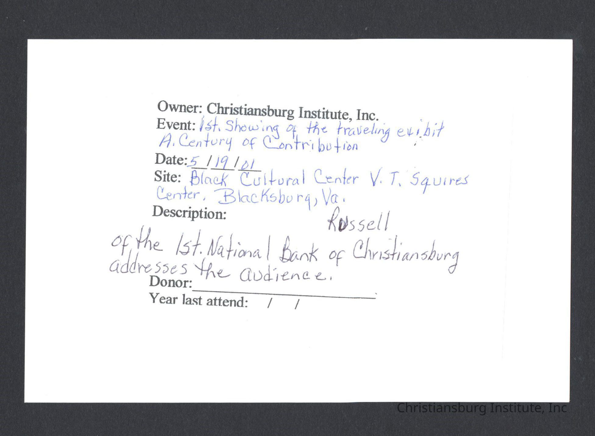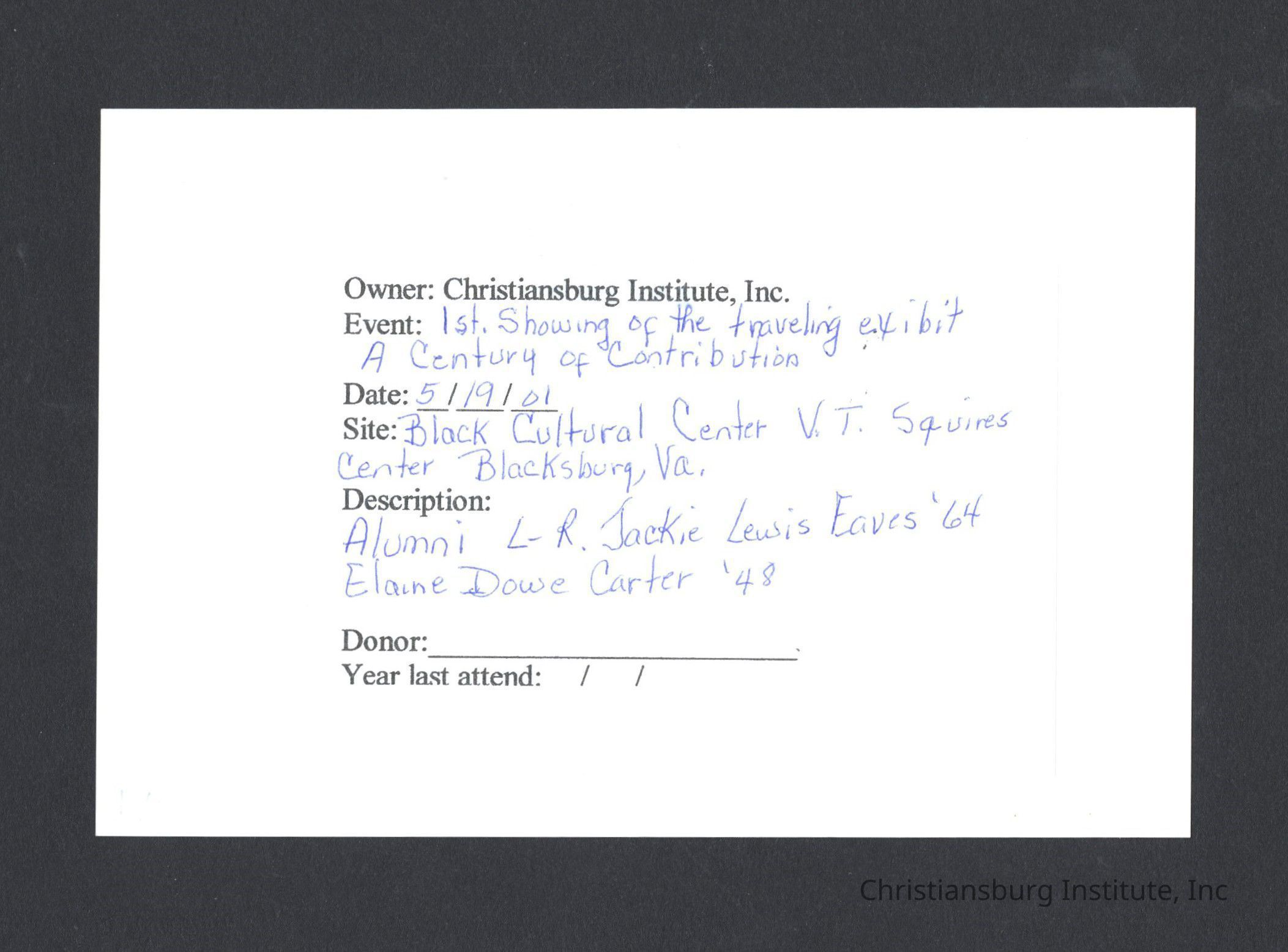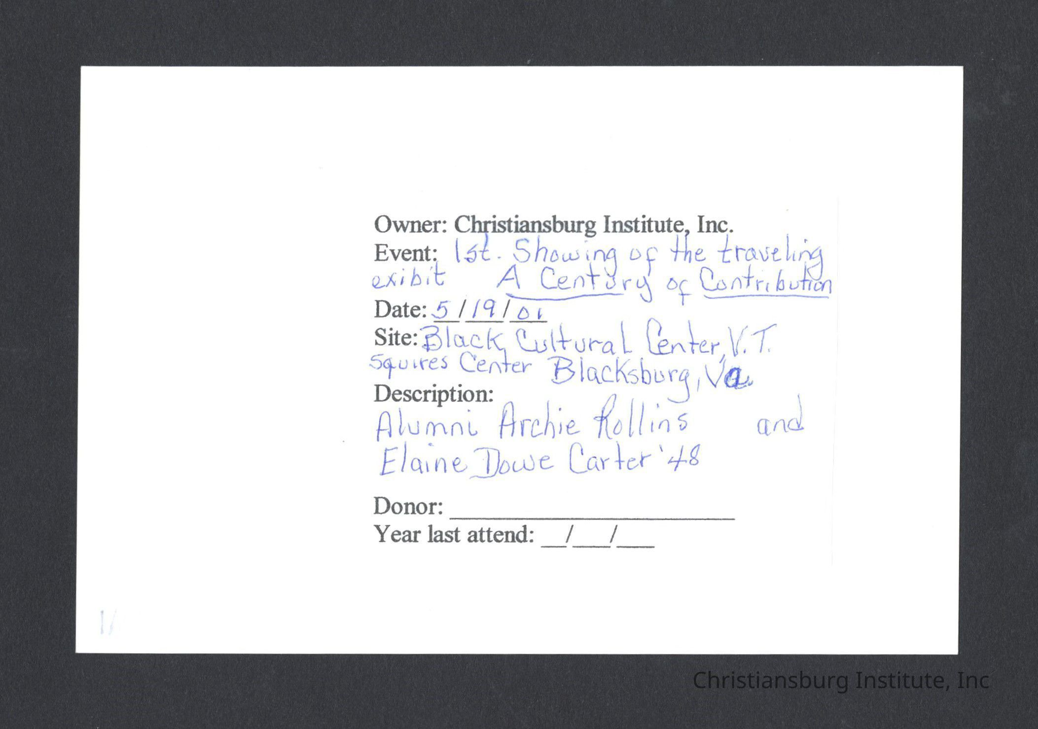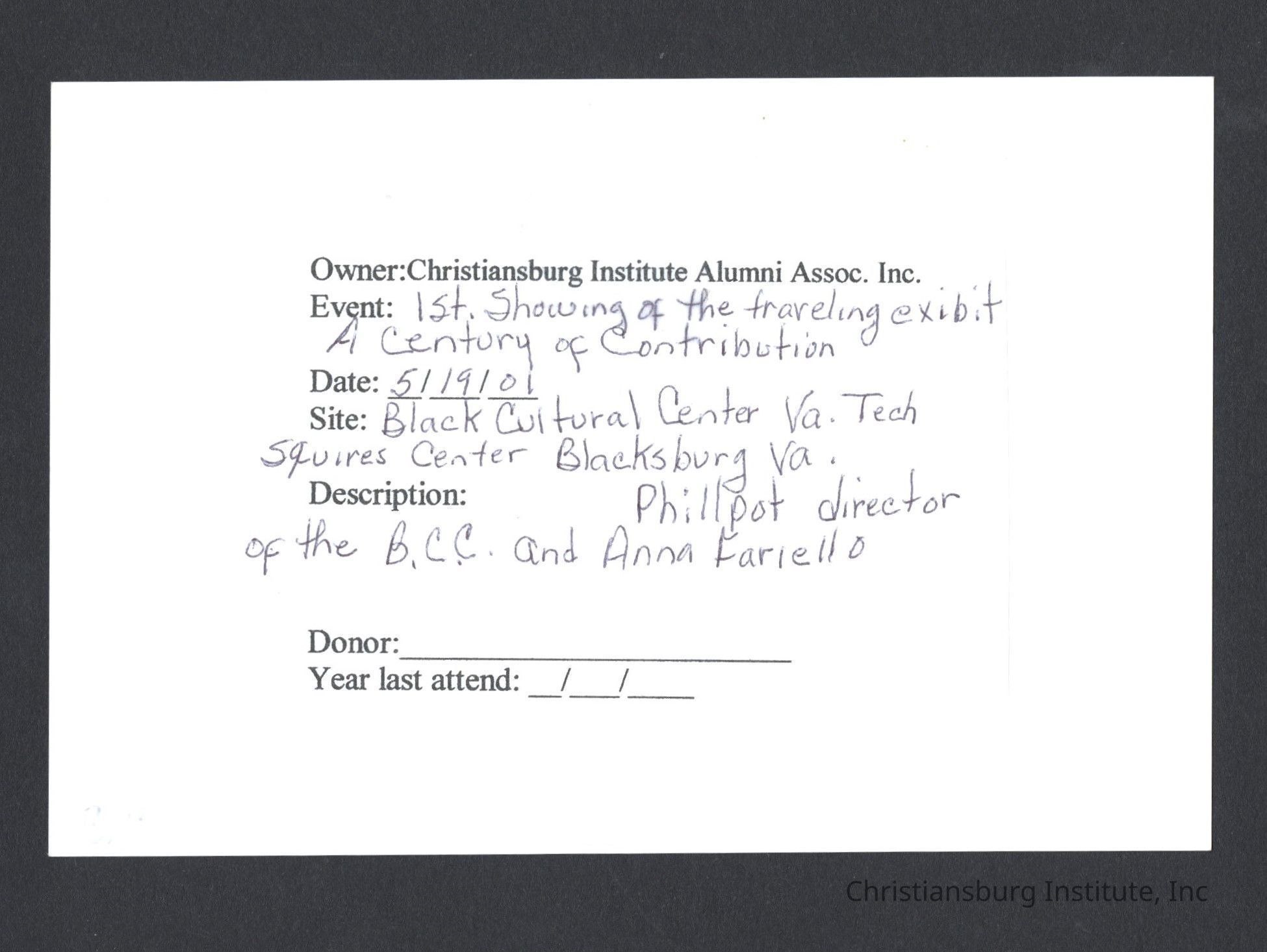 A series of photographs of the unveiling of the Century of Contribution exhibit at the Black Cultural Center at Virginia Tech, 2001.