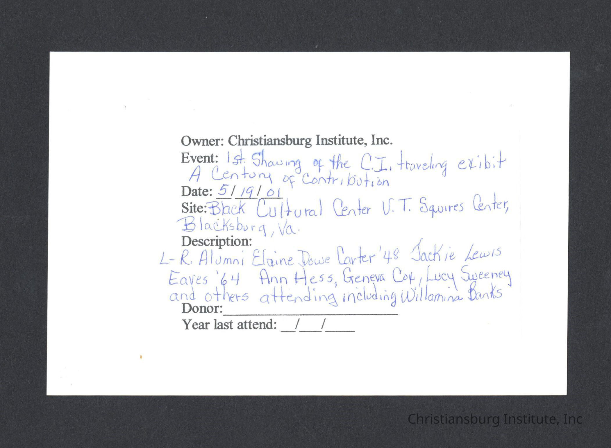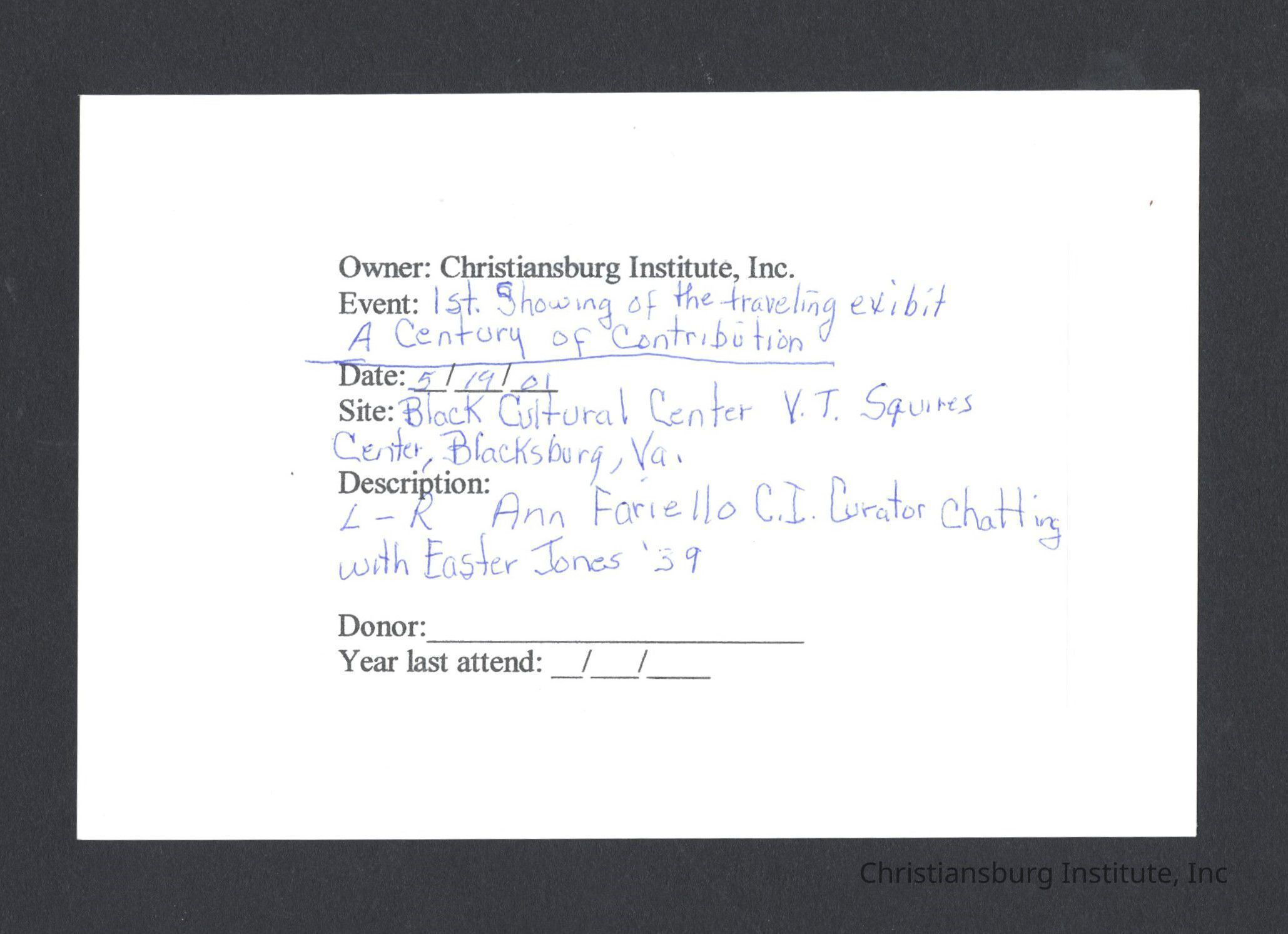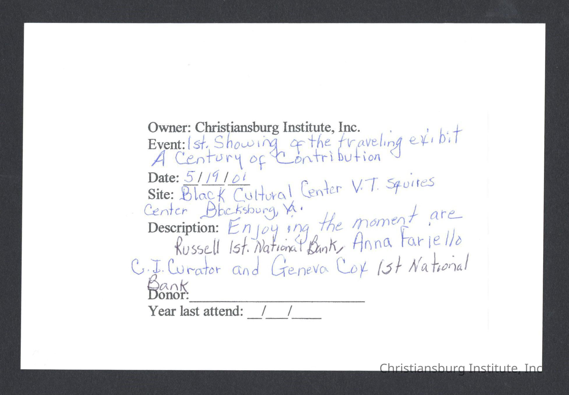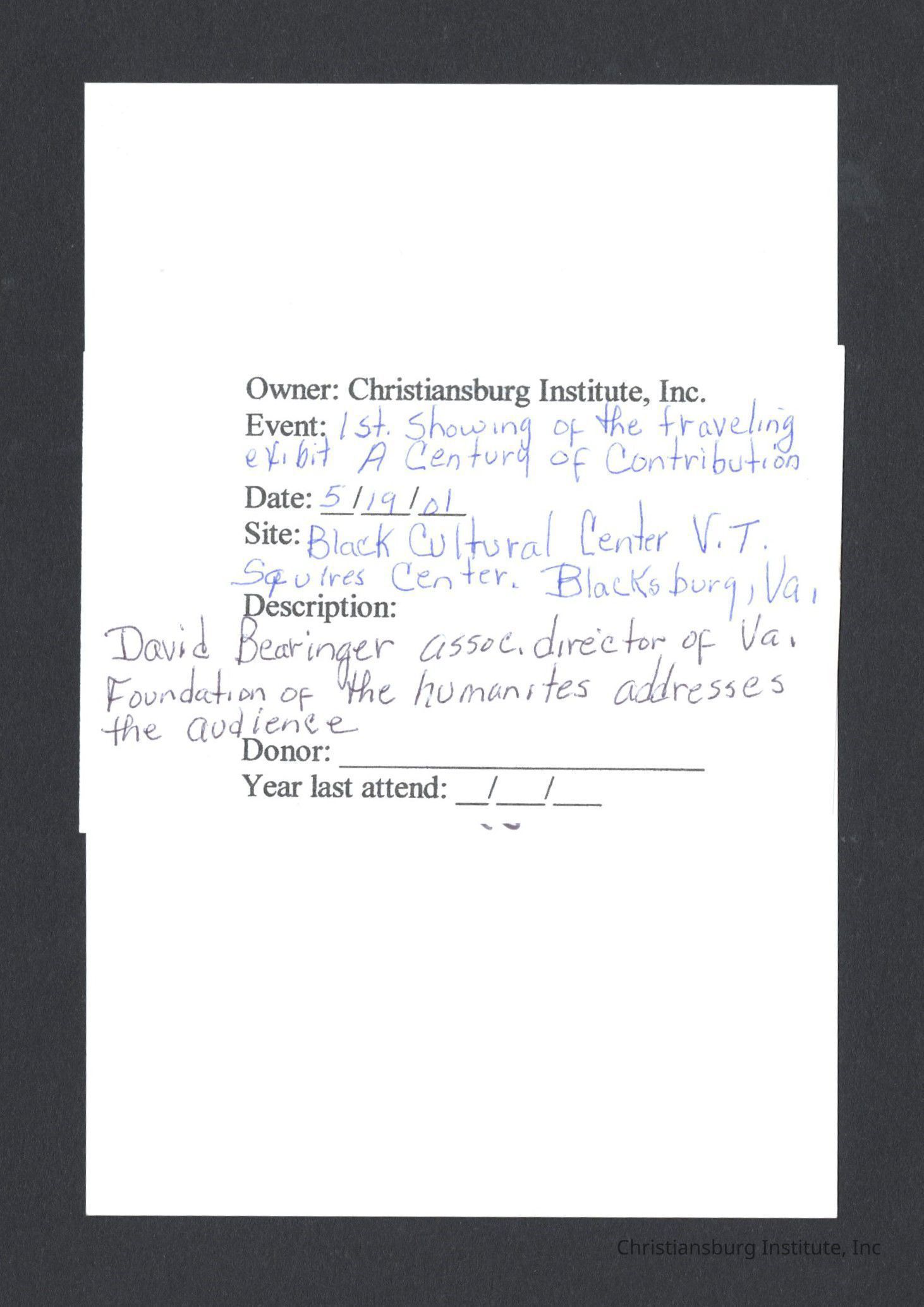 A series of photographs of the unveiling of the Century of Contribution exhibit at the Black Cultural Center at Virginia Tech, 2001.