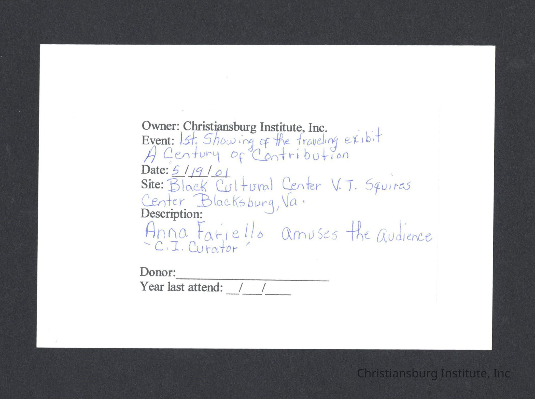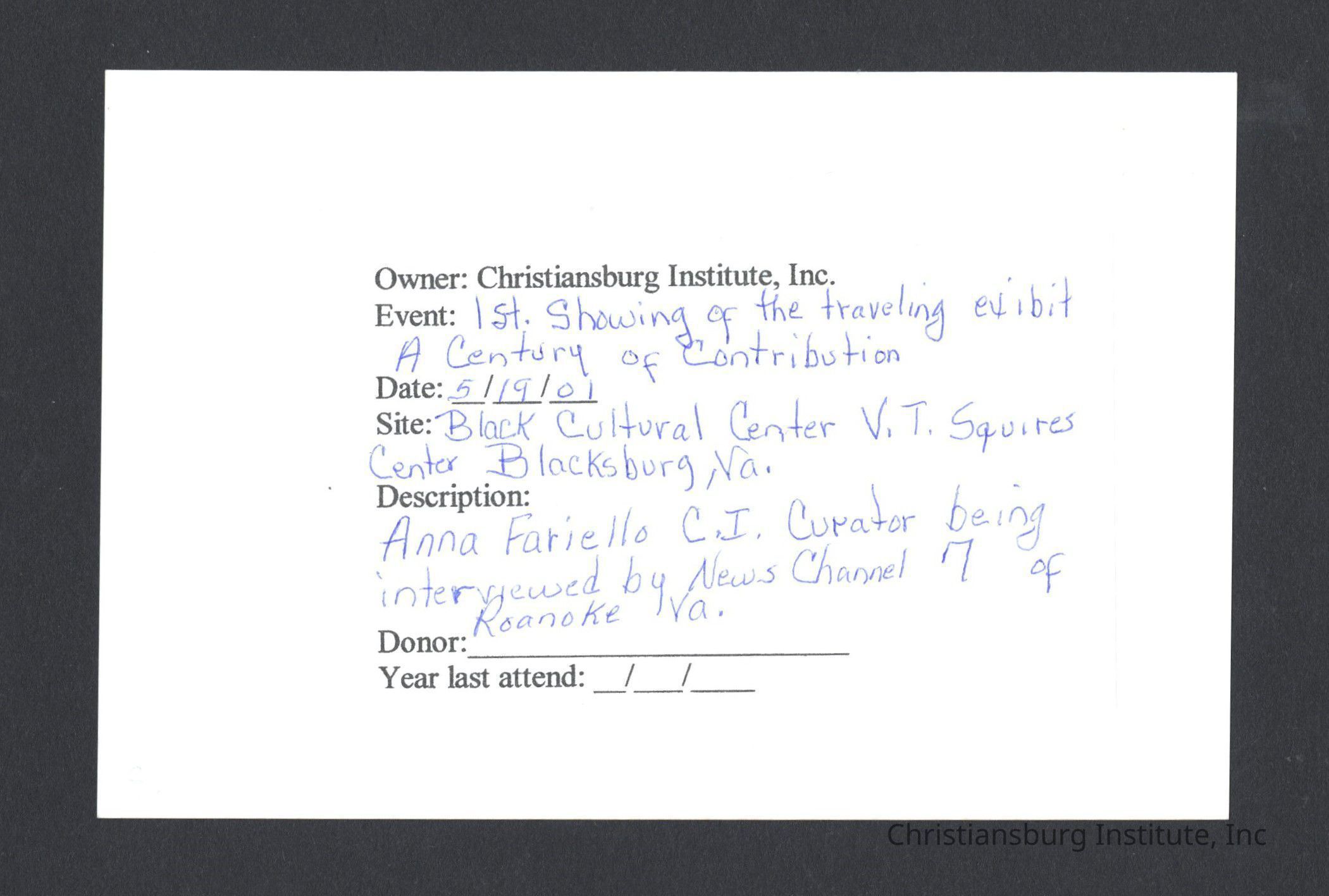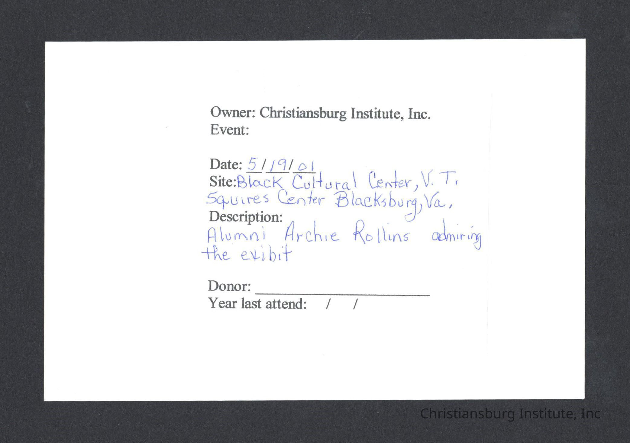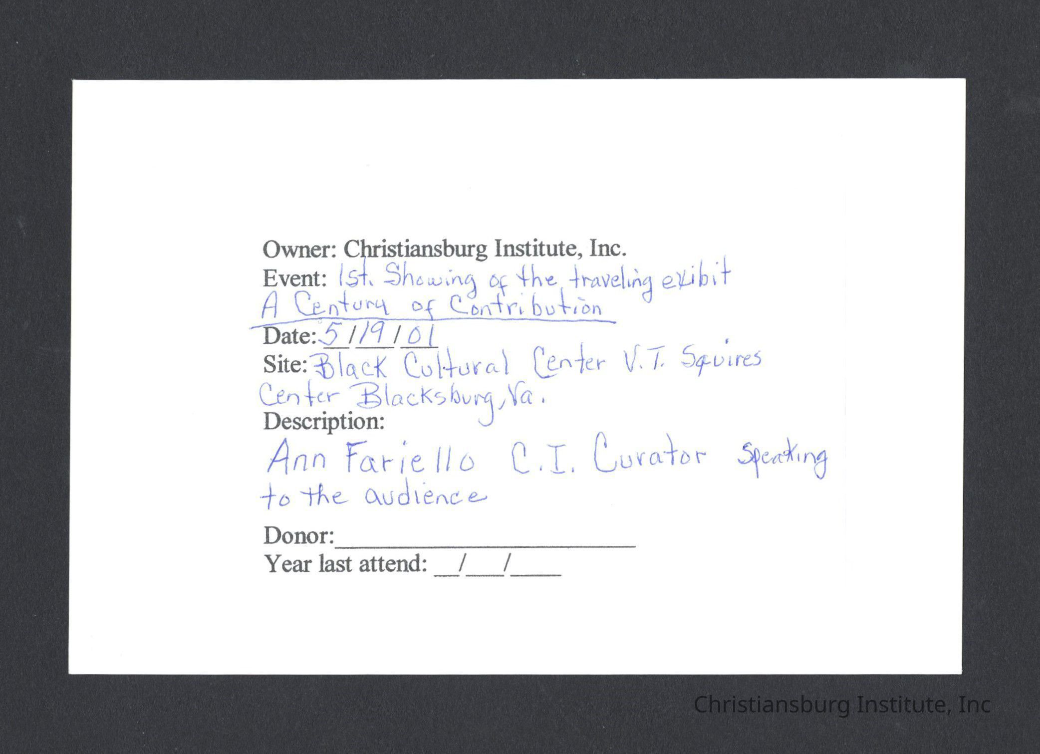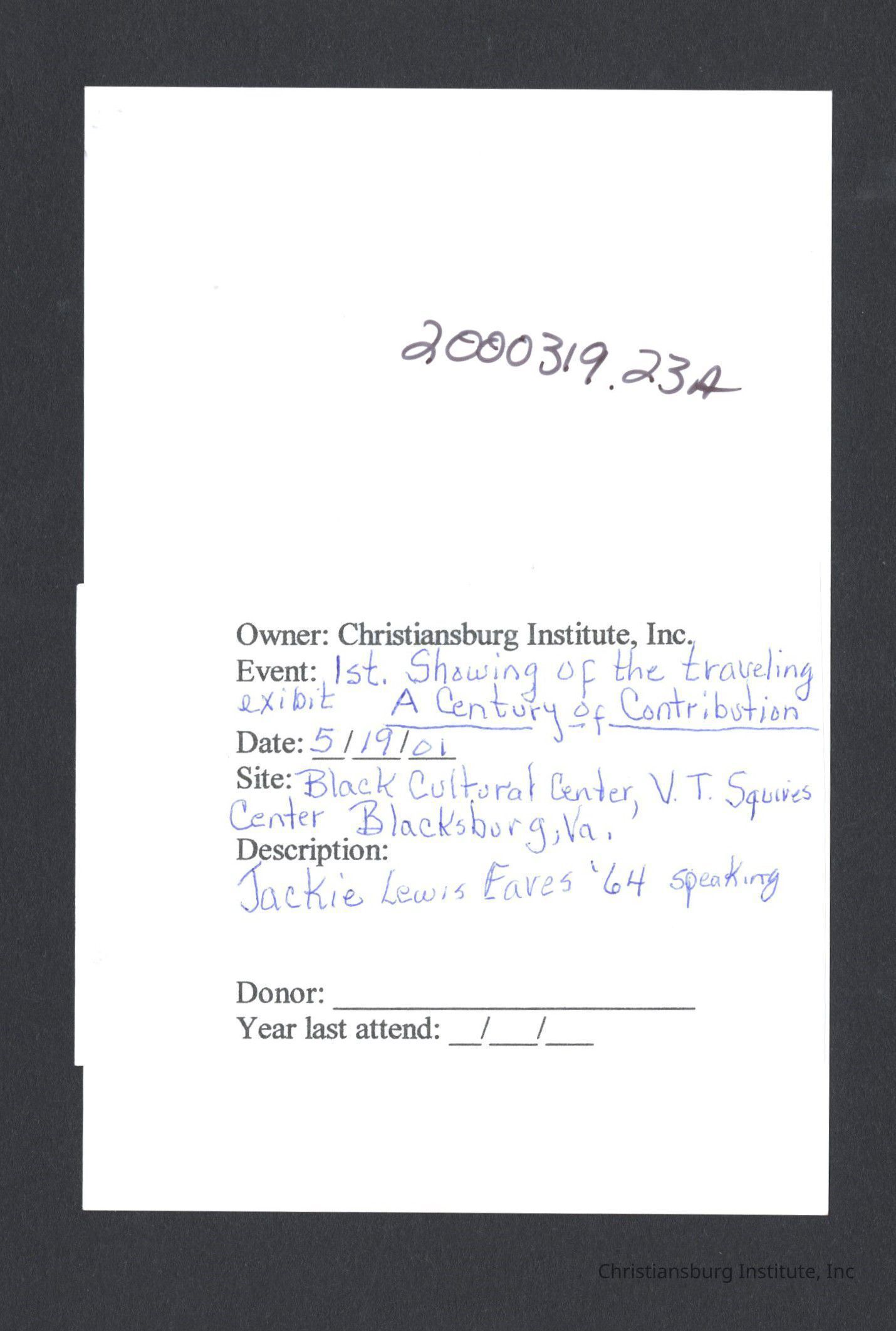 A series of photographs of the unveiling of the Century of Contribution exhibit at the Black Cultural Center at Virginia Tech, 2001.