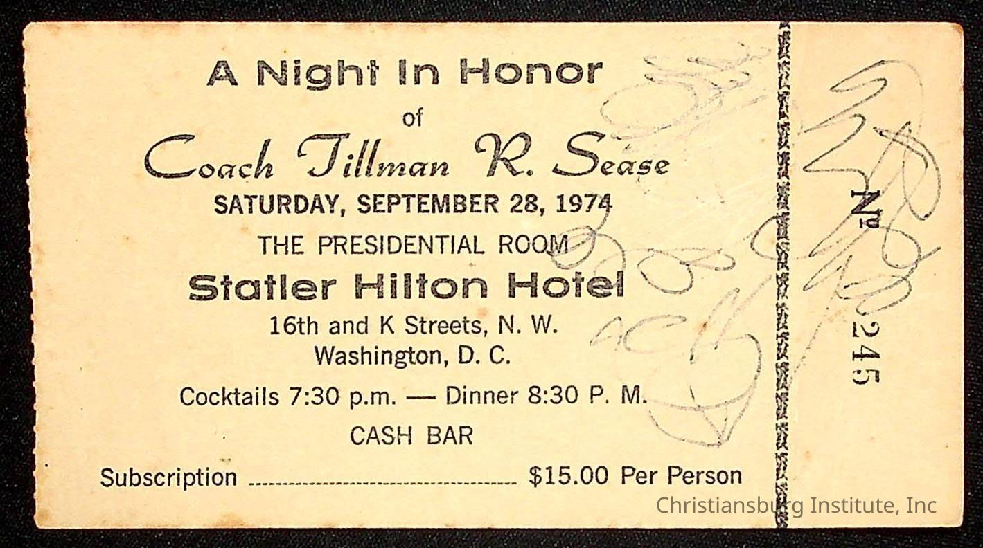 A ticket to the A Night In Honor of Coach Tillman R. Sease held at the Statler Hilton Hotel in Washington DC on September 28th, 1974.Collection